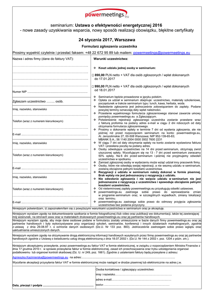 seminarium: Ustawa o efektywności energetycznej 2016 - nowe zasady uzyskiwania wsparcia, nowy sposób realizacji obowiązku, błękitne certyfikaty 24 stycznia 2017, Warszawa Formularz zgłoszenia uczestnika Prosimy wypełnić czytelnie i przesłać faksem: +48 22 672 95 89 lub mailem: [email protected] Nazwa i adres firmy (dane do faktury VAT): …………………………………………………………………….. …………………………………………………………………….. …………………………………………………………………….. …………………………………………………………………….. Numer NIP ............................................................................ Warunki uczestnictwa: Koszt udziału jednej osoby w seminarium: 890,00 PLN netto + VAT dla osób zgłoszonych / wpłat dokonanych do 17.01.2017 990,00 PLN netto + VAT dla osób zgłoszonych / wpłat dokonanych od 18.01.2017 Seminarium będzie prowadzone w języku polskim. Opłata za udział w seminarium obejmuje: uczestnictwo, materiały szkoleniowe, poczęstunek w trakcie seminarium typu: lunch, kawa, herbata, woda. Nadesłanie zgłoszenia jest jednocześnie zobowiązaniem do zapłaty. Podane Imię, nazwisko, stanowisko powyżej terminy oznaczają daty wpłat należności. Przesłanie wypełnionego formularza zgłoszeniowego stanowi zawarcie umowy …………………………………………………………………….. pomiędzy powermeetings.eu a Zgłaszającym. Potwierdzenie rejestracji zgłaszanego uczestnika zostanie przesłane wraz Telefon (wraz z numerem kierunkowym) z fakturą proforma na podany adres e-mail w ciągu 2 dni roboczych od daty otrzymania formularza zgłoszeniowego. …………………………………………………………………….. Prosimy o dokonanie wpłaty w terminie 7 dni od wysłania zgłoszenia, ale nie później niż przed rozpoczęciem seminarium na konto: powermeetings.eu, E-mail ...………………………………………………………….. Al. Jerozolimskie 27, 00-508 Warszawa; NIP 952-139-65-83; MBANK S.A.; 56 1140 2004 0000 3502 7600 2231 W ciągu 7 dni od daty otrzymania wpłaty na konto zostanie wystawiona faktura Imię, nazwisko, stanowisko VAT i przesłana pocztą na podany adres. …………………………………………………………………….. Osoby odwołujące uczestnictwo na 14 dni przed seminarium, otrzymają zwrot uiszczonej opłaty. Wycofującym się na 13 - 7 dni przed seminarium zwracamy Telefon (wraz z numerem kierunkowym) 50% opłaty. Na 6 dni przed seminarium i później nie przyjmujemy odwołań uczestnictwa w spotkaniu. …………………………………………………………………….. Zamiast zgłoszonej osoby w wydarzeniu może wziąć udział inny pracownik firmy. Osoby, które nie odwołają swojej rejestracji, a nie wezmą udziału w seminarium, E-mail ...………………………………………………………….. zostaną obciążone pełnymi kosztami uczestnictwa. Rezygnacji z udziału w seminarium należy dokonać w formie pisemnej. Brak wpłaty nie jest jednoznaczny z rezygnacją z udziału. Imię, nazwisko, stanowisko Nie odwołanie zgłoszenia i nie wzięcie udziału w seminarium nie jest jednoznaczne z rezygnacją z uczestnictwa i spowoduje obciążenie pełnymi …………………………………………………………………….. kosztami uczestnictwa. Od nieterminowej zapłaty powermeetings.eu przysługują odsetki ustawowe. Telefon (wraz z numerem kierunkowym) powermeetings.eu zastrzega sobie prawo do wprowadzania zmian w programie seminarium oraz, w szczególnych wypadkach, zmiany lokalizacji …………………………………………………………………….. oraz terminu. powermeetings.eu zastrzega sobie prawo do odmowy przyjęcia zgłoszenia E-mail ...………………………………………………………….. uczestnictwa bez podania przyczyny. Niniejszym potwierdzam, iż zapoznałem/łam się z powyższymi warunkami uczestnictwa w seminarium oraz je akceptuję. Zgłaszam uczestnictwo …….. osób. Niniejszym wyrażam zgodę na dokumentowanie spotkania w formie fotograficznej i/lub video oraz publikacji ww dokumentacji, także tej zawierającej mój wizerunek, na stronach www oraz w materiałach drukowanych powermeetings.eu oraz jej partnerów handlowych. Niniejszym wyrażam zgodę, aby moje dane osobowe podane w formularzu zostały umieszczone w bazie danych firmy powermeetings.eu oraz jej partnerów handlowych i były wykorzystywane przy organizacji szkoleń, seminariów, konferencji i innych działaniach marketingowych, zgodnie z ustawą z dnia 29.08.97 r. o ochronie danych osobowych (Dz.U. Nr 133 poz. 883). Jednocześnie zastrzegam sobie prawo wglądu oraz uaktualniania umieszczonych danych. Niniejszym wyrażam zgodę na otrzymywanie drogą elektroniczną informacji handlowych wysyłanych przez firmę powermeetings.eu oraz jej partnerów handlowych zgodnie z Ustawą o świadczeniu usług drogą elektroniczną z dnia 18.07.2002 r. (Dz.U. Nr 144 z 2002 r. poz. 1204 z późn. zm.). Niniejszym akceptujemy przesyłanie, przez powermeetings.eu faktur VAT w formie elektronicznej, w związku z rozporządzeniem Ministra Finansów z dnia 17 grudnia 2010 r. w sprawie przesyłania faktur w formie elektronicznej, zasad ich przechowywania oraz trybu udostępniania organowi podatkowemu lub organowi kontroli skarbowej (Dz. U. nr 249, poz. 1661). Zgodnie z ustaleniami faktury będą przesyłane z adresu: [email protected] na adres:...................................................................................................................... Wycofanie akceptacji przysyłania faktur VAT w formie elektronicznej może nastąpić w drodze pisemnej lub elektronicznie na adres j.w. Osoba kontaktowa / zgłaszający uczestnictwo: imię i nazwisko…………………………………