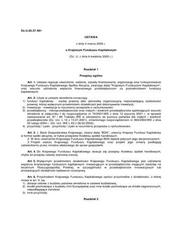 Dz.U.05.57.491 USTAWA z dnia 4 marca 2005 r. o Krajowym Funduszu Kapitałowym (Dz. U. z dnia 6 kwietnia 2005 r.) Rozdział 1 Przepisy ogólne Art. 1. Ustawa reguluje utworzenie, zadania, zasady finansowania, organizację oraz funkcjonowanie Krajowego Funduszu Kapitałowego Spółka Akcyjna, zwanego dalej "Krajowym Funduszem Kapitałowym", oraz warunki udzielania wsparcia finansowego przedsiębiorcom za pośrednictwem funduszy kapitałowych. Art. 2. UŜyte w ustawie określenia oznaczają: 1) fundusz kapitałowy - osobę prawną albo jednostkę organizacyjną nieposiadającą osobowości prawnej, której wyłącznym przedmiotem działalności jest dokonywanie inwestycji; 2) inwestycje - inwestycje w rozumieniu przepisów o rachunkowości; 3) przedsiębiorcy - mikroprzedsiębiorców oraz małych i średnich przedsiębiorców spełniających warunki określone w załączniku I do rozporządzenia nr 70/2001/WE z dnia 12 stycznia 2001 r. w sprawie zastosowania art. 87 i 88 Traktatu WE w odniesieniu do pomocy państwa dla małych i średnich przedsiębiorstw (Dz. Urz. L 10 z 13.01.2001), zmienionego rozporządzeniem nr 364/2004/WE z dnia 25 lutego 2004 r. (Dz. Urz. WE L 63 z 28.02.2004); 4) przychody i zyski - przychody i zyski w rozumieniu przepisów o rachunkowości. Art. 3. 1. Bank Gospodarstwa Krajowego, zwany dalej "BGK", utworzy Krajowy Fundusz Kapitałowy w formie spółki akcyjnej, w trybie przepisów Kodeksu spółek handlowych. 2. W dniu utworzenia Krajowego Funduszu Kapitałowego BGK będzie jedynym jego akcjonariuszem. 3. Projekt statutu Krajowego Funduszu Kapitałowego oraz projekt jego zmiany podlegają zatwierdzeniu przez ministra właściwego do spraw gospodarki. Art. 4. Do Krajowego Funduszu Kapitałowego stosuje się przepisy Kodeksu spółek handlowych, chyba Ŝe przepisy ustawy stanowią inaczej. Art. 5. Wyłącznym przedmiotem działalności Krajowego Funduszu Kapitałowego jest udzielanie wsparcia finansowego funduszom kapitałowym, inwestującym w przedsiębiorców mających siedzibę na terytorium Rzeczypospolitej Polskiej, w szczególności w przedsiębiorców innowacyjnych lub prowadzących działalność badawczo-rozwojową. Art. 6. Przychodami Krajowego Funduszu Kapitałowego oprócz przychodów z działalności, o której mowa w art. 5, są: 1) dotacje celowe z budŜetu państwa określone w ustawie budŜetowej; 2) środki pochodzące z budŜetu Unii Europejskiej oraz inne środki pochodzące ze źródeł zagranicznych, niepodlegające zwrotowi; 3) inne przychody. Rozdział 2 Organy Krajowego Funduszu Kapitałowego Art. 7. 1. Rada Nadzorcza Krajowego Funduszu Kapitałowego składa się z pięciu członków. 2. Minister właściwy do spraw gospodarki oraz minister właściwy do spraw nauki powołują po jednym członku Rady Nadzorczej. Ministrom tym przysługuje równieŜ odpowiednio uprawnienie do odwołania powołanego członka Rady Nadzorczej. 3. Członkowie Rady Nadzorczej są powoływani na okres wspólnej kadencji. Art. 8. 1. Organem doradczym Zarządu Krajowego Funduszu Kapitałowego do spraw opiniowania projektów, dla których ma być udzielone wsparcie finansowe, jest Komitet Inwestycyjny. 2. Komitet Inwestycyjny składa się z 5 członków. 3. Rada Nadzorcza Krajowego Funduszu Kapitałowego powołuje i odwołuje członków Komitetu Inwestycyjnego oraz uchwala jego regulamin. Regulamin określa w szczególności organizację Komitetu Inwestycyjnego, sposób wykonywania zadań, kwalifikacje członków Komitetu Inwestycyjnego, zasady ich wynagradzania oraz szczegółowy tryb wyłączenia, o którym mowa w art. 9 ust. 1. Art. 9. 1. Członek Komitetu Inwestycyjnego podlega wyłączeniu z opiniowania projektu funduszu kapitałowego, jeŜeli wspólnik, akcjonariusz, członek organu zarządzającego lub nadzorczego tego funduszu albo osoba prowadząca lub nadzorująca ten fundusz jest jego małŜonkiem, osobą pozostającą w faktycznym poŜyciu, krewnym, powinowatym do drugiego stopnia albo osobą związaną z nim z tytułu przysposobienia, opieki lub kurateli. 2. Powody wyłączenia, o których mowa w ust. 1, trwają takŜe po ustaniu uzasadniającego je małŜeństwa, przysposobienia, opieki lub kurateli. 3. Wyłączenia, o którym mowa w ust. 1, dokonuje, w drodze uchwały, Komitet Inwestycyjny na wniosek członka tego komitetu lub wniosek Zarządu albo członka Rady Nadzorczej Krajowego Funduszu Kapitałowego. W głosowaniu nie bierze udziału osoba, której to głosowanie dotyczy. Art. 10. Rada Nadzorcza moŜe zawiesić lub odwołać przed upływem kadencji członków Zarządu, którzy ponoszą odpowiedzialność za zawarcie przez Krajowy Fundusz Kapitałowy z funduszem kapitałowym, bez opinii Komitetu Inwestycyjnego, umowy o udzielenie wsparcia finansowego. Rozdział 3 Zasady i tryb udzielania wsparcia Art. 11. 1. Krajowy Fundusz Kapitałowy udziela wsparcia finansowego funduszom kapitałowym w formie: 1) obejmowania i nabywania ich udziałów lub akcji; 2) uczestniczenia w funduszach kapitałowych działających w formie spółek komandytowych, komandytowo-akcyjnych lub innych jednostek organizacyjnych nieposiadających osobowości prawnej; 3) nabywania ich certyfikatów inwestycyjnych lub jednostek uczestnictwa; 4) nabywania emitowanych przez nie obligacji, obligacji zamiennych na akcje, obligacji z prawem pierwszeństwa i warrantów subskrypcyjnych; 5) bezzwrotnych świadczeń na sfinansowanie części kosztów poniesionych przez fundusz kapitałowy na przygotowanie inwestycji i monitorowanie portfela tych inwestycji. 2. Wysokość wsparcia finansowego, o którym mowa w ust. 1 pkt 1-4, udzielonego przez Krajowy Fundusz Kapitałowy nie moŜe być wyŜsza od łącznej kwoty wpłat do funduszu kapitałowego zrealizowanych przez podmioty dokonujące inwestycji w takim funduszu. 3. Kwota bezzwrotnych świadczeń na sfinansowanie części kosztów, o których mowa w ust. 1 pkt 5, nie moŜe przekroczyć 65 % tych kosztów. 4. Kwoty środków przekazanych w ra