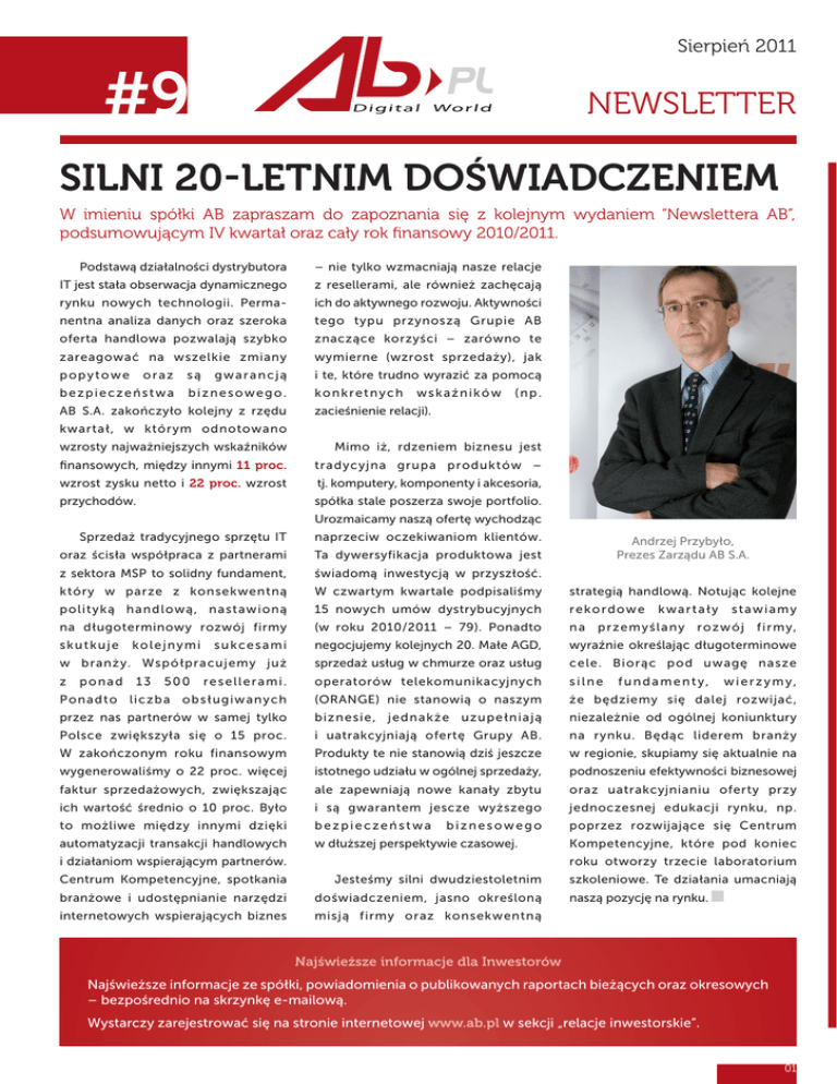 Sierpień 2011 #9 NEWSLETTER SILNI 20-LETNIM DOŚWIADCZENIEM W imieniu spółki AB zapraszam do zapoznania się z kolejnym wydaniem “Newslettera AB”, podsumowującym IV kwartał oraz cały rok finansowy 2010/2011. Podstawą działalności dystrybutora – nie tylko wzmacniają nasze relacje IT jest stała obserwacja dynamicznego z resellerami, ale również zachęcają rynku nowych technologii. Perma- ich do aktywnego rozwoju. Aktywności nentna analiza danych oraz szeroka tego typu przynoszą Grupie AB oferta handlowa pozwalają szybko znaczące korzyści – zarówno te zareagować na wszelkie zmiany wymierne (wzrost sprzedaży), jak popytowe i te, które trudno wyrazić za pomocą oraz bezpieczeństwa są gwarancją biznesowego. AB S.A. zakończyło kolejny z rzędu konkretnych wskaźników (np. zacieśnienie relacji). kwartał, w którym odnotowano wzrosty najważniejszych wskaźników Mimo iż, rdzeniem biznesu jest finansowych, między innymi 11 proc. tradycyjna grupa produktów – wzrost zysku netto i 22 proc. wzrost tj. komputery, komponenty i akcesoria, przychodów. spółka stale poszerza swoje portfolio. Urozmaicamy naszą ofertę wychodząc Sprzedaż tradycyjnego sprzętu IT naprzeciw oczekiwaniom klientów. oraz ścisła współpraca z partnerami Ta dywersyfikacja produktowa jest z sektora MSP to solidny fundament, świadomą inwestycją w przyszłość. który w parze z konsekwentną W czwartym kwartale podpisaliśmy strategią handlową. Notując kolejne polityką handlową, nastawioną 15 nowych umów dystrybucyjnych rekordowe na długoterminowy rozwój firmy (w roku 2010/2011 – 79). Ponadto n a p r z e m y ś l a n y r o z w ó j f i r m y, skutkuje kwartały stawiamy sukcesami negocjujemy kolejnych 20. Małe AGD, wyraźnie określając długoterminowe w branży. Współpracujemy już sprzedaż usług w chmurze oraz usług cele. Biorąc pod uwagę nasze z ponad kolejnymi Andrzej Przybyło, Prezes Zarządu AB S.A. resellerami. operatorów telekomunikacyjnych silne Ponadto liczba obsługiwanych 13 500 (ORANGE) nie stanowią o naszym że będziemy się dalej rozwijać, przez nas partnerów w samej tylko b i z n e s i e , j e d n a k że u z u p e ł n i a j ą niezależnie od ogólnej koniunktury Polsce zwiększyła się o 15 proc. i uatrakcyjniają ofertę Grupy AB. na rynku. Będąc liderem branży W zakończonym roku finansowym Produkty te nie stanowią dziś jeszcze w regionie, skupiamy się aktualnie na wygenerowaliśmy o 22 proc. więcej istotnego udziału w ogólnej sprzedaży, podnoszeniu efektywności biznesowej faktur sprzedażowych, zwiększając ale zapewniają nowe kanały zbytu oraz uatrakcyjnianiu oferty przy ich wartość średnio o 10 proc. Było i są gwarantem jescze wyższego jednoczesnej edukacji rynku, np. to możliwe między innymi dzięki bezpieczeństwa poprzez rozwijające się Centrum automatyzacji transakcji handlowych w dłuższej perspektywie czasowej. biznesowego fundamenty, wierzymy, Kompetencyjne, które pod koniec roku otworzy trzecie laboratorium i działaniom wspierającym partnerów. Centrum Kompetencyjne, spotkania Jesteśmy silni dwudziestoletnim branżowe i udostępnianie narzędzi doświadczeniem, jasno określoną internetowych wspierających biznes misją firmy oraz konsekwentną szkoleniowe. Te działania umacniają naszą pozycję na rynku. Najświeższe informacje dla Inwestorów Najświeższe informacje ze spółki, powiadomienia o publikowanych raportach bieżących oraz okresowych – bezpośrednio na skrzynkę e-mailową. Wystarczy zarejestrować się na stronie internetowej www.ab.pl w sekcji „relacje inwestorskie”. 01 NEWSLETTER #9 REKORDOWE WYNIKI GRUPY AB W okresie czterech kwartałów roku finansowego 2010/2011 Grupa AB odnotowała dynamiczny wzrost przychodów, marż i zysku netto. Konsekwentne strategii oraz wykorzystywanie efektu synergii w grupie kapitałowej owocuje wzrostem dynamicznym sprzedaży. Po czterech kwartałach Przychody ze sprzedaży realizowanie roku obrotowego 2010/2011 Grupa zanotowała wzrost zysku netto o 47 proc. w porównaniu 3 600 000 3 000 000 2 400 000 1 800 000 do analogicznego okresu ubiegłego 1 200 000 roku. Dynamiczny wzrost wyniku 600 000 f i n a n s o w e g o p oz w o l i ł u z y s k a ć 3 564 359 poprawę wskaźników rentowności. +24% 2 882 109 2009/2010 Rentowność netto za cztery kwartały 2010/2011 wyniosła 1,4 proc. w porównaniu do 1,2 proc. w porównywalnym okresie. Również Zysk netto rentowność kapitału własnego (ROE) wzrosła 54 000 z 11,25 proc. do 15,91 proc., zaś 45 500 wskaźnik rentowności aktywów (ROA) uplasował się na poziomie 5,7 proc. wobec 4,5 proc. w analogicznym okresie ubiegłego roku. 51 662 36 000 27 000 +47% 35 160 18 000 Spółki Grupy AB osiągają wymierne korzyści ekonomiczne 9 000 poprzez konsekwentne uzupełnianie oferty o nowe produkty i dostawców, 2009/2010 2010/2011 korzystając z najlepszych praktyk wypracowywanych w ramach wymiany Wszystkie dane w tysiącach złotych doświadczeń, jak też korzystając z ekonomii skali działania. W efekcie 02 powyższego, wzrost przychodów Istotnym wskaźnikiem obrazującym ze sprzedaży za cztery kwartały sprawność skutecznego i efektywnego AB realizowany jest w sposób r o k u w y n i ó s ł b l i s ko 24 p r o c . działania organizacji w każdych zrównoważony. Analizując wskaźniki w porównaniu do Dynamiczny wzrost Grupy ubiegłego warunkach makroekonomicznych jest płynności czy zadłużenia widać, że roku obrotowego, a przychody wskaźnik kosztów SG&A (stosunek pomimo wzrostu obrotów prawie osiągnęły poziom 3 564 mln zł. kosztów sprzedaży i ogólnego o 1/4, wskaźnik płynności bieżącej Dyscyplina kosztowa, nieodzowna zarządu do przychodów ze sprzedaży). uległ poprawie z 1,26 do 1,3, zaś przy efektywnym zarządzaniu dużą Grupa od lat utrzymuje go na jednym zadłużenie pozostało niemal na organizacją, skuteczne i efektywne z najniższych poziomów w