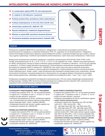 INTELIGENTNE, UNIWERSALNE KONDYCJONERY SYGNAŁÓW 2 x uniwersalne wejścia RTD, TC, mV, potencjometr 2 x wyjście V, mA (aktywne / pasywne) Funkcje przetwornika, powielacza, bloku matematyczn. Funkcje matematyczne: A i B, A+B, A-B, A lub B i inne Uniwersalne zasilanie 20...240V AC / DC Montaż na szynie DIN, szerokość obudowy 22,5mm W dostawie bezpłatne oprogramowanie i kabelek USB SEM1720 Wysoka dokładność i stabilność długoterminowa OGÓLNE Kondycjonery sygnałów SEM1720 są 2-kanałowymi, inteligentnymi i uniwersalnymi przyrządami pomiarowymi, przeznaczonymi do współpracy z czujnikami temperatury RTD, TC, sygnałami mV lub potencjometrem. Inteligentna i cyfrowa technologia przetwarzania zapewnia wysoką dokładność pomiaru, swobodną konfigurację typu czujnika, zakresu i typu sygnału wyjściowego, możliwość wprowadzenia profilu temperatury, wybór trybu pracy kondycjonera i wiele innych. Elastyczność kondycjonerów umożliwia współpracę z czujnikami rezystancyjnymi RTD (Pt100, Ni100, Ni120, Cu53, Cu100), termoelektrycznymi TC (K, J, E, N, T, R, S, L, U, B, C, D, G), sygnałem mV (-205...+205mV) oraz potencjometrem do 100kΩ. Kondycjonery oferują na wyjściu izolowany sygnał analogowy V (nastawa w zakresie 0...10,1V) lub mA (nastawa w zakresie 0...21,5mA) w trybie aktywnym lub pasywnym. Podsumowaniem uniwersalności kondycjonerów SEM1720 jest elastyczne zasilanie AC/DC w zakresie 20...240VAC/DC oraz wybór trybu pracy jako przetwornik temperatury 2-kanałowy, przetwornik 1-kanałowy z dwoma wyjściami analogowymi w trybie powielacza wartości mierzonej lub bloku funkcji matematycznych. Każde z wejść / wyjść kondycjonera jest niezależnie konfigurowalne przez użytkownika, oferując różnorodność kombinacji i niezwykłą elastyczność w dostosowaniu do wymaganej aplikacji. Kondycjonery posiadają pełną izolację galwaniczną, oddzielając między sobą wszystkie porty podłączenia (wej.1 / wej.2 / wyj.1 / wyj.2 / zasil.). Konfiguracja wymaganych parametrów kondycjonera wykonywana jest z PC przy użyciu bezpłatnego oprogramowania konfiguracyjnego i kabelka USB. Na froncie obudowy kondycjonera znajdują się dwa wskaźniki LED, przeznaczone do sygnalizacji stanu prawidłowej pracy każdego z kanałów pomiarowych. TRYBY PRACY / FUNKCJE SEM1720 POWIELACZ WARTOŚCI MIERZONEJ (1 wej -> 2 wyj.) •1 wejście dla czujników RTD, TC, mV lub potencjometrów •2 wyjścia mA / V (nastawa w zakr. 0...21,5mA / 0...10,1V) •wyjście mA jako aktywne / pasywne •możliwość wprowadzenia do 22 pkt. profilowania sygnału •pełna separacja wejść / wyjść / zasilania (4kVAC) •konfiguracja tłumienia dla wzrostu i spadku sygnału wyj. •uniwersalne zasilanie 20...240VAC/DC BLOK FUNKCJI MATEMATYCZNYCH •2 wejścia dla czujników RTD, TC, mV lub potencjometrów •2 wyjścia mA / V (nastawa w zakr. 0...21,5mA / 0...10,1V) •wyjście mA jako aktywne / pasywne •możliwość wprowadzenia do 22 pkt. profilowania sygnału •wybór funkcji matematycznej: przypisanie wejścia dla wybranego wyj. (IN1 lub IN2); suma (IN1 + IN2), różnica (IN1 - IN2); IN1 - gdy błąd ustaw IN2; IN2 - gdy błąd ustaw IN1; IN1 - gdy błąd ustaw SP1; IN2 - gdy błąd ustaw SP2; najwyższa lub najniższa wartość sygnału (IN1 lub IN2); wartość średnia (IN1 i IN2); stała wartość sygnału wyjścia (IN1<SP1) lub (IN1>SP1) = CH1 w innym przypadku IN2; (IN2<SP2) lub (IN2>SP2) = CH2 w innym przypadku IN1; (niezależna konfiguracja każdego wyjścia / kanału) •pełna separacja wejść / wyjść / zasilania (4kVAC) •konfiguracja tłumienia dla wzrostu i spadku sygnału wyj. •uniwersalne zasilanie 20...240VAC/DC Przedstawicielstwo w Polsce: NEGELAP-Automatyka • ul. Kukułek 26 • 41-200 Sosnowiec Tel./Fax.: (+48 32) 299 51 22; 299 62 69; 290 65 77 http://www.negelap.com • e-mail: [email protected] 5 lat gwarancji 2-KANAŁOWY PRZETWORNIK TEMP. / POŁOŻENIA •2 wejścia dla czujników RTD, TC, mV lub potencjometrów •2 wyjścia mA / V (nastawa w zakr. 0...21,5mA / 0...10,1V) •wyjście mA jako aktywne / pasywne •możliwość wprowadzenia do 22 pkt. profilowania sygnału (np. charakterystyka dla aplikacji regulacji przepustnicą) •pełna separacja wejść / wyjść / zasilania (4kVAC) •konfiguracja tłumienia dla wzrostu i spadku sygnału wyj. •uniwersalne zasilanie 20...240VAC/DC INTELIGENTNE, UNIWERSALNE KONDYCJONERY SYGNAŁÓW SPECYFIKACJA 5 lat gwarancji SEM1720 WEJŚCIE RTD (kanał 1 i 2) Typ wejścia i zakres Pt100, (IEC) Pt100, (IPTS-68) Pt100, (IPTS-68) Pt100, (ITS-90) Cu53 Cu100, (0.00427) Ni100, (0.00618) Ni120, (0.00672) Podłączenie Min. szerokość zakresu*1 Linearyzacja Dokładność*2 Błąd temperaturowy Pobudzenie prądowe Rezystancja połączenia (skutek max.) -200...+850oC (IEC; 0.003851) -200...+630oC (IPTS68; 0.00391) -200...+630oC (IPTS68; 0.00392) -200...+960oC (ITS68; 0.00393) -50...+180oC -80...+260oC -60...+180oC -80...+260oC 2- lub 3-przew. 25oC BS EN 60751 / IEC 751 / IPTS-68 / DIN itp. zależnie od typu czujnika 0,15oC ±0,05% rdg. ±0,015%FSR/oC <450µA <20Ω na odcinek 0,002oC/Ω WEJŚCIE TC, mV (kanał 1 i 2) Typ wejścia i zakres*3 mV K, NiCr-NiAl J, Fe-CuNi E, NiCr-CuNi N, NiCrSi-NiSi T, Cu-CuNi R, PtRh13-Pt S, PtRh10-Pt -205...+205mV -200...+1370oC -100...+1200oC -200...+1000oC -180...+1300oC -200...+400oC 0...1760oC 0...1760oC L, Fe-CuNi U, Cu-CuNi B, PtRh30-PtRh6 C, (W5Re-W26Re) D, (W3Re-W25Re) G, (W-26Re) Min. szerokość zakresu*1 Linearyzacja TC mV Dokładność*2 TC mV Błąd zimnych końców Śledzenie zimnych końców Zakres zimnych końców Błąd temperaturowy -100...+600oC 0...600oC 0...1600oC 0...2300oC 0...2300oC 0...2300oC 50oC WEJŚCIE wspólne (kanał 1 i 2) Konfiguracja Próbkowanie Czas odpowiedzi Offset użytkownika Profilowanie czujnika Funkcja stałej wartości każdy kanał ustawialny niezależnie co 200ms <400ms do 95% wartości zakresu ±10oC opcja profilowania czujnika przez użytkownika, 2...22pk