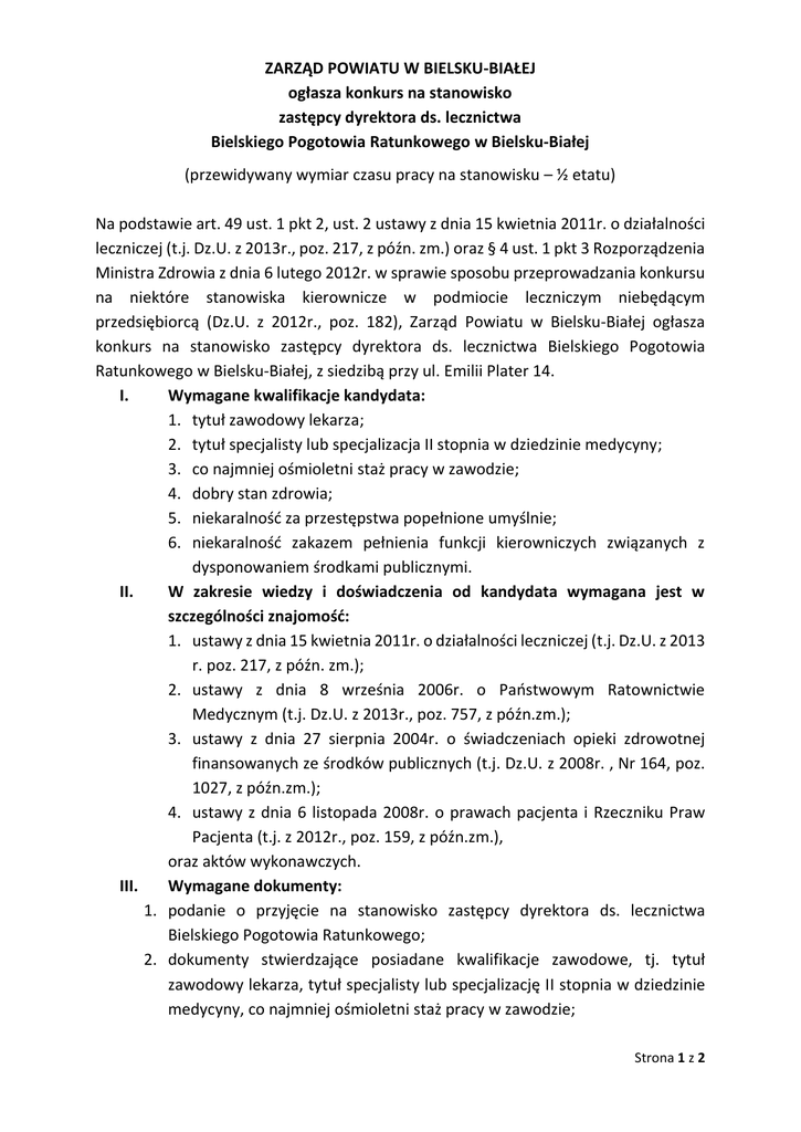 ZARZĄD POWIATU W BIELSKU-BIAŁEJ ogłasza konkurs na stanowisko zastępcy dyrektora ds. lecznictwa Bielskiego Pogotowia Ratunkowego w Bielsku-Białej (przewidywany wymiar czasu pracy na stanowisku – ½ etatu) Na podstawie art. 49 ust. 1 pkt 2, ust. 2 ustawy z dnia 15 kwietnia 2011r. o działalności leczniczej (t.j. Dz.U. z 2013r., poz. 217, z późn. zm.) oraz § 4 ust. 1 pkt 3 Rozporządzenia Ministra Zdrowia z dnia 6 lutego 2012r. w sprawie sposobu przeprowadzania konkursu na niektóre stanowiska kierownicze w podmiocie leczniczym niebędącym przedsiębiorcą (Dz.U. z 2012r., poz. 182), Zarząd Powiatu w Bielsku-Białej ogłasza konkurs na stanowisko zastępcy dyrektora ds. lecznictwa Bielskiego Pogotowia Ratunkowego w Bielsku-Białej, z siedzibą przy ul. Emilii Plater 14. I. Wymagane kwalifikacje kandydata: 1. tytuł zawodowy lekarza; 2. tytuł specjalisty lub specjalizacja II stopnia w dziedzinie medycyny; 3. co najmniej ośmioletni staż pracy w zawodzie; 4. dobry stan zdrowia; 5. niekaralność za przestępstwa popełnione umyślnie; 6. niekaralność zakazem pełnienia funkcji kierowniczych związanych z dysponowaniem środkami publicznymi. II. W zakresie wiedzy i doświadczenia od kandydata wymagana jest w szczególności znajomość: 1. ustawy z dnia 15 kwietnia 2011r. o działalności leczniczej (t.j. Dz.U. z 2013 r. poz. 217, z późn. zm.); 2. ustawy z dnia 8 września 2006r. o Państwowym Ratownictwie Medycznym (t.j. Dz.U. z 2013r., poz. 757, z późn.zm.); 3. ustawy z dnia 27 sierpnia 2004r. o świadczeniach opieki zdrowotnej finansowanych ze środków publicznych (t.j. Dz.U. z 2008r. , Nr 164, poz. 1027, z późn.zm.); 4. ustawy z dnia 6 listopada 2008r. o prawach pacjenta i Rzeczniku Praw Pacjenta (t.j. z 2012r., poz. 159, z późn.zm.), oraz aktów wykonawczych. III. Wymagane dokumenty: 1. podanie o przyjęcie na stanowisko zastępcy dyrektora ds. lecznictwa Bielskiego Pogotowia Ratunkowego; 2. dokumenty stwierdzające posiadane kwalifikacje zawodowe, tj. tytuł zawodowy lekarza, tytuł specjalisty lub specjalizację II stopnia w dziedzinie medycyny, co najmniej ośmioletni staż pracy w zawodzie; Strona 1 z 2 3. inne dokumenty, w szczególności potwierdzające dorobek i kwalifikacje zawodowe kandydata; 4. kwestionariusz osobowy z opisanym przebiegiem pracy zawodowej; 5. koncepcja pracy na stanowisku objętym konkursem; 6. zaświadczenie o niekaralności za przestępstwa popełnione umyślnie; 7. oświadczenie o niekaralności zakazem pełnienia funkcji kierowniczych związanych z dysponowaniem środkami publicznymi; 8. zaświadczenie lekarskie stwierdzające brak przeciwwskazań do podjęcia pracy na tym stanowisku; 9. oświadczenie o zachowaniu w tajemnicy informacji uzyskanych w związku z uczestnictwem w konkursie; 10. pisemna zgoda na udostępnienie i przetwarzanie danych osobowych; w celach przeprowadzenia postępowania konkursowego na stanowisko zastępcy dyrektora ds. lecznictwa Bielskiego Pogotowia Ratunkowego w Bielsku-Białej. Wszystkie złożone dokumenty muszą być oryginałami, za wyjątkiem wymienionych w pkt 2 i 3, których kserokopie muszą być potwierdzone „za zgodność z oryginałem” (oryginały do wglądu Komisji Konkursowej). IV. Miejsce i termin złożenia ofert: Oferty z dokumentami (z podanym imieniem i nazwiskiem oraz telefonem kontaktowym i adresem zwrotnym kandydata) należy składać w ciągu 30 dni od daty opublikowania ogłoszenia (licząc dzień ukazania się ogłoszenia jako pierwszy), w zamkniętych kopertach z dopiskiem: „Konkurs na stanowisko zastępcy dyrektora ds. lecznictwa Bielskiego Pogotowia Ratunkowego w Bielsku-Białej”. Opisane j.w. koperty z dokumentami na konkurs należy przesłać na adres: Zarząd Powiatu w Bielsku-Białej, ul. Piastowska 40, 43-300 Bielsko-Biała, lub złożyć bezpośrednio: Sekretariat Starosty - I p., pok. 124, w godz. 8001500. V. Udostępnianie materiałów informacyjnych: Regulamin Konkursu, przyjęty przez Komisję Konkursową w dniu 19 listopada 2014r. jest dostępny na stronie: www.bip.powiat.bielsko.pl . Materiały informacyjne o stanie prawnym, organizacyjnym i ekonomicznym Bielskiego Pogotowia Ratunkowego w Bielsku-Białej są udostępniane do wglądu w Bielskim Pogotowiu Ratunkowym w Bielsku-Białej, przy ul. E.Plater 14, w godzinach od 900-1400. VI. O terminie i miejscu przeprowadzenia konkursu kandydaci zostaną powiadomieni indywidualnie. VII. Przewidziany termin rozpatrzenia zgłoszonych kandydatur nastąpi do 60 dni od daty zakończenia przyjmowania dokumentów. Strona 2 z 2