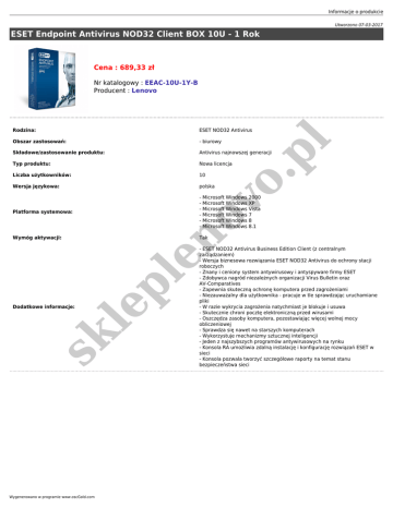 Informacje o produkcie Utworzono 07-03-2017 ESET Endpoint Antivirus NOD32 Client BOX 10U - 1 Rok Cena : 689,33 zł Nr katalogowy : EEAC-10U-1Y-B Producent : Lenovo ESET NOD32 Antivirus Obszar zastosowań: - biurowy Składowe/zastosowanie produktu: Antivirus najnowszej generacji Typ produktu: Nowa licencja Liczba użytkowników: 10 no vo Wersja językowa: polska - Microsoft Windows 2000 - Microsoft Windows XP - Microsoft Windows Vista - Microsoft Windows 7 - Microsoft Windows 8 - Microsoft Windows 8.1 Platforma systemowa: Tak sk le pl e Wymóg aktywacji: Dodatkowe informacje: .p l Rodzina: Wygenerowano w programie www.oscGold.com - ESET NOD32 Antivirus Business Edition Client (z centralnym zarządzaniem) - Wersja biznesowa rozwiązania ESET NOD32 Antivirus do ochrony stacji roboczych - Znany i ceniony system antywirusowy i antyspyware firmy ESET - Zdobywca nagród niezależnych organizacji Virus Bulletin oraz AV-Comparatives - Zapewnia skuteczną ochronę komputera przed zagrożeniami - Niezauważalny dla użytkownika - pracuje w tle sprawdzając uruchamiane pliki - W razie wykrycia zagrożenia natychmiast je blokuje i usuwa - Skutecznie chroni pocztę elektroniczną przed wirusami - Oszczędza zasoby komputera, pozostawiając więcej wolnej mocy obliczeniowej - Sprawdza się nawet na starszych komputerach - Wykorzystuje mechanizmy sztucznej inteligencji - Jeden z najszybszych programów antywirusowych na rynku - Konsola RA umożliwia zdalną instalację i konfigurację rozwiązań ESET w sieci - Konsola pozwala tworzyć szczegółowe raporty na temat stanu bezpieczeństwa sieci