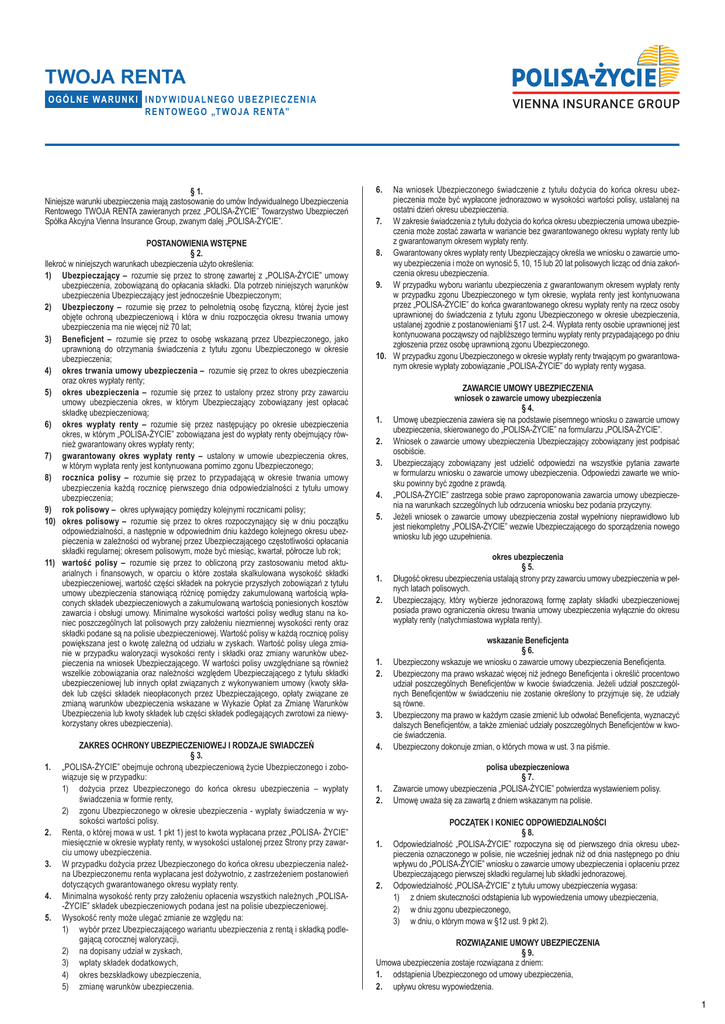 TWOJA RENTA O G Ó L N E WA R U N K I I N DY W I D UA L N E G O U B E Z P I E C Z E N I A R E N T O W E G O „T W O JA R E N TA” § 1. Niniejsze warunki ubezpieczenia mają zastosowanie do umów Indywidualnego Ubezpieczenia Rentowego TWOJA RENTA zawieranych przez „POLISA-ŻYCIE” Towarzystwo Ubezpieczeń Spółka Akcyjna Vienna Insurance Group, zwanym dalej „POLISA-ŻYCIE”. POSTANOWIENIA WSTĘPNE § 2. Ilekroć w niniejszych warunkach ubezpieczenia użyto określenia: 1) Ubezpieczający – rozumie się przez to stronę zawartej z „POLISA-ŻYCIE” umowy ubezpieczenia, zobowiązaną do opłacania składki. Dla potrzeb niniejszych warunków ubezpieczenia Ubezpieczający jest jednocześnie Ubezpieczonym; 2) Ubezpieczony – rozumie się przez to pełnoletnią osobę fizyczną, której życie jest objęte ochroną ubezpieczeniową i która w dniu rozpoczęcia okresu trwania umowy ubezpieczenia ma nie więcej niż 70 lat; 3) Beneficjent – rozumie się przez to osobę wskazaną przez Ubezpieczonego, jako uprawnioną do otrzymania świadczenia z tytułu zgonu Ubezpieczonego w okresie ubezpieczenia; 4) okres trwania umowy ubezpieczenia – rozumie się przez to okres ubezpieczenia oraz okres wypłaty renty; 5) okres ubezpieczenia – rozumie się przez to ustalony przez strony przy zawarciu umowy ubezpieczenia okres, w którym Ubezpieczający zobowiązany jest opłacać składkę ubezpieczeniową; 6) okres wypłaty renty – rozumie się przez następujący po okresie ubezpieczenia okres, w którym „POLISA-ŻYCIE” zobowiązana jest do wypłaty renty obejmujący również gwarantowany okres wypłaty renty; 7) gwarantowany okres wypłaty renty – ustalony w umowie ubezpieczenia okres, w którym wypłata renty jest kontynuowana pomimo zgonu Ubezpieczonego; 8) rocznica polisy – rozumie się przez to przypadającą w okresie trwania umowy ubezpieczenia każdą rocznicę pierwszego dnia odpowiedzialności z tytułu umowy ubezpieczenia; 9) rok polisowy – okres upływający pomiędzy kolejnymi rocznicami polisy; 10) okres polisowy – rozumie się przez to okres rozpoczynający się w dniu początku odpowiedzialności, a następnie w odpowiednim dniu każdego kolejnego okresu ubezpieczenia w zależności od wybranej przez Ubezpieczającego częstotliwości opłacania składki regularnej; okresem polisowym, może być miesiąc, kwartał, półrocze lub rok; 11) wartość polisy – rozumie się przez to obliczoną przy zastosowaniu metod aktuarialnych i finansowych, w oparciu o które została skalkulowana wysokość składki ubezpieczeniowej, wartość części składek na pokrycie przyszłych zobowiązań z tytułu umowy ubezpieczenia stanowiącą różnicę pomiędzy zakumulowaną wartością wpłaconych składek ubezpieczeniowych a zakumulowaną wartością poniesionych kosztów zawarcia i obsługi umowy. Minimalne wysokości wartości polisy według stanu na koniec poszczególnych lat polisowych przy założeniu niezmiennej wysokości renty oraz składki podane są na polisie ubezpieczeniowej. Wartość polisy w każdą rocznicę polisy powiększana jest o kwotę zależną od udziału w zyskach. Wartość polisy ulega zmianie w przypadku waloryzacji wysokości renty i składki oraz zmiany warunków ubezpieczenia na wniosek Ubezpieczającego. W wartości polisy uwzględniane są również wszelkie zobowiązania oraz należności względem Ubezpieczającego z tytułu składki ubezpieczeniowej lub innych opłat związanych z wykonywaniem umowy (kwoty składek lub części składek nieopłaconych przez Ubezpieczającego, opłaty związane ze zmianą warunków ubezpieczenia wskazane w Wykazie Opłat za Zmianę Warunków Ubezpieczenia lub kwoty składek lub części składek podlegających zwrotowi za niewykorzystany okres ubezpieczenia). 1. 2. 3. 4. 5. ZAKRES OCHRONY UBEZPIECZENIOWEJ I RODZAJE SWIADCZEŃ § 3. „POLISA-ŻYCIE” obejmuje ochroną ubezpieczeniową życie Ubezpieczonego i zobowiązuje się w przypadku: 1) dożycia przez Ubezpieczonego do końca okresu ubezpieczenia – wypłaty świadczenia w formie renty, 2) zgonu Ubezpieczonego w okresie ubezpieczenia - wypłaty świadczenia w wysokości wartości polisy. Renta, o której mowa w ust. 1 pkt 1) jest to kwota wypłacana przez „POLISA- ŻYCIE” miesięcznie w okresie wypłaty renty, w wysokości ustalonej przez Strony przy zawarciu umowy ubezpieczenia. W przypadku dożycia przez Ubezpieczonego do końca okresu ubezpieczenia należna Ubezpieczonemu renta wypłacana jest dożywotnio, z zastrzeżeniem postanowień dotyczących gwarantowanego okresu wypłaty renty. Minimalna wysokość renty przy założeniu opłacenia wszystkich należnych „POLISA-ŻYCIE” składek ubezpieczeniowych podana jest na polisie ubezpieczeniowej. Wysokość renty może ulegać zmianie ze względu na: 1) wybór przez Ubezpieczającego wariantu ubezpieczenia z rentą i składką podlegającą corocznej waloryzacji, 2) na dopisany udział w zyskach, 3) wpłaty składek dodatkowych, 4) okres bezskładkowy ubezpieczenia, 5) zmianę warunków ubezpieczenia. 6. Na wniosek Ubezpieczonego świadczenie z tytułu dożycia do końca okresu ubezpieczenia może być wypłacone jednorazowo w wysokości wartości polisy, ustalanej na ostatni dzień okresu ubezpieczenia. 7. W zakresie świadczenia z tytułu dożycia do końca okresu ubezpieczenia umowa ubezpieczenia może zostać zawarta w wariancie bez gwarantowanego okresu wypłaty renty lub z gwarantowanym okresem wypłaty renty. 8. Gwarantowany okres wypłaty renty Ubezpieczający określa we wniosku o zawarcie umowy ubezpieczenia i może on wynosić 5, 10, 15 lub 20 lat polisowych licząc od dnia zakończenia okresu ubezpieczenia. 9. W przypadku wyboru wariantu ubezpieczenia z gwarantowanym okresem wypłaty renty w przypadku zgonu Ubezpieczonego w tym okresie, wypłata renty jest kontynuowana przez „POLISA-ŻYCIE” do końca gwarantowanego okresu wypłaty renty na rzecz osoby uprawnionej do świa