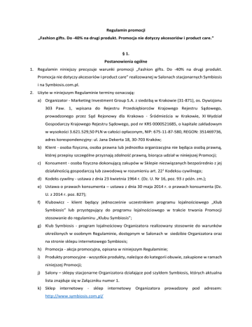 Regulamin promocji „Fashion gifts. Do -40% na drugi produkt. Promocja nie dotyczy akcesoriów i product care.” § 1. Postanowienia ogólne 1. Regulamin niniejszy precyzuje warunki promocji „Fashion gifts. Do -40% na drugi produkt. Promocja nie dotyczy akcesoriów i product care” realizowanej w Salonach stacjonarnych Symbiosis i na Symbiosis.com.pl. 2. Użyte w niniejszym Regulaminie terminy oznaczają: a) Organizator - Marketing Investment Group S.A. z siedzibą w Krakowie (31-871), os. Dywizjonu 303 Paw. 1, wpisana do Rejestru Przedsiębiorców Krajowego Rejestru Sądowego, prowadzonego przez Sąd Rejonowy dla Krakowa - Śródmieścia w Krakowie, XI Wydział Gospodarczy Krajowego Rejestru Sądowego, pod nr KRS 0000521685, o kapitale zakładowym w wysokości 3.621.529,50 PLN w całości opłaconym, NIP: 675-11-87-580, REGON: 351469736, adres korespondencyjny: ul. Jana Dekerta 18, 30-703 Kraków; b) Klient - osoba fizyczna, osoba prawna lub jednostka organizacyjna nie będąca osobą prawną, której przepisy szczególne przyznają zdolność prawną, biorąca udział w niniejszej Promocji; c) Konsument - osoba fizyczna dokonującą zakupów w Sklepie niezwiązanych bezpośrednio z jej działalnością gospodarczą lub zawodową w rozumieniu art. 221 Kodeksu cywilnego; d) Kodeks cywilny - ustawa z dnia 23 kwietnia 1964 r. (Dz. U. Nr 16, poz. 93 z późn. zm.); e) Ustawa o prawach konsumenta – ustawa z dnia 30 maja 2014 r. o prawach konsumenta (Dz. U. z 2014 r. poz. 827); f) Klubowicz - klient będący jednocześnie uczestnikiem programu lojalnościowego „Klub Symbiosis” lub przystępujący do programu lojalnościowego w trakcie trwania Promocji stosowanie do regulaminu „Klubu Symbiosis”; g) Klub Symbiosis - program lojalnościowy Organizatora realizowany stosownie do warunków określonych w osobnym Regulaminie, dostępnym w Salonach w siedzibie Organizatora oraz na stronie sklepu internetowego Symbiosis; h) Promocja - akcja promocyjna, opisana w niniejszym Regulaminie; i) Produkty promocyjne - wszystkie produkty, należące do kategorii obuwie, zakupione w ramach niniejszej Promocji; j) Salony – sklepy stacjonarne Organizatora działające pod szyldem Symbiosis, których aktualna lista znajduje się w Załączniku numer 1. k) Sklep internetowy - sklep internetowy Organizatora prowadzony pod adresem: http://www.symbiosis.com.pl/ l) Regulamin – niniejszy dokument wraz z załącznikami. §2 Zasady i czas trwania Promocji 1. Promocja trwa w okresie od dnia 1 grudnia 2016 r. do dnia 6 grudnia 2016 r. 2. W ramach Promocji Organizator umożliwia wszystkim Klientom, którzy dokonają w Sklepie internetowym lub w Salonie zakupu dwóch Produktów promocyjnych jednocześnie, dalej jako: „Komplet” uzyskanie na drugi tańszy produkt rabatu w wysokości 35% (słownie: trzydzieści pięć procent) od aktualnej ceny tego produktu. 3. Wskazany rabat nie łączy się z innymi akcjami promocyjnymi Organizatora za wyjątkiem rabatu wynikającego z Regulaminu „Klub Symbiosis”. Maksymalna wysokość rabatu, jaki może uzyskać Klubowicz w niniejszej Promocji wynosi 40% (słownie: czterdzieści procent). 4. Chęć przystąpienia do Promocji w Salonie należy zgłosić przed wystawieniem dokumentu fiskalnego. § 3. Zasady zwrotu i wymiany Produktów promocyjnych zakupionych w Sklepie internetowym 1. Zgodnie z art. 27 Ustawy o prawach konsumenta Konsumentowi przysługuje prawo do odstąpienia od Umowy Sprzedaży Produktów promocyjnych bez podania jakiejkolwiek przyczyny w terminie 14 (słownie: czternastu) dni od dnia w którym Konsument wszedł w posiadanie Produktów promocyjnych lub w którym wskazana przez Konsumenta osoba trzecia inna niż Kurier weszła w posiadanie Produktów promocyjnych. 2. Konsument ponosi odpowiedzialność za zmniejszenie wartości Produktu promocyjnego będące wynikiem korzystania z niego w sposób wykraczający poza konieczny do stwierdzenia charakteru, cech i funkcjonowania Produktu. 3. Ponad uprawnienia Konsumenta, o których mowa w § 3. ust 1 niniejszego Regulaminu Sprzedawca przyznaje wszystkim Klientom dodatkową umowną możliwość odstąpienia od Umowy Sprzedaży bez podawania przyczyn poprzez złożenie właściwego oświadczenia Sprzedawcy na piśmie w terminie do 30 dni od daty wejścia w posiadanie Produktów promocyjnych przez Klienta, pod warunkiem że zwracane Produkty są w stanie niezmienionym, chyba że zmiana była konieczna w granicach zwykłego zarządu. 4. W terminie 30 dni (słownie: trzydziestu) od dnia otrzymania Produktów promocyjnych mogą one zostać wymienione na inne Produkty promocyjne w tej samej cenie, pod warunkiem że zwracane produkty są w stanie niezmienionym (brak śladów użytkowania i/lub zniszczenia), chyba że zmiana była konieczna w granicach zwykłego zarządu. 5. Odstąpienie od Umowy sprzedaży Produktów promocyjnych na warunkach wskazanych w niniejszym paragrafie jest możliwe tylko w stosunku do Kompletu. §4. Zasady zwrotu oraz wymiany Produktów promocyjnych zakupionych w Salonach 1. Klientowi przysługuje prawo do odstąpienia od umowy sprzedaży Produktów promocyjnych bez podania przyczyn poprzez złożenie oświadczenia na piśmie w terminie 30 dni (słownie: trzydziestu) od dnia otrzymania Produktów promocyjnych, pod warunkiem, ze zwracane produkty znajdują się w stanie niezmienionym (brak śladów użytkowania i/lub zniszczenia), chyba że zmiana była konieczna w granicach zwykłego zarządu. 2. W przypadku odstąpienia od umowy sprzedaży w ramach niniejszej Promocji Klientowi zwracana jest tylko i wyłącznie cena rzeczywiście przez niego uiszczona za Produkty promocyjne. 3. W terminie 30 dni (słownie: trzydziestu) od dnia otrzymania Produktów promocyjnych mogą one zostać wymienione na inne Produkty promocyjne w tej samej cenie, pod warunkiem że zwracane produkty są w stanie niezmienionym (brak śladów użytkowania i/lub zniszczenia), chyba że zmiana była konieczna w granic