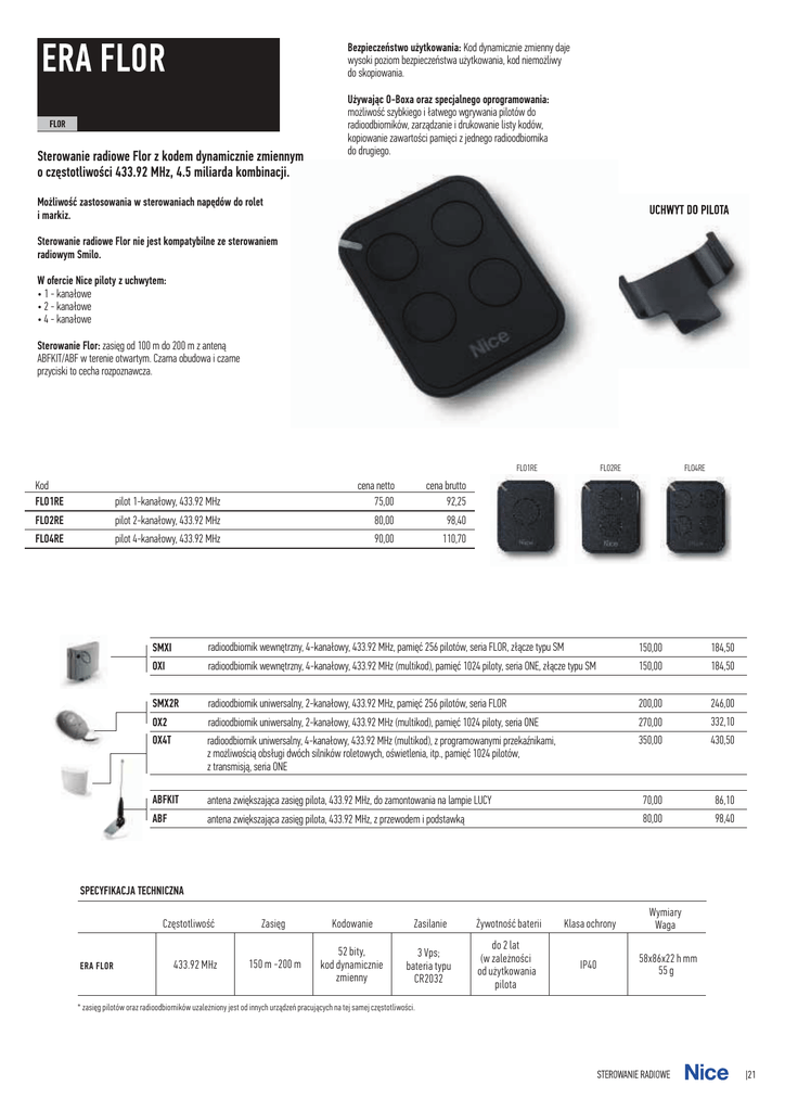 Bezpieczeñstwo u¿ytkowania: Kod dynamicznie zmienny daje wysoki poziom bezpieczeñstwa u¿ytkowania, kod niemo¿liwy do skopiowania. Sterowanie radiowe Flor z kodem dynamicznie zmiennym o czêstotliwoœci 433.92 MHz, 4.5 miliarda kombinacji. U¿ywaj¹c O-Boxa oraz specjalnego oprogramowania: mo¿liwoœæ szybkiego i ³atwego wgrywania pilotów do radioodbiorników, zarz¹dzanie i drukowanie listy kodów, kopiowanie zawartoœci pamiêci z jednego radioodbiornika do drugiego. Mo¿liwoœæ zastosowania w sterowaniach napêdów do rolet i markiz. Sterowanie radiowe Flor nie jest kompatybilne ze sterowaniem radiowym Smilo. W ofercie Nice piloty z uchwytem: • 1 - kana³owe • 2 - kana³owe • 4 - kana³owe Sterowanie Flor: zasiêg od 100 m do 200 m z anten¹ ABFKIT/ABF w terenie otwartym. Czarna obudowa i czarne przyciski to cecha rozpoznawcza. FLO1RE Kod FLO1RE pilot 1-kana³owy, 433.92 MHz cena netto 75,00 FLO2RE pilot 2-kana³owy, 433.92 MHz 80,00 98,40 FLO4RE pilot 4-kana³owy, 433.92 MHz 90,00 110,70 FLO2RE FLO4RE cena brutto 92,25 SMXI radioodbiornik wewnêtrzny, 4-kana³owy, 433.92 MHz, pamiêæ 256 pilotów, seria FLOR, z³¹cze typu SM 150,00 184,50 OXI radioodbiornik wewnêtrzny, 4-kana³owy, 433.92 MHz (multikod), pamiêæ 1024 piloty, seria ONE, z³¹cze typu SM 150,00 184,50 SMX2R radioodbiornik uniwersalny, 2-kana³owy, 433.92 MHz, pamiêæ 256 pilotów, seria FLOR 200,00 246,00 OX2 radioodbiornik uniwersalny, 2-kana³owy, 433.92 MHz (multikod), pamiêæ 1024 piloty, seria ONE 270,00 332,10 OX4T radioodbiornik uniwersalny, 4-kana³owy, 433.92 MHz (multikod), z programowanymi przekaŸnikami, z mo¿liwoœci¹ obs³ugi dwóch silników roletowych, oœwietlenia, itp., pamiêæ 1024 pilotów, z transmisj¹, seria ONE 350,00 430,50 ABFKIT antena zwiêkszaj¹ca zasiêg pilota, 433.92 MHz, do zamontowania na lampie LUCY 70,00 86,10 antena zwiêkszaj¹ca zasiêg pilota, 433.92 MHz, z przewodem i podstawk¹ 80,00 98,40 ABF SPECYFIKACJA TECHNICZNA Czêstotliwoœæ ERA FLOR 433.92 MHz Zasiêg Kodowanie Zasilanie ¯ywotnoœæ baterii Klasa ochrony Wymiary Waga 150 m -200 m 52 bity, kod dynamicznie zmienny 3 Vps; bateria typu CR2032 do 2 lat (w zale¿noœci od u¿ytkowania pilota IP40 58x86x22 h mm 55 g * zasiêg pilotów oraz radioodbiorników uzale¿niony jest od innych urz¹dzeñ pracuj¹cych na tej samej czêstotliwoœci.