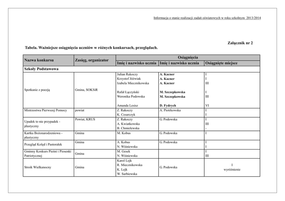 Załącznik nr 2 Tabela. Ważniejsze osiągnięcia uczniów w różnych