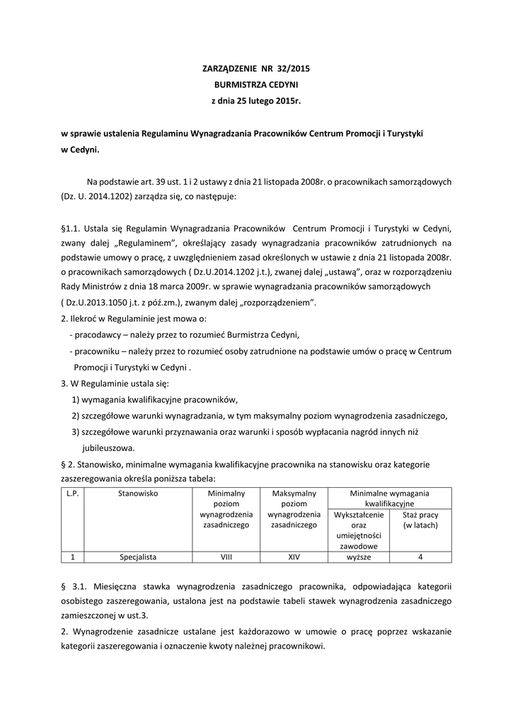 ZARZĄDZENIE NR 32/2015 BURMISTRZA CEDYNI z dnia 25 lutego 2015r. w sprawie ustalenia Regulaminu Wynagradzania Pracowników Centrum Promocji i Turystyki w Cedyni. Na podstawie art. 39 ust. 1 i 2 ustawy z dnia 21 listopada 2008r. o pracownikach samorządowych (Dz. U. 2014.1202) zarządza się, co następuje: §1.1. Ustala się Regulamin Wynagradzania Pracowników Centrum Promocji i Turystyki w Cedyni, zwany dalej „Regulaminem”, określający zasady wynagradzania pracowników zatrudnionych na podstawie umowy o pracę, z uwzględnieniem zasad określonych w ustawie z dnia 21 listopada 2008r. o pracownikach samorządowych ( Dz.U.2014.1202 j.t.), zwanej dalej „ustawą”, oraz w rozporządzeniu Rady Ministrów z dnia 18 marca 2009r. w sprawie wynagradzania pracowników samorządowych ( Dz.U.2013.1050 j.t. z póź.zm.), zwanym dalej „rozporządzeniem”. 2. Ilekroć w Regulaminie jest mowa o: - pracodawcy – należy przez to rozumieć Burmistrza Cedyni, - pracowniku – należy przez to rozumieć osoby zatrudnione na podstawie umów o pracę w Centrum Promocji i Turystyki w Cedyni . 3. W Regulaminie ustala się: 1) wymagania kwalifikacyjne pracowników, 2) szczegółowe warunki wynagradzania, w tym maksymalny poziom wynagrodzenia zasadniczego, 3) szczegółowe warunki przyznawania oraz warunki i sposób wypłacania nagród innych niż jubileuszowa. § 2. Stanowisko, minimalne wymagania kwalifikacyjne pracownika na stanowisku oraz kategorie zaszeregowania określa poniższa tabela: L.P. Stanowisko Minimalny poziom wynagrodzenia zasadniczego Maksymalny poziom wynagrodzenia zasadniczego 1 Specjalista VIII XIV Minimalne wymagania kwalifikacyjne Wykształcenie Staż pracy oraz (w latach) umiejętności zawodowe wyższe 4 § 3.1. Miesięczna stawka wynagrodzenia zasadniczego pracownika, odpowiadająca kategorii osobistego zaszeregowania, ustalona jest na podstawie tabeli stawek wynagrodzenia zasadniczego zamieszczonej w ust.3. 2. Wynagrodzenie zasadnicze ustalane jest każdorazowo w umowie o pracę poprzez wskazanie kategorii zaszeregowania i oznaczenie kwoty należnej pracownikowi. 3. Zatrudnienie w niepełnym wymiarze czasu pracy skutkuje wypłatą wynagrodzenia zasadniczego w wysokości odpowiedniej do ustalonego w umowie wymiaru czasu pracy. TABELA MINIMALNYCH I MAKSYMALNYCH MIESIĘCZNYCH KWOT WYNAGRODZENIA ZASADNICZEGO Kategoria zaszeregowania I Minimalna kwota w złotych 1100 Maksymalna kwota w złotych 1900 II 1120 2000 III 1140 2100 IV 1160 2200 V 1180 2300 VI 1200 2400 VII 1250 2500 VIII 1300 3000 IX 1350 3300 X 1400 3400 XI 1450 3500 XII 1500 4500 XIII 1600 4600 XIV 1700 4700 § 4.1. Tworzy się fundusz nagród, z przeznaczeniem na nagrody za szczególne osiągnięcia w pracy zawodowej. 2. Zakładowy fundusz nagród wynosi do 5% rocznego funduszu płac. 3. Warunkiem przyznania nagrody jest nienaganna i sumienna praca oraz rzetelne wykonywanie obowiązków pracowniczych. 4. Pracownik traci prawo do nagrody w przypadku nie wywiązywania się z obowiązków pracownika samorządowego określonych w ustawie o pracownikach samorządowych, a w szczególności z powodu: 1) nieusprawiedliwionej nieobecności w pracy lub samowolnego opuszczania miejsca pracy; 2) przystąpienie do pracy w stanie nietrzeźwym; 3) nieprzestrzegania ustalonego porządku, regulaminu pracy; przepisów bhp i p.poż., skutkującego wymierzeniem kary upomnienia albo nagany; 4) niewłaściwego realizowania zadań określonych w zakresie czynności. 5. Nagrody przyznaje Burmistrz Cedyni. § 5.1. Pracownikowi przysługuje również dodatek za wieloletnią pracę, nagroda jubileuszowa, dodatkowe wynagrodzenie roczne, odprawa emerytalno-rentowa, wynagrodzenie za czas choroby, wynagrodzenie za czas przestoju oraz inne dodatki do wynagrodzenia i świadczenia związane z pracą, przysługujące zgodnie z Kodeksem Pracy, ustawą i rozporządzeniem. 2. Jeżeli przepisy prawa uzależniają nabycie prawa do świadczeń przewidzianych w niniejszym Regulaminie lub ich wymiar uzależniony jest od stażu pracy, do okresów pracy wlicza się wszystkie poprzednio zakończone okresy zatrudnienia oraz inne okresy, jeżeli z mocy odrębnych przepisów podlegają one wliczeniu do okresu pracy, od którego zależą uprawnienia pracownicze. §6.1. Wynagrodzenie za pracę wypłacane jest raz w miesiącu, za miesiąc pracy z dołu, na pięć dni przed zakończeniem miesiąca. W przypadku, gdy dzień wypłaty przypada w sobotę, niedzielę lub dzień ustawowo wolny od pracy, wypłata następuje w dniu poprzedzającym. Wypłata wynagrodzenia dokonywana jest w formie przelewu na wskazany przez pracownika rachunek bankowy ( nazwa banku i numer rachunku). § 7.1.Z tytułu podróży służbowej na obszarze kraju i poza granicami kraju pracownikowi przysługują należności w wysokości i na warunkach ustalonych w Rozporządzeniu Ministra Pracy i Polityki Społecznej z dnia 29 stycznia 2013r. w sprawie należności przysługujących pracownikowi zatrudnionemu w państwowej lub samorządowej jednostce sfery budżetowej z tytułu podróży służbowej ( Dz.U.2013.167). §8.1. Zarządzenie wchodzi w życie w terminie dwóch tygodni od dnia wywieszenia na tablicy ogłoszeń w siedzibie Urzędu Miejskiego w Cedyni.