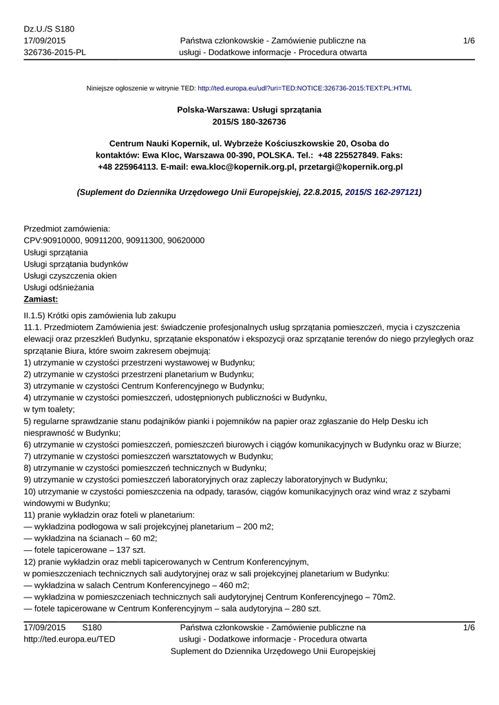 Dz.U./S S180 17/09/2015 326736-2015-PL Państwa członkowskie - Zamówienie publiczne na usługi - Dodatkowe informacje - Procedura otwarta 1/6 Niniejsze ogłoszenie w witrynie TED: http://ted.europa.eu/udl?uri=TED:NOTICE:326736-2015:TEXT:PL:HTML Polska-Warszawa: Usługi sprzątania 2015/S 180-326736 Centrum Nauki Kopernik, ul. Wybrzeże Kościuszkowskie 20, Osoba do kontaktów: Ewa Kloc, Warszawa 00-390, POLSKA. Tel.: +48 225527849. Faks: +48 225964113. E-mail: [email protected], [email protected] (Suplement do Dziennika Urzędowego Unii Europejskiej, 22.8.2015, 2015/S 162-297121) Przedmiot zamówienia: CPV:90910000, 90911200, 90911300, 90620000 Usługi sprzątania Usługi sprzątania budynków Usługi czyszczenia okien Usługi odśnieżania Zamiast: II.1.5) Krótki opis zamówienia lub zakupu 11.1. Przedmiotem Zamówienia jest: świadczenie profesjonalnych usług sprzątania pomieszczeń, mycia i czyszczenia elewacji oraz przeszkleń Budynku, sprzątanie eksponatów i ekspozycji oraz sprzątanie terenów do niego przyległych oraz sprzątanie Biura, które swoim zakresem obejmują: 1) utrzymanie w czystości przestrzeni wystawowej w Budynku; 2) utrzymanie w czystości przestrzeni planetarium w Budynku; 3) utrzymanie w czystości Centrum Konferencyjnego w Budynku; 4) utrzymanie w czystości pomieszczeń, udostępnionych publiczności w Budynku, w tym toalety; 5) regularne sprawdzanie stanu podajników pianki i pojemników na papier oraz zgłaszanie do Help Desku ich niesprawność w Budynku; 6) utrzymanie w czystości pomieszczeń, pomieszczeń biurowych i ciągów komunikacyjnych w Budynku oraz w Biurze; 7) utrzymanie w czystości pomieszczeń warsztatowych w Budynku; 8) utrzymanie w czystości pomieszczeń technicznych w Budynku; 9) utrzymanie w czystości pomieszczeń laboratoryjnych oraz zapleczy laboratoryjnych w Budynku; 10) utrzymanie w czystości pomieszczenia na odpady, tarasów, ciągów komunikacyjnych oraz wind wraz z szybami windowymi w Budynku; 11) pranie wykładzin oraz foteli w planetarium: — wykładzina podłogowa w sali projekcyjnej planetarium – 200 m2; — wykładzina na ścianach – 60 m2; — fotele tapicerowane – 137 szt. 12) pranie wykładzin oraz mebli tapicerowanych w Centrum Konferencyjnym, w pomieszczeniach technicznych sali audytoryjnej oraz w sali projekcyjnej planetarium w Budynku: — wykładzina w salach Centrum Konferencyjnego – 460 m2; — wykładzina w pomieszczeniach technicznych sali audytoryjnej Centrum Konferencyjnego – 70m2. — fotele tapicerowane w Centrum Konferencyjnym – sala audytoryjna – 280 szt. 17/09/2015 S180 http://ted.europa.eu/TED Państwa członkowskie - Zamówienie publiczne na usługi - Dodatkowe informacje - Procedura otwarta Suplement do Dziennika Urzędowego Unii Europejskiej 1/6 Dz.U./S S180 17/09/2015 326736-2015-PL Państwa członkowskie - Zamówienie publiczne na usługi - Dodatkowe informacje - Procedura otwarta 2/6 — pranie mebli tapicerowanych w Centrum Konferencyjnym – kwadratowe kanapy z ekoskóry – 4 szt. 6 szt. foteli, 2 szt. kanap tapicerowanych. 13) mycie i czyszczenie krzeseł twardych nietapicerowanych w Budynku oraz w Biurze; 14) czyszczenie oraz pranie mebli tapicerowanych (w technologiach nie powodujących uszkodzeń) znajdujących się w Budynku oraz Biurze. 15) wyrzucanie odpadów gabarytowych do kontenerów zamawianych przez Zamawiającego; 16) utrzymanie w czystości pomieszczeń socjalnych i pomieszczeń sanitarnych w Budynku oraz w Biurze; 17) odkurzanie i czyszczenie eksponatów w Budynku – Instrukcje czyszczenia eksponatów stanowią Załączniki nr 13 cz. 1 i cz. 2 do SIWZ; 18) mycie i czyszczenie okien i wszystkich powierzchni szklanych w Budynku własnym sprzętem i środkami. Do wykonania mycia i czyszczenia okien, a także niektórych powierzchni szklanych, ze względów bezpieczeństwa, Zamawiający wymaga wykonywania ich przez osoby posiadające uprawnienia alpinistyczne oraz posiadające aktualne uprawnienia do pracy na wysokości; 19) mycie i czyszczenie poręczy, klamek i drzwi w Budynku oraz w Biurze; 20) utrzymanie w czystości terenu przynależnego do Budynku wraz z terenem „Parku Odkrywców”, galerią plenerową i parkingiem. Plan terenu przynależnego do Budynku stanowi Załącznik nr 10 do SIWZ; 21) odśnieżania dachu Budynku, usuwanie sopli i nawisów lodowych – strefa zrzutu śniegu znajduje się na terenie przylegającym do drogi pożarowej od strony rzeki Wisły; 22) odśnieżanie oraz odladzanie, w tym usuwanie sopli i nawisów lodowych z elewacji zewnętrznej Budynku, wraz ze wszystkimi jej elementami oraz ciągów komunikacyjnych, chodników wokół Budynku wraz z wywozem śniegu. Tereny przynależne, przedstawione są w Załączniku nr 10 do SIWZ; 23) utrzymanie w czystości terenów przyległych do Budynku, przedstawionych w Załączniku nr 10 do SIWZ; 24) obsługa zmywarek do naczyń, obejmująca załadowanie naczyń i sztućców oraz środków czyszczących, w tym bieżące uzupełnianie soli do zmywarek, a po skończonym zmywaniu rozładowanie zmywarek i schowanie naczyń i sztućców do szafek; 25) zapewnienie niezbędnych środków czystości, środków i artykułów higieniczno-sanitarnych oraz innych środków lub preparatów niezbędnych do należytego wykonania przedmiotu Zamówienia; 26) przeprowadzenie w Budynku, co najmniej raz w miesiącu, dezynfekcji, dezynsekcji oraz co najmniej raz na dwa miesiące deratyzacji, przeprowadzenie oprysku fasady zabezpieczającego przed pająkami, oraz przekazywanie protokołów, potwierdzających wykonanie usługi w terminie 2 (dwóch) dni roboczych od dnia wykonania odpowiednio dezynfekcji, dezynsekcji lub deratyzacji; 27) czyszczenie (odkurzanie, w przypadku silnych zabrudzeń odpowiednie mycie) rolet, verticali oraz żaluzji w Budynku; 28) zapewnienie nieodpłatnego dostępu 24 h/dobę (dwadzieścia cztery godziny na dobę), 7 (siedem) dni w tygodniu, do elektronicznego systemu w formie elektroniczne