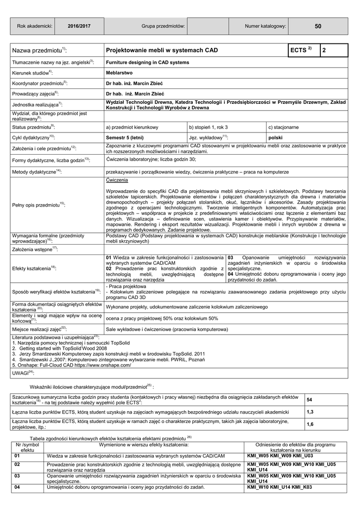 2016/2017 Rok akademicki: Grupa przedmiotów: Nazwa przedmiotu1): Projektowanie mebli w systemach CAD Tłumaczenie nazwy na jęz. angielski3): Furniture designing in CAD systems Kierunek studiów4): Meblarstwo 5) 50 Numer katalogowy: ECTS 2) 2 Dr hab. inż. Marcin Zbieć Koordynator przedmiotu : 6) Prowadzący zajęcia : Dr hab. inż. Marcin Zbieć Jednostka realizująca7): Wydział Technologii Drewna, Katedra Technologii i Przedsiębiorczości w Przemyśle Drzewnym, Zakład Konstrukcji i Technologii Wyrobów z Drewna Wydział, dla którego przedmiot jest realizowany8): Status przedmiotu9): a) przedmiot kierunkowy b) stopień 1, rok 3 c) stacjonarne Cykl dydaktyczny10): Semestr 5 (letni) Jęz. wykładowy11): polski Założenia i cele przedmiotu12): Zapoznanie z kluczowymi programami CAD stosowanymi w projektowaniu mebli oraz zastosowanie w praktyce ich rozszerzonych możliwościami i narzędziami. Formy dydaktyczne, liczba godzin13): Ćwiczenia laboratoryjne; liczba godzin 30; Metody dydaktyczne14): przekazywanie i porządkowanie wiedzy, ćwiczenia praktyczne – praca na komputerze Ćwiczenia Wprowadzenie do specyfiki CAD dla projektowania mebli skrzyniowych i szkieletowych. Podstawy tworzenia szkieletów tapicerskich. Projektowanie elementów i połączeń charakterystycznych dla drewna i materiałów drewnopochodnych – projekty połączeń stolarskich, okuć, łączników i akcesoriów. Zasady projektowania zgodnego z operacjami technologicznymi. Tworzenie inteligentnych komponentów. Automatyzacja prac projektowych – współpraca w projekcie z predefiniowanymi właściwościami oraz łączenie z elementami baz danych. Wizualizacja – definiowanie scen, ustawienia kamer i obiektywów. Przypisywanie materiałów, mapowanie. Rendering i eksport rezultatów wizualizacji. Projektowanie mebli i innych wyrobów z drewna w programach dedykowanych. Zadanie projektowe. Podstawy CAD (Podstawy projektowania w systemach CAD) konstrukcje meblarskie (Konstrukcje i technologie mebli skrzyniowych) Pełny opis przedmiotu15): Wymagania formalne (przedmioty wprowadzające)16): Założenia wstępne17): Efekty kształcenia18): Sposób weryfikacji efektów kształcenia19): 01 Wiedza w zakresie funkcjonalności i zastosowania wybranych systemów CAD/CAM 02 Prowadzenie prac konstruktorskich zgodnie z technologią mebli, uwzględniającą dostępne rozwiązania oraz narzędzia - Praca projektowa - Kolokwium zaliczeniowe polegające na rozwiązaniu programu CAD 3D 03 Opanowanie umiejętności rozwiązywania zagadnień inżynierskich w oparciu o środowiska specjalistyczne. 04 Umiejętność doboru oprogramowania i oceny jego przydatności do zadań. zaawansowanego zadania projektowego przy użyciu Forma dokumentacji osiągniętych efektów Wykonane projekty, udokumentowane zaliczenie kolokwium zaliczeniowego kształcenia 20): Elementy i wagi mające wpływ na ocenę ocena z pracy projektowej 50% oraz kolokwium 50% końcową21): Miejsce realizacji zajęć22): Sale wykładowe i ćwiczeniowe (pracownia komputerowa) 23) Literatura podstawowa i uzupełniająca : 1. Narzędzia pomocy technicznej i samouczki TopSolid 2. Getting started with TopSolid’Wood 2008 3. Jerzy Smardzewski Komputerowy zapis konstrukcji mebli w środowisku TopSolid. 2011 4. Smardzewski J.,2007: Komputerowo zintegrowane wytwarzanie mebli. PWRiL, Poznań 5. Onshape: Full-Cloud CAD https://www.onshape.com/ UWAGI24): Wskaźniki ilościowe charakteryzujące moduł/przedmiot25) : Szacunkowa sumaryczna liczba godzin pracy studenta (kontaktowych i pracy własnej) niezbędna dla osiągnięcia zakładanych efektów kształcenia18) - na tej podstawie należy wypełnić pole ECTS2: 54 Łączna liczba punktów ECTS, którą student uzyskuje na zajęciach wymagających bezpośredniego udziału nauczycieli akademicki 1,3 Łączna liczba punktów ECTS, którą student uzyskuje w ramach zajęć o charakterze praktycznym, takich jak zajęcia laboratoryjne, projektowe, itp.: 1,6 Tabela zgodności kierunkowych efektów kształcenia efektami przedmiotu 26) Nr /symbol Wymienione w wierszu efekty kształcenia: efektu 01 Wiedza w zakresie funkcjonalności i zastosowania wybranych systemów CAD/CAM 02 03 04 Prowadzenie prac konstruktorskich zgodnie z technologią mebli, uwzględniającą dostępne rozwiązania oraz narzędzia Opanowanie umiejętności rozwiązywania zagadnień inżynierskich w oparciu o środowiska specjalistyczne. Umiejętność doboru oprogramowania i oceny jego przydatności do zadań. Odniesienie do efektów dla programu kształcenia na kierunku KMI_W05 KMI_W09 KMI_U03 KMI_W05 KMI_W09 KMI_W10 KMI_U05 KMI_U14 KMI_W05 KMI_W09 KMI_W10 KMI_U05 KMI_U14 KMI_W10 KMI_U14 KMI_K03