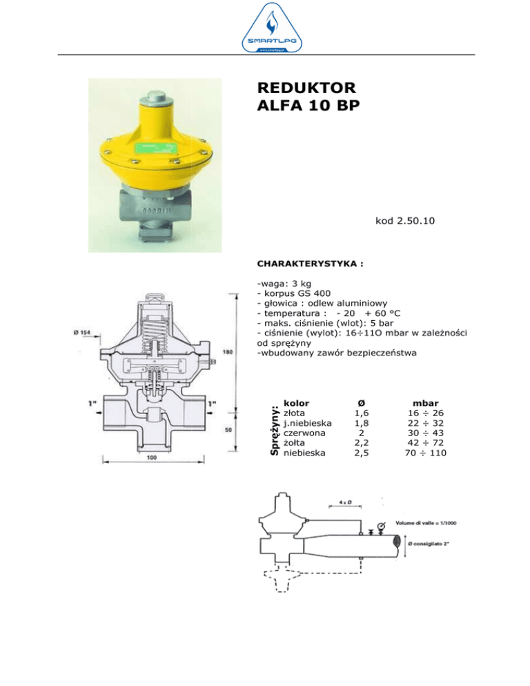 100 Płońsk, ul. Wyszog dzka 61 tel.+48 692 198 426 tel.+ uro REDUKTOR ALFA 10 BP kod 2.50.10 CHARAKTERYSTYKA : Sprężyny: -waga: 3 kg - korpus GS 400 - głowica : odlew aluminiowy - temperatura : - 20 + 60 °C - maks. ciśnienie (wlot): 5 bar - ciśnienie (wylot): 16÷11O mbar w zależności od sprężyny -wbudowany zawór bezpieczeństwa kolor złota j.niebieska czerwona żołta niebieska Ø 1,6 1,8 2 2,2 2,5 mbar 16 ÷ 26 22 ÷ 32 30 ÷ 43 42 ÷ 72 70 ÷ 110