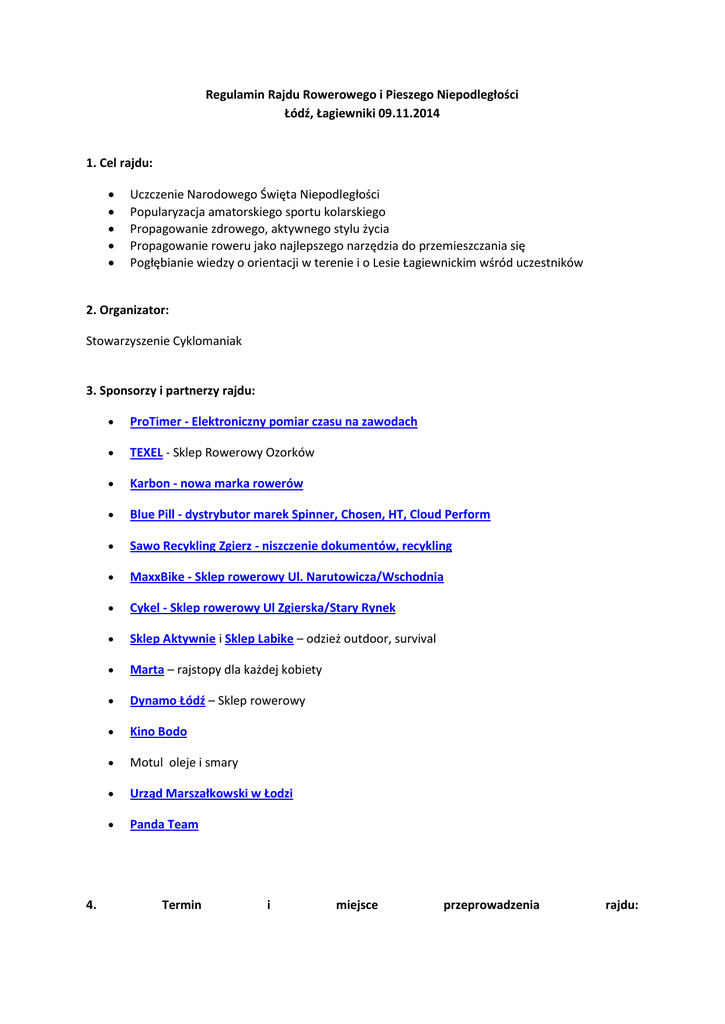 Regulamin Rajdu Rowerowego i Pieszego Niepodległości Łódź, Łagiewniki 09.11.2014 1. Cel rajdu: Uczczenie Narodowego Święta Niepodległości Popularyzacja amatorskiego sportu kolarskiego Propagowanie zdrowego, aktywnego stylu życia Propagowanie roweru jako najlepszego narzędzia do przemieszczania się Pogłębianie wiedzy o orientacji w terenie i o Lesie Łagiewnickim wśród uczestników 2. Organizator: Stowarzyszenie Cyklomaniak 3. Sponsorzy i partnerzy rajdu: 4. ProTimer - Elektroniczny pomiar czasu na zawodach TEXEL - Sklep Rowerowy Ozorków Karbon - nowa marka rowerów Blue Pill - dystrybutor marek Spinner, Chosen, HT, Cloud Perform Sawo Recykling Zgierz - niszczenie dokumentów, recykling MaxxBike - Sklep rowerowy Ul. Narutowicza/Wschodnia Cykel - Sklep rowerowy Ul Zgierska/Stary Rynek Sklep Aktywnie i Sklep Labike – odzież outdoor, survival Marta – rajstopy dla każdej kobiety Dynamo Łódź – Sklep rowerowy Kino Bodo Motul oleje i smary Urząd Marszałkowski w Łodzi Panda Team Termin i miejsce przeprowadzenia rajdu: Rajd odbędzie się dnia 09.11.2014r (niedziela) na Lasu Łagiewnickiego. Parking 1 publiczny dostępny jest na Wycieczkowej a St. Działka tzw. kaloryfer oddalony od miejsca startu 500 m. Parking 2 – Centrum zarządzania szlakiem konnym ul Wycieczkowa – 100m od startu. Biuro zawodów mieści się w Ośrodku Edukacji Ekologicznej (ul. Wycieczkowa 107) Biuro zawodów będzie czynne od godziny 9.00. Otwarcie rajdu przewidziano na godzinę 10.00. Zapisy przez Internet będą czynne do 08.11.2014 do godz. 24.00. Udział w rajdzie jest bezpłatny. Organizator nie zapewnia miejsc parkingowych przy Ośrodku Edukacji Ekologicznej i nie ponosi odpowiedzialności za źle zaparkowane samochody! 5. Zapisy: http://www.protimer.pl/bio/94/xx-rajd-niepodleglosci Można startować w rajdzie pieszym lub rowerowym. Osoby niepełnoletnie startują wyłącznie za zgodą opiekunów. 6. Sposób przeprowadzenia rajdu: Uczestnicy rajdu rowerowego startują na dowolnych, sprawnych i bezpiecznych rowerach. Uczestnik biorący udział w rajdzie musi mieć założony i zapięty kask na głowie. Zachęcamy do spędzenia tego dnia inaczej niż zazwyczaj. Nagrodzimy również najciekawsze wizerunki/stroje/ elementy nawiązujące do Święta Niepodległości. 8. Nagrody: Dla uczestników przewiduje się upominki. 9. Świadczenia dla zawodników: Pakiet startowy (szprychówka, mapa, gadżet, prowiant) Karta kontrolna/manifest Mapa rajdu z punktami kontrolnymi Ciepły posiłek i herbata na mecie Dobra zabawa 10. Trasa Trasa rajdu przebiegać będzie w Lesie Łagiewnickim. Do zaliczania będą punkty kontrolne. Jej długość to odpowiednio dla rajdów ok. 20km – rowerowy – 10km pieszy. 11. Uwagi końcowe: Zapisz się przez Internet nawet jak nie wiesz czy przyjedziesz! Zmniejsz kolejkę w biurze zawodów i pozwól nam oszacować ile potrzebujemy pakietów startowych. Z góry dziękujemy. Każdy zawodnik startuje na własną odpowiedzialność, a osoby niepełnoletnie na odpowiedzialność opiekunów i pod ich opieką. Fakt znajomości regulaminu potwierdza się w biurze zawodów własnoręcznym podpisem na karcie zgłoszeniowej. Za osoby niepełnoletnie podpisuje się opiekun. Organizatorzy nie ponoszą odpowiedzialności za ewentualne wypadki oraz uszczerbek na zdrowiu uczestników.