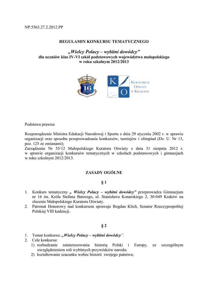 NP.5563.27.2.2012.PP REGULAMIN KONKURSU TEMATYCZNEGO „Wielcy Polacy – wybitni dowódcy” dla uczniów klas IV-VI szkół podstawowych województwa małopolskiego w roku szkolnym 2012/2013 Podstawa prawna: Rozporządzenie Ministra Edukacji Narodowej i Sportu z dnia 29 stycznia 2002 r. w sprawie organizacji oraz sposobu przeprowadzania konkursów, turniejów i olimpiad (Dz. U. Nr 13, poz. 125 ze zmianami); Zarządzenie Nr 55/12 Małopolskiego Kuratora Oświaty z dnia 31 sierpnia 2012 r. w sprawie organizacji konkursów tematycznych w szkołach podstawowych i gimnazjach w roku szkolnym 2012/2013. ZASADY OGÓLNE §1 1. 2. Konkurs tematyczny „ Wielcy Polacy – wybitni dowódcy” przeprowadza Gimnazjum nr 16 im. Króla Stefana Batorego, ul. Stanisława Konarskiego 2, 30-049 Kraków na zlecenie Małopolskiego Kuratora Oświaty. Patronat Honorowy nad konkursem sprawuje Bogdan Klich, Senator Rzeczypospolitej Polskiej VIII kadencji. §2 1. 2. Temat konkursu: „Wielcy Polacy – wybitni dowódcy”. Cele konkursu: 1) rozbudzanie zainteresowania historią Polski i Europy, uwzględnieniem roli wybitnych przywódców narodu; 2) kształtowanie szacunku wobec historii swojego państwa; ze szczególnym 3) popularyzowanie wiedzy dotyczącej Ŝycia i działalności Stefana Batorego, Stanisława śółkiewskiego, Jana Karola Chodkiewicza, Jana III Sobieskiego, Józefa Bema i Romualda Traugutta; 4) ukazanie Stefana Batorego, Stanisława śółkiewskiego, Jana Karola Chodkiewicza, Jana III Sobieskiego, Józefa Bema i Romualda Traugutta jako wybitnych przywódców i autorytetów; 5) promowanie wartości demokratycznych i kształtowanie patriotyzmu przy poszanowaniu dla praw innych narodów; 6) rozwijanie indywidualnych uzdolnień uczniów oraz dostrzeganie i promowanie młodzieŜy o nieprzeciętnej wiedzy i umiejętnościach; 7) kształtowanie umiejętności samodzielnego myślenia o minionych dziejach; 8) pogłębianie umiejętności posługiwania się ze zrozumieniem pojęciami historycznymi; 9) rozwijanie umiejętności tworzenia narracji historycznej – integrowania informacji pozyskanych z róŜnych źródeł oraz przedstawiania argumentów uzasadniających własne stanowisko; 10) rozwijanie umiejętności wskazywania powiązań pomiędzy przeszłością a czasami współczesnymi. §3 Uczestnikami konkursu mogą być uczniowie klas IV – VI szkół podstawowych województwa małopolskiego, którzy zadeklarują w nim swój udział. §4 1. Finaliści i laureaci konkursu otrzymają zaświadczenia Małopolskiego Kuratora Oświaty, które są waŜne na terenie całego kraju. 2. Laureaci konkursu otrzymają nagrody. §5 1. Konkurs przeprowadza Wojewódzka Komisja Konkursowa powołana przez Małopolskiego Kuratora Oświaty. 2. Siedzibą Komisji Wojewódzkiej jest Gimnazjum nr 16 im. Króla Stefana Batorego, ul. Stanisława Konarskiego 2, 30-049 Kraków §6 Informacje dotyczące organizacji, przebiegu i wyników konkursu będą przekazywane przez strony http://www.gim16.bci.pl/konkurs oraz www.kuratorium.krakow.pl PRZEBIEG KONKURSU §7 1. Konkurs przeprowadzany jest w trzech etapach: 1) szkolnym; 2) rejonowym; 3) wojewódzkim. 2 2. Szczegółowy harmonogram przebiegu konkursu określa załącznik nr 1 do niniejszego Regulaminu. 3. Eliminacje konkursowe na wszystkich etapach będą przeprowadzane w formie pisemnej. 4. W etapie szkolnym konkursu mogą brać udział wszyscy uczniowie zainteresowani konkursem. Szkoła zgłasza udział w konkursie wypełniając formularz, umieszczony na stronie internetowej konkursu http://www.gim16.bci.pl/konkurs w terminie określonym w harmonogramie konkursu. 5. W etapie rejonowym moŜe wziąć udział co najwyŜej 400 uczestników konkursu, którzy uzyskali najwyŜszą liczbę punktów w eliminacjach szkolnych, jednak nie mniej niŜ 75% punktów moŜliwych do uzyskania. 6. W etapie wojewódzkim moŜe wziąć udział co najwyŜej 100 uczestników konkursu, którzy uzyskali najwyŜszą liczbę punktów w eliminacjach rejonowych, jednak nie mniej niŜ 75% punktów moŜliwych do uzyskania.. 7. Tytuł finalisty konkursu uzyskuje kaŜdy uczeń, który przystąpił do etapu wojewódzkiego. 8. Tytuł laureata konkursu otrzymuje 20 uczestników konkursu, którzy uzyskali najwyŜszą liczbę punktów w etapie wojewódzkim, a takŜe ci uczestnicy, którzy uzyskali identyczną liczbę punktów, jaką uzyskał dwudziesty finalista. §8 1. Organizacja etapu szkolnego konkursu i nadzór nad jego przebiegiem spoczywa na dyrektorze szkoły, który: 1) powołuje szkolną komisję konkursową, w skład której wchodzi co najmniej dwóch nauczycieli, w tym nauczyciel historii; 2) uzyskuje zgodę rodziców (prawnych opiekunów) uczniów biorących udział w konkursie na przetwarzanie do celów konkursu danych osobowych uczniów oraz uzyskuje ich potwierdzenie, Ŝe zapoznali się z Regulaminem i akceptują jego postanowienia, zgodnie z wzorem, stanowiącym załącznik nr 2 do niniejszego Regulaminu; 3) zapewnia opiekę uczniom uczestniczącym w etapie szkolnym w innej szkole, jeŜeli w szkole mu podległej nie jest organizowany etap szkolny konkursu; 4) 48 godzin przed etapem szkolnym pobiera ze strony www.kuratorium.krakow.pl arkusz z zadaniami oraz przygotowuje odpowiednią liczbę egzemplarzy dla uczestników konkursu; 5) organizuje o godzinie 13.00 eliminacje szkolne w warunkach zapewniających samodzielną pracę uczestników; 6) umoŜliwia wgląd do prac uczniom, ich rodzicom (prawnym opiekunom) i opiekunom naukowym, zgodnie z harmonogramem przebiegu konkursu, na zasadach określonych w § 11 niniejszego Regulaminu; 7) przyjmuje pisemne zastrzeŜenia, dotyczące sprawdzania i oceniania prac przez szkolną komisję konkursową i przekazuje je do zespołu rozpatrującego zastrzeŜenia wraz z pracami, których one dotyczą (siedziba Gimnazjum nr 16 im. Króla Stefana Batorego, ul. Stanisława Konarskiego 2, 30-049 Kraków z Konkurs dla szkół podstawowych „Wielcy Polacy – wybitni do