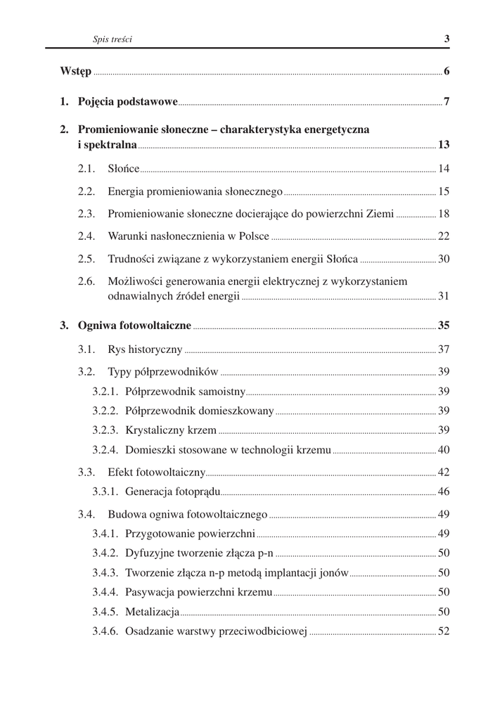 Spis treści 3 Wstęp ..................................................................................................................................................................... 6 1. Pojęcia podstawowe ............................................................................................................................. 7 2. Promieniowanie słoneczne – charakterystyka energetyczna i spektralna ............................................................................................................................................. 13 2.1. Słońce ............................................................................................................................................ 14 2.2. Energia promieniowania słonecznego ........................................................................ 15 2.3. Promieniowanie słoneczne docierające do powierzchni Ziemi ................... 18 2.4. Warunki nasłonecznienia w Polsce .............................................................................. 22 2.5. Trudności związane z wykorzystaniem energii Słońca .................................... 30 2.6. Możliwości generowania energii elektrycznej z wykorzystaniem odnawialnych źródeł energii ............................................................................................ 31 3. Ogniwa fotowoltaiczne ................................................................................................................... 35 3.1. Rys historyczny ....................................................................................................................... 37 3.2. Typy półprzewodników ...................................................................................................... 39 3.2.1. Półprzewodnik samoistny.......................................................................................... 39 3.2.2. Półprzewodnik domieszkowany ............................................................................ 39 3.2.3. Krystaliczny krzem ....................................................................................................... 39 3.2.4. Domieszki stosowane w technologii krzemu ................................................. 40 3.3. Efekt fotowoltaiczny............................................................................................................. 42 3.3.1. Generacja fotoprądu...................................................................................................... 46 3.4. Budowa ogniwa fotowoltaicznego ............................................................................... 49 3.4.1. Przygotowanie powierzchni ..................................................................................... 49 3.4.2. Dyfuzyjne tworzenie złącza p-n ............................................................................ 50 3.4.3. Tworzenie złącza n-p metodą implantacji jonów ......................................... 50 3.4.4. Pasywacja powierzchni krzemu ............................................................................. 50 3.4.5. Metalizacja ......................................................................................................................... 50 3.4.6. Osadzanie warstwy przeciwodbiciowej ............................................................ 52 4 Spis treści 3.5. Charakterystyka prądowo-napięciowa ....................................................................... 54 3.5.1. Czynniki wpływające na sprawność konwersji ogniw fotowoltaicznych ............................................................................................................ 60 3.5.1.1. Straty energetyczne wpływające na moc wyjściową ..................61 3.5.1.2. Wpływ temperatury na pracę ogniwa .........................................62 3.5.2. MPPT – Techniki wyszukiwania punktu maksymalnej mocy .............. 65 3.6. Krzemowe ogniwa fotowoltaiczne ............................................................................... 69 3.6.1. Ogniwa monokrystaliczne......................................................................................... 72 3.6.2. Ogniwa polikrystaliczne (multikrystaliczne) ................................................. 76 3.6.3. EFG (Edge-Defined Film-Fed Growth) ............................................................ 77 3.7. Technologie cienkowarstwowe....................................................................................... 78 3.8. Organiczne ogniwa fotowoltaiczne .............................................................................. 83 3.9. Ogniwa słoneczne Grätzela (DSSC – Dye-sensitized solar cells) .............. 83 3.10. Ogniwa heterozłączowe ...................................................................................................... 86 4. Moduły fotowoltaiczne ................................................................................................................... 89 4.1. Konstrukcja modułów .......................................................................................................... 91 4.2. Etapy produkcji modułów ................................................................................................. 92 4.2.1. Łączenie ogniw................................................................................................................ 94 4.2.2. Podłoże, hermetyzacja ................................................................................................. 95 4.2.3. Warstwa antyrefleksyjna ............................................................................................ 97 4.2.4. Zabezpieczenie przed skutkami zacienienia ................................................... 97 5. Systemy fotowoltaiczne .................................................................................................................. 99 5.1. Systemy samodzielne (off-grid) ......................................................................