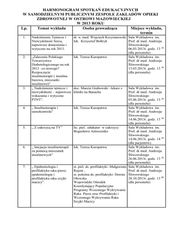 HARMONOGRAM SPOTKAŃ EDUKACYJNYCH W SAMODZIELNYM PUBLICZNYM ZESPOLE ZAKŁADÓW OPIEKI ZDROWOTNEJ W OSTROWI MAZOWIECKIEJ W 2013 ROKU Lp. Temat wykładu Osoba prowadząca Miejsce wykładu, termin 1. Nadciśnienie Tętnicze i Niewydolność Serca, najnowsze doniesienia i wytyczne na rok 2013. 2. „Zalecenia Polskiego Towarzystwa Diabetologicznego na rok 2013 –co nowego? Rozpoczęcie insulinoterapii ( insulina bazowa, mieszanki insulinowe)” „ Nadciśnienie tętnicze i doc. Marcin Grabowski –lekarz z niewydolność – najnowsze kliniki na Banacha wskazania i wytyczne PTNT”. 3. 4. „ Insulinoterapia i samokontrola” 5. „ Z cukrzycą na TY” 6. „ Inicjacja insulinoterapii za pomocą mieszanek insulinowych” 7. „ Epidemiologia i profilaktyka raka piersi, epidemiologia i profilaktyka raka szyjki macicy”. dr n. med. Wojciech Krzyżanowski Sala Wykładowa im. lek. Krzysztof Bołtryk Prof. dr med. Andrzeja Śliwowskiego 06.03.2013r. godz. 13 30 (dla personelu) lek. Teresa Kuropatwa Sala Wykładowa im. Prof. dr med. Andrzeja Śliwowskiego 13.03.2013r. godz. 13 30 (dla personelu) Sala Wykładowa im. Prof. dr med. Andrzeja Śliwowskiego 03.06.2013r. godz. 13 30 (dla personelu) lek. Teresa Kuropatwa Sala Wykładowa im. Prof. dr med. Andrzeja Śliwowskiego 14.06.2013r. godz. 13 30 (dla personelu) lic. piel. edukator w cukrzycy Sala Wykładowa im. Bogusława Antoszenko Prof. dr med. Andrzeja Śliwowskiego 14.06.2013r. godz. 14 30 (dla pacjentów) lek. Teresa Kuropatwa Sala Wykładowa im. Prof. dr med. Andrzeja Śliwowskiego 26.06.2013r. godz. 13 30 (dla personelu) st. piel. ds. profilaktyki -Małgorzata Sala Wykładowa im. Rejent , Prof. dr med. Andrzeja st. położna ds. profilaktyki- Dorota Śliwowskiego Ołowska 28.10.2013r. godz. 13 00 Wojewódzki Ośrodek (dla personelu) Koordynujący Populacyjne Programy Wczesnego Wykrywania Raka Piersi oraz Profilaktyki i Wczesnego Wykrywania Raka Szyjki Macicy 8. „ Kiedy i u Kogo terapia mieszanką insulinowąprzypadki pacjentów”. lek. Teresa Kuropatwa 9. „Stabilna choroba wieńcowa i nadciśnienie tętnicze- co na to lekarz praktyk?” prof. dr hab. n. med. Waldemar Banasiak z Ośrodka Chorób Serca Wojskowego Szpitala Klinicznego we Wrocławiu 10. 11. Sala Wykładowa im. Prof. dr med. Andrzeja Śliwowskiego 13.11.2013r. godz. 13 30 (dla personelu) Sala Wykładowa im. Prof. dr med. Andrzeja Śliwowskiego 18.12.2013r. godz. 13 30 (dla personelu) Światowy Dzień Zdrowia lic. piel. edukator w Szpital Powiatowy 2013 pod hasłem cukrzycy Bogusława Antoszenko Ostrów Mazowiecka „ Zdrowe bicie serca” mgr piel. , specjalista piel. 10.04.2013r. zachowawczego Ewa Bacławska Pomiar ciśnienia dietetyk mgr inż. Barbara Sobieska tętniczego, poziomu specjalista ds. promocji zdrowia glukozy, obliczanie mgr Beata Ścibich BMI, porady dietetyka „Światowy Dzień lic. piel. , edukator w Szpital Powiatowy Zwalczania Cukrzycy’ cukrzycy Bogusława Antoszenko Ostrów Mazowiecka mgr piel. specjalista piel. 13.11.2013r. zachowawczego Ewa Bacławska Pomiar ciśnienia dietetyk mgr inż. Barbara Sobieska tętniczego, poziomu specjalista ds. promocji zdrowia glukozy, obliczanie mgr Beata Ścibich BMI, porady dietetyka Opracowała B. Ścibich