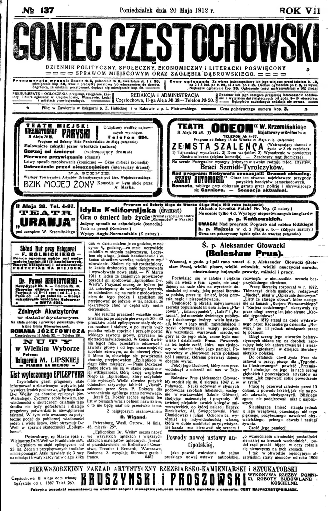 m 137 ROK Vll Poniedziałek dnia 20 Maja 1912 r. KOMEC ESTOCWMI DZIENNIK POLITYCZNY, SPOŁECZNY, EKONOMICZNY i LITERACKI POŚWIĘCONY = = = = SPRAWOM MIEJSCOWYM ORAZ ZAGŁĘBIA DĄBROWSKIEGO. = = = = ______ Prenumerata wynosił Rocznie rfa. 6, półrocznie rb. 3, kwartalnie rb. I k. 50, miesięcznie kop 50, wraz z przesyłką pocztową tub »dnoszenism do demów. Zagranicą, za markami pocztowemi, dopłaca się miesięcznie kop. 69. ===== PRENUMERATĘ i OGŁOSZENIA przy-jm ~ tory i biura ogłoszeń: w Częstochowie, ... ===== i miastach prowincjonalnych. | Ceny ogłZa jekrsz jedaosrp altowylub jego miejsce: praed tekstem k. -.6, M . Najtańsze ogłoszenie kop. 30« (Jgłoszeaie treści matrymonialnej o 50% drożej. — REDAKCJA i ADMINISTRACJA | Redaktor ~P— , lub jego zastępca przyjmują Interesantów coidzłeaim dni sczorem. yj4tkir — świątecznych od godz. 8—10 wleci Częstochowa, Il-ga Aleja N 38—Telefon JNb 50. fl °,e z WB4“ae?' Rękopisów lisów nadesłanych redakcja nie zwraca. ; Filie: w Zawierciu w księgarni p. Z. Hubickiej i w Rakowie u p. L. Piotrowskiego. TEATR MIEJSKI IIEJ5K1 ________ H Aleja J619. ■ Urządzony wedłeg najnow____ _szych wymagań. rana I — i Uli I lilii g Telefon TEATR ODEIlll“ w* Kreemińskieg^ ■ w "™ Najstarszy wKrólestwie ZEMSTA SZALEŃCA 1) Tajemniczy wynalazek. 2) Dom warjatów. 3) Wysadzenie w powietrze) (wstrząsający dramat) Pierwsze przywiązanie (dramat) Łatwy sposób zarobkowania (komiczne) — Okne miłości (komedja) Ostrzeżenie przed nieszczęściem (interesu ją ty dramat) Siostra mleczna (piękna komedja) — Zazdrosny mąż (komiczne) Na scenie Pożegnalne występy jedynych w swoim rodzaju młod. artystów. 2>r _a_ SCBWIE Występy Towarzystwa Artystów Dramatycznych pod kier. Wojciechowskiego. ■ad program; Niebywała sensacjal!! Dramat aktualny. S7SBW nllTflMfllZir77 Obraz ten otwarza najciekawsze przygody jjUBW .1 HUsUllIUDIIł paryskich bandytów samochodowych. Bonnota, zabitego przy oblężeniu garażu przez policję i ukrywającego się Bapniera. — Sensacja aktualna!. BZIK MOJEJ ŻONY Komed,aAw . pod zarządem W. Krzemińskiego (dramat) , x z repetuaru teatru ' „Okropeości" w Paryżu.) Gra o śmierć lub życie Jedyny sposób na schudnięcie (komedja.) Teatr na pensji (Komiczne.) Wyspy Anglo-Norirlandzkie (Z natury.) Skład Hut pn Hsipsii = F. ROLHICKIEGO = Poleca ogromny wybór nut wyda■miotwtflmiobjUl I IS kopiejkowych, TBezykiklasycznej i nowoczesnej. FORTEPIAN NA N1EJS0U. Dr. przez Idylla Kalifornijska TEATR MURANU* _______ Braci Szmidt-Tyrolczyków.________ Program od Soboty 18-go do Wtorku 21-go Maja 1912 roku (włącznie) /li Aleja 38. Tel. 4-97. Pilił RNKiBTIISliv Mowy Rynek Mr. 3. — Telefon Nr. J4. Choroby ekórae i weneryczne. Przyjmuje od 3—11 raao i od 3—7 p. p. Panie od —3 po pełud nie. — Stoioje wetłsykiwaole wirddiylne Salveraa« « numeru kop. 3- TELEFON AA 4-77. Program ad Soboty 18 do Wtorku 21 Maja r. b. (włącznie) Program od Soboty 18 do Poniedziałku 20 Mają (włącznie) I Cena pojedynczego II Akfa M 43. 334. Malownicze zakątki jezior włoskich (natura) Gorzej od śmierci 9 w (MATA 608). Zdolnych Akwizytorów ■w <3.ziale" życiow ym Na stałą pensję i prowizje poszukuje: Cen tralne Biura Uheepieezeń, ROMANA JÓZEFOWICZA Częstochowa II Aleja 32, — Telefon 281. NUTY w Wielkim Wyborze Polecał Isiprnia M. lipskiej — PIANINO NA MIEJSCU » ListCzytelników wyleczonego EPILEPTYKA gazet pragniemy stale informować o zbawiennym wpływie, jaki wywiera środek pod nazwą „Epileptikon D-r Weila1 na chorobę epilepsyi (św. Walentego). Życzymy sobie bowiem, aby wiadomości o skutecznem działaniu tego środka nie były gołosłowne i dlatego pragniemy potwierdzić to niewątpliwemi faktami. W tym celu uważamy za poży teczne podać do publicznej wiadomości jeden z wielu listów, które otrzymuje D-r Weil w sprawie skuteczności „Epileptikonu“, Petersburg, 19 Marca 1912 r. Wielmożny,Dr.R. Weil we Frankfurcie n/M. Cierpiałem na ataki epileptyczne od 23 łat. Zeden z przepisywanych środków mi nie pomagał. Ataki zjawiały się 3 razy na miesiąc i trwały każdy raz w ciągu kilka Aktualna Kronika Patchć Nr. I63. (Z natury.) ■ Na scenie tylko 4 d. Występy nieporównanych żonglerów I p. p. KaAkewskieh. UWAGA! Nad program: Pogrzeb nad rabina łódzkiego! b. p. Majzela w d. 2 Maja r. b.— (Zdjęcie znatury.) _ Obraz ten pokazywany będzie tylko do wtorku! (włącznie.) M dni: w dzień miałem je co godzina, w ncd Ś. p. Aleksander Głowacki cy-co Va godziny,—co mnie oczywiście osłabiło w stopniu najwyższym. Leczy łem się oługo, jednak bezskutecznie i w końcu straciłem wszelką nadzieję w wy-• Wczoraj, o godz. 5 i pół rano zmarł ś. p. Aleksander Głowacki (Bole zdrowienie. Stałem się tak rozdrażniony, sław Prus), wielki pisarz, wielki człowiek, wielki nauczyciel narodu, te każda drobnostka mnie denerwowała niestrudzony bojownik prawdy, miłości i pracy. i wywoływała nowe ataki. — W Marcu 1911 r. jeden ze znajomych prowizorów się w żałobie i ciężkim rozwinęła w nim -rzadkie uczucia bez poradził mi spróbować „Epileptikon D-r. bóluPochylając na wieść o tym zgonie, nie znaj przykładnego altruizmu. WeiFa'*. Przyznać muszę, że byłem już dujemy na razie słów na wyrażenie do Pracę literacką rozpoczął w r. 1872. tak zniechęcony do wszelkiego leczenia, niosłości tej straty, jaką ponosi literatu Tłómaczył dzieła naukowe, redagował że odniosłem się na razie z niedowierze- ra polska, przez tę śmierć, która przy „Muchę*, pisał w „Opiekunie domowym” niem do tego środka i zgodziłem się szła nagle i niespodziewanie. „Listy ze starego obozu”, które następ przyjmować go jedynie w tej, nadziei, że Doniosłość tę określa najwymowniej lekarstwoto choć w części ulży moim szeroka popularność imienia autora „Pla nie aa łamach „Kuriera Warszawskiego” i ’Kurjera codz