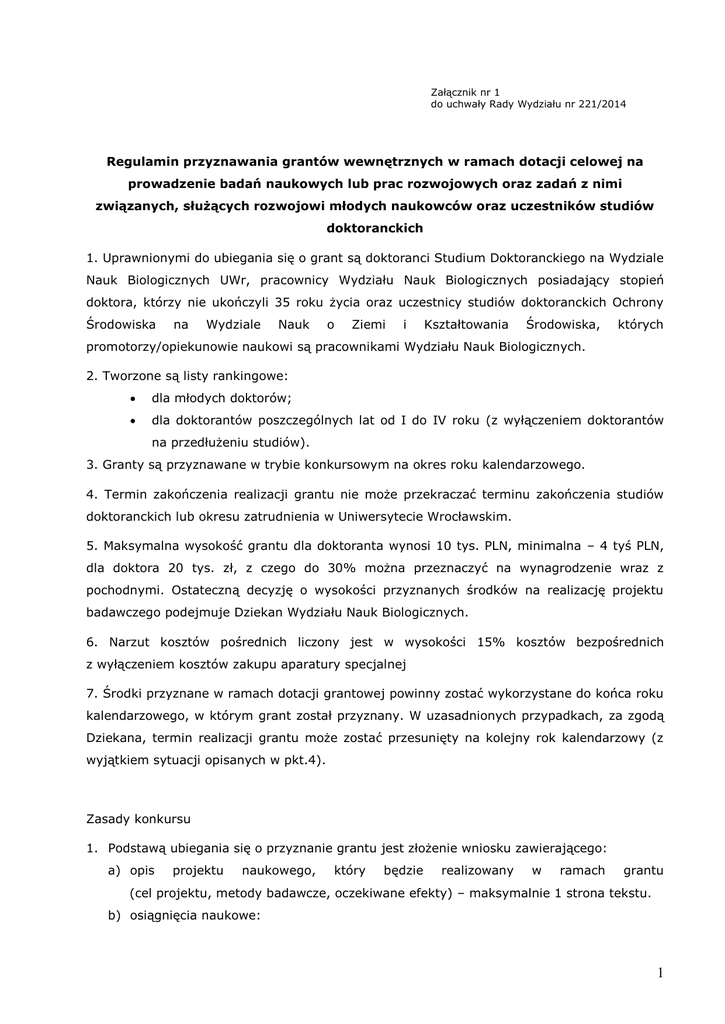 Załącznik nr 1 do uchwały Rady Wydziału nr 221/2014 Regulamin przyznawania grantów wewnętrznych w ramach dotacji celowej na prowadzenie badań naukowych lub prac rozwojowych oraz zadań z nimi związanych, służących rozwojowi młodych naukowców oraz uczestników studiów doktoranckich 1. Uprawnionymi do ubiegania się o grant są doktoranci Studium Doktoranckiego na Wydziale Nauk Biologicznych UWr, pracownicy Wydziału Nauk Biologicznych posiadający stopień doktora, którzy nie ukończyli 35 roku życia oraz uczestnicy studiów doktoranckich Ochrony Środowiska na Wydziale Nauk o Ziemi i Kształtowania Środowiska, których promotorzy/opiekunowie naukowi są pracownikami Wydziału Nauk Biologicznych. 2. Tworzone są listy rankingowe: dla młodych doktorów; dla doktorantów poszczególnych lat od I do IV roku (z wyłączeniem doktorantów na przedłużeniu studiów). 3. Granty są przyznawane w trybie konkursowym na okres roku kalendarzowego. 4. Termin zakończenia realizacji grantu nie może przekraczać terminu zakończenia studiów doktoranckich lub okresu zatrudnienia w Uniwersytecie Wrocławskim. 5. Maksymalna wysokość grantu dla doktoranta wynosi 10 tys. PLN, minimalna – 4 tyś PLN, dla doktora 20 tys. zł, z czego do 30% można przeznaczyć na wynagrodzenie wraz z pochodnymi. Ostateczną decyzję o wysokości przyznanych środków na realizację projektu badawczego podejmuje Dziekan Wydziału Nauk Biologicznych. 6. Narzut kosztów pośrednich liczony jest w wysokości 15% kosztów bezpośrednich z wyłączeniem kosztów zakupu aparatury specjalnej 7. Środki przyznane w ramach dotacji grantowej powinny zostać wykorzystane do końca roku kalendarzowego, w którym grant został przyznany. W uzasadnionych przypadkach, za zgodą Dziekana, termin realizacji grantu może zostać przesunięty na kolejny rok kalendarzowy (z wyjątkiem sytuacji opisanych w pkt.4). Zasady konkursu 1. Podstawą ubiegania się o przyznanie grantu jest złożenie wniosku zawierającego: a) opis projektu naukowego, który będzie realizowany w ramach grantu (cel projektu, metody badawcze, oczekiwane efekty) – maksymalnie 1 strona tekstu. b) osiągnięcia naukowe: 1 Młodzi doktorzy Spis publikacji od 20 pkt MNiSW wzwyż z podaniem liczby punktów za każdą publikację liczoną wg zasad przyjętych przez Wydział (Zarządzenie Dziekana WNB nr 1/2013 z dnia 18 stycznia 2013 roku wprowadzające zasady awansowania i nagradzania pracowników naukowo-dydaktycznych na Wydziale Nauk Biologicznych). Doktoranci Spis wszystkich publikacji z podaniem liczby punktów za każdą publikację liczoną wg zasad przyjętych przez Wydział (Zarządzenie Dziekana WNB nr 1/2013 z dnia 18 stycznia 2013 roku wprowadzające zasady awansowania i nagradzania pracowników naukowo-dydaktycznych na Wydziale Nauk Biologicznych) – punkty przyznawane są za prace opublikowane oraz publikacje elektroniczne z numerem DOI lub opublikowane jako online first c) Podstawowe dane osobowe, daty uzyskania stopnia magistra oraz doktora wraz z informacją o wyróżnieniu doktoratu, uzyskanych nagrodach i udziale w projektach badawczych. d) Kosztorys projektu zaakceptowany przez kierownika Zespołu Badawczego. Wnioski należy składać w sekretariatach jednostek. 2. Złożone materiały zostaną ocenione przez Komisję Konkursową, co będzie podstawą ustalenia rankingu kandydatów. 3. Granty będą rozliczane na podstawie sprawozdania merytorycznego złożonego przez beneficjenta z opinią kierownika Zespołu Badawczego. Grant zostanie uznany za zrealizowany po przyjęciu sprawozdania merytorycznego przez komisję. 4. Rozliczenie finansowe i merytoryczne powinno nastąpić w ciągu miesiąca od daty zakończenia realizacji grantu. 5. W przypadku nierozliczenia grantu z poprzedniej edycji nie można ubiegać się o dofinansowanie w kolejnej edycji grantów młodych. 2