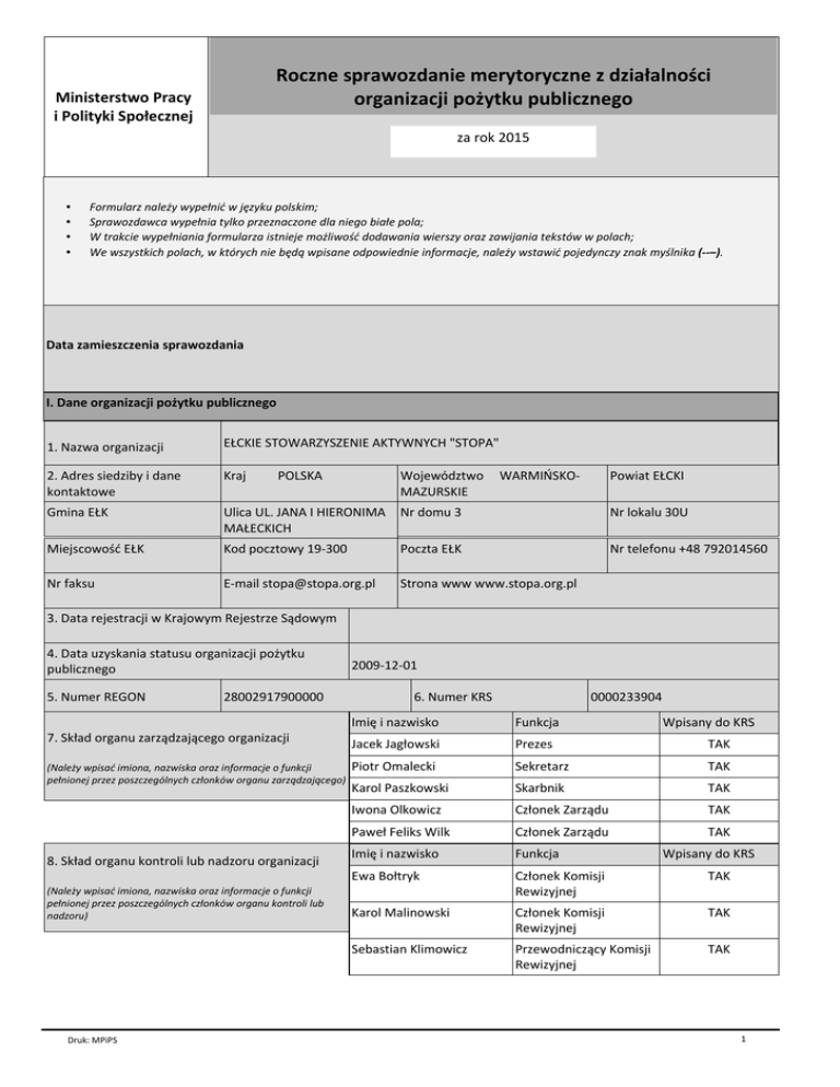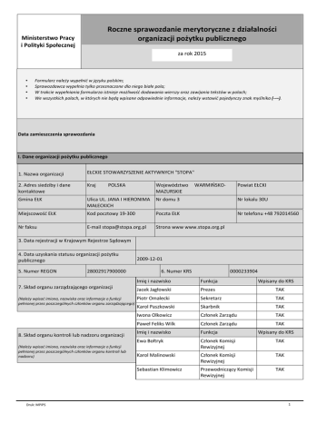 ZŽĐnjŶĞƐƉƌĂǁŽnjĚĂŶŝĞŵĞƌLJƚŽƌLJĐnjŶĞnjĚnjŝĂųĂůŶŽƑĐŝ ŽƌŐĂŶŝnjĂĐũŝƉŽǏLJƚŬƵƉƵďůŝĐnjŶĞŐŽ Ministerstwo Pracy ŝWŽůŝƚLJŬŝ^ƉŽųĞĐnjŶĞũ za rok 2015 • • • • &ŽƌŵƵůĂƌnjŶĂůĞǏLJǁLJƉĞųŶŝđǁũħnjLJŬƵƉŽůƐŬŝŵ͖ ^ƉƌĂǁŽnjĚĂǁĐĂǁLJƉĞųŶŝĂƚLJůŬŽƉƌnjĞnjŶĂĐnjŽŶĞĚůĂŶŝĞŐŽďŝĂųĞƉŽůĂ͖ tƚƌĂŬĐŝĞǁLJƉĞųŶŝĂŶŝĂĨŽƌŵƵůĂƌnjĂŝƐƚŶŝĞũĞŵŽǏůŝǁŽƑđĚŽĚĂǁĂŶŝĂǁŝĞƌƐnjLJŽƌĂnjnjĂǁŝũĂŶŝĂƚĞŬƐƚſǁǁƉŽůĂĐŚ͖ tĞǁƐnjLJƐƚŬŝĐŚƉŽůĂĐŚ͕ǁŬƚſƌLJĐŚŶŝĞďħĚČǁƉŝƐĂŶĞŽĚƉŽǁŝĞĚŶŝĞŝŶĨŽƌŵĂĐũĞ͕ŶĂůĞǏLJǁƐƚĂǁŝđƉŽũĞĚLJŶĐnjLJnjŶĂŬŵLJƑůŶŝŬĂ (--–). Data zamieszczenia sprawozdania /͘ĂŶĞŽƌŐĂŶŝnjĂĐũŝƉŽǏLJƚŬƵƉƵďůŝĐnjŶĞŐŽ 1. Nazwa organizacji B</^dKtZz^E/<dztEz,Η^dKWΗ 2. Adres siedziby i dane kontaktowe Kraj 'ŵŝŶĂB< POLSKA tŽũĞǁſĚnjƚǁŽtZD/F^<KͲ MAZURSKIE WŽǁŝĂƚB</ Ulica UL. JANA I HIERONIMA DB</, Nr domu 3 Nr lokalu 30U DŝĞũƐĐŽǁŽƑđB< Kod pocztowy 19-300 WŽĐnjƚĂB< Nr telefonu +48 792014560 Nr faksu E-mail [email protected] Strona www www.stopa.org.pl ϯ͘ĂƚĂƌĞũĞƐƚƌĂĐũŝǁ<ƌĂũŽǁLJŵZĞũĞƐƚƌnjĞ^ČĚŽǁLJŵ ϰ͘ĂƚĂƵnjLJƐŬĂŶŝĂƐƚĂƚƵƐƵŽƌŐĂŶŝnjĂĐũŝƉŽǏLJƚŬƵ publicznego 5. Numer REGON 28002917900000 ϳ͘^ŬųĂĚŽƌŐĂŶƵnjĂƌnjČĚnjĂũČĐĞŐŽŽƌŐĂŶŝnjĂĐũŝ ;EĂůĞǏLJǁƉŝƐĂđŝŵŝŽŶĂ͕ŶĂnjǁŝƐŬĂŽƌĂnjŝŶĨŽƌŵĂĐũĞŽĨƵŶŬĐũŝ ƉĞųŶŝŽŶĞũƉƌnjĞnjƉŽƐnjĐnjĞŐſůŶLJĐŚĐnjųŽŶŬſǁŽƌŐĂŶƵnjĂƌnjČĚnjĂũČĐĞŐŽͿ ϴ͘^ŬųĂĚŽƌŐĂŶƵŬŽŶƚƌŽůŝůƵďŶĂĚnjŽƌƵŽƌŐĂŶŝnjĂĐũŝ ;EĂůĞǏLJǁƉŝƐĂđŝŵŝŽŶĂ͕ŶĂnjǁŝƐŬĂŽƌĂnjŝŶĨŽƌŵĂĐũĞŽĨƵŶŬĐũŝ ƉĞųŶŝŽŶĞũƉƌnjĞnjƉŽƐnjĐnjĞŐſůŶLJĐŚĐnjųŽŶŬſǁŽƌŐĂŶƵŬŽŶƚƌŽůŝůƵď nadzoru) Druk: MPiPS 2009-12-01 6. Numer KRS 0000233904 /ŵŝħŝŶĂnjǁŝƐŬŽ Funkcja Wpisany do KRS :ĂĐĞŬ:ĂŐųŽǁƐŬŝ Prezes TAK Piotr Omalecki Sekretarz TAK Karol Paszkowski Skarbnik TAK Iwona Olkowicz njųŽŶĞŬĂƌnjČĚƵ TAK WĂǁĞų&ĞůŝŬƐtŝůŬ njųŽŶĞŬĂƌnjČĚƵ TAK /ŵŝħŝŶĂnjǁŝƐŬŽ Funkcja ǁĂŽųƚƌLJŬ njųŽŶĞŬ<ŽŵŝƐũŝ Rewizyjnej TAK Karol Malinowski njųŽŶĞŬ<ŽŵŝƐũŝ Rewizyjnej TAK Sebastian Klimowicz WƌnjĞǁŽĚŶŝĐnjČĐLJ<ŽŵŝƐũŝ Rewizyjnej TAK Wpisany do KRS 1 9. Cele statutowe organizacji ;EĂůĞǏLJŽƉŝƐĂđĐĞůĞŶĂƉŽĚƐƚĂǁŝĞƐƚĂƚƵƚƵŽƌŐĂŶŝnjĂĐũŝͿ 1͘WZKtE//B>EK_/EZK'MBh^WKBF^dt POPRZEZ (MIEDZY INNYMI) WSPARCIE, PROMOCJE I ANIMACJE ^WKBE͕<h>dhZ>E͕K_t/dKt͘ 2͘/BE/EZWKZ<h/W/F^dt͘ 3͘t^W/ZE///^DKZEK_/>K<>E:/Z'/KE>E:͘ 4͘t^W/ZE//ZKtM:WZ^/%/KZK_/͘ 5͘/BE/EZ<h>dhZz/dZz:/Z'/KEh͘ 6͘tDKE/E/WZKDK:/^hZ'/KEhB<Ͳ'KBWͲK><K͕:<K ATRAKCYJNEGO TURYSTYCZNIE. 7͘dtKZE/tKZt^WMBWZzKZ'E/:/WKZKtz,͕ ADMINISTRACJI PUBLICZNEJ ORAZ BIZNESU. 8͘/BE/EZWZdEZ^dtD/%z^<dKZKt'K͘ 9͘t^W/ZE///:EK:^/%hZKWz/hE//hZKW:^</:͘ 10͘t^WKD'E//BFEZK,ZKEz_ZKKt/^< NATURALNEGO. 11͘t^W/ZE/Z'/KE>E:t^WMBWZz'ZE/E:͘ 12͘t^W/ZE/KZ'E/:/WKZKtz,͕D/E/^dZ:/ Wh>/E:KZ^<dKZ/E^htWKz^</tE/htE%dZEz, ZMB&/EE^KtE/͘ 13. INTEGRACJA, PROMOCJA I LOBBOWANIE NA RZECZ ORGANIZACJI WKZKtz,͘ 14͘t^W/ZE/^ZK<KWK:%d:<dztEK_/ Kztd>^</:͕E/DKtE/t^WMBWZzKZ'E/:/ WKZKtz,͘ 15͘t^W/ZE//BF<dzt/h:z,E/&KZD>E'ZhWz DBK/Kt͕K^Kz/'ZhWzDZ'/E>/KtE͘ 16͘t^W/ZE//E/:dzt^WKBEz,EZKZKzEEK_/͕ K,ZKEzZKt//WKDKz^WKBE:͕Z,/>/d:/tKKt: /^WKBE:K^ME/WBEK^WZtEz,/tz<>hKEz, ^WKBE/KZEZZKtK:h>K<>E'K͘ 17͘/B>EK_Eh<Kt͕Eh<KtKͲd,E/E͕tztE/͕ K_t/dKt͕<h>dhZ>Et<Z^/K:%dzDE/E/:^zD STATUTEM. 18͘/BE/EZ^ZK<KWK:%d:<dzt/:/t^/͘ 19. PROMOWANIE I WSPIERANIE ZDROWEGO I AKTYWNEGO TRYBU z/͘ 20͘/E/:KtE//t^W/ZE//BFEZ<dztEz,&KZD WYPOCZYNKU. 21. WSPIERANIE ORGANIZACYJNE, FINANSOWE I RZECZOWE OSÓB &/zEz,/WZtEz,t<Z^,K:%dz,>D/ STOWARZYSZENIA. 1͘WƌŽǁĂĚnjĞŶŝĞŬĂŵƉĂŶŝŝƐƉŽųĞĐnjŶLJĐŚ͕ 2͘KƌŐĂŶŝnjĂĐũŝĨŽƌƵŵǁƐƉſųƉƌĂĐLJƚƌſũƐĞŬƚŽƌŽǁĞũ͕ 3͘<ŽŶĨĞƌĞŶĐũŝƉƌŽŵƵũČĐLJĐŚĂŬƚLJǁŶŽƑđƐƉŽųĞĐnjŶČ͕ 10. Sposób realizacji celów statutowych organizacji 4. Akcje promocyjne subregionu, 5. Udzielanie wsparcia technicznego, lokalowego, szkoleniowego oraz ;EĂůĞǏLJŽƉŝƐĂđƐƉŽƐſďƌĞĂůŝnjĂĐũŝĐĞůſǁƐƚĂƚƵƚŽǁLJĐŚŽƌŐĂŶŝnjĂĐũŝŶĂ ŝŶĨŽƌŵĂĐLJũŶĞŐŽŽƌŐĂŶŝnjĂĐũŽŵƉŽnjĂƌnjČĚŽǁLJŵŽƌĂnjŝŶŝĐũĂƚLJǁŽŵ obywatelskim, podstawie statutu organizacji) 6͘KƌŐĂŶŝnjŽǁĂŶŝĞƐƉŽƚŬĂŷůŝĚĞƌſǁŝĐnjųŽŶŬſǁŽƌŐĂŶŝnjĂĐũŝƉŽnjĂƌnjČĚŽǁLJĐŚ w celu poszerzenia ŝƉŽŐųħďŝĞŶŝĂǁƐƉſųƉƌĂĐLJƉŽŵŝħĚnjLJŽƌŐĂŶŝnjĂĐũĂŵŝ͕ 7͘ŝĂŐŶŽnjħŝƉƌŽǁĂĚnjĞŶŝĞƐƚĂųĞŐŽƌŽnjƉŽnjŶĂǁĂŶŝĂƉŽƚƌnjĞďƑƌŽĚŽǁŝƐŬĂ lokalnego, 8͘WƌŽǁĂĚnjĞŶŝĞĚnjŝĂųĂůŶŽƑĐŝǁLJĚĂǁŶŝĐnjĞũŝŝŶĨŽƌŵĂĐLJũŶĞũ͕ǁƚLJŵ opracowywanie ŝƉƵďůŝŬŽǁĂŶŝĞŵĂƚĞƌŝĂųſǁƉŽƑǁŝħĐŽŶLJĐŚƉƌŽďůĞŵĂƚLJĐĞnjŐŽĚŶĞũnjĐĞůĂŵŝ Stowarzyszenia, 9͘tƐƉſųƉƌĂĐĞnjŝŶƐƚLJƚƵĐũĂŵŝƐĂŵŽƌnjČĚŽǁLJŵŝ͕ƉĂŷƐƚǁŽǁLJŵŝ͕ ŽƌŐĂŶŝnjĂĐũĂŵŝƐƉŽųĞĐnjŶLJŵŝĚnjŝĂųĂũČĐLJŵŝǁnjĂŬƌĞƐŝĞŽďũħƚLJŵĐĞůĂŵŝ Stowarzyszenia, 10͘tƐƉſųƉƌĂĐĞnjŬƌĂũŽǁLJŵŝŝnjĂŐƌĂŶŝĐnjŶLJŵŝƉŽĚŵŝŽƚĂŵŝ zainteresowanymi celami stowarzyszenia, Druk: MPiPS 2 11͘WƌŽǁĂĚnjĞŶŝĞĚnjŝĂųĂůŶŽƑĐŝĞĚƵŬĂĐLJũŶŽʹŽƑǁŝĂƚŽǁĞũ͕ 12͘WƌŽǁĂĚnjĞŶŝĞĚnjŝĂųĂůŶŽƑĐŝĂŶŝŵĂĐLJũŶĞũƐƉŽųĞĐnjĞŷƐƚǁĂ͕ 13͘dǁŽƌnjĞŶŝĞƉųĂƐnjĐnjLJnjŶLJǁƐƉſųƉƌĂĐLJƉŽŵŝħĚnjLJŽƌŐĂŶŝnjĂĐũĂŵŝ ƉŽnjĂƌnjČĚ