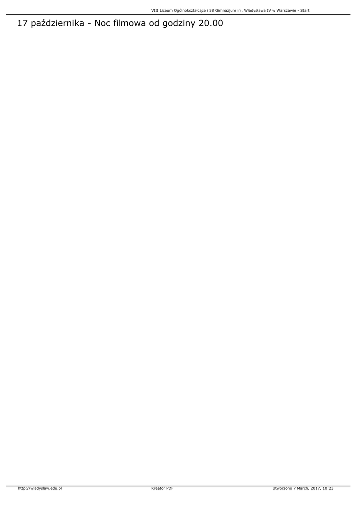 VIII Liceum Ogólnokształcące i 58 Gimnazjum im. Władysława IV w Warszawie - Start 17 października - Noc filmowa od godziny 20.00 http://wladyslaw.edu.pl Kreator PDF Utworzono 7 March, 2017, 10:23