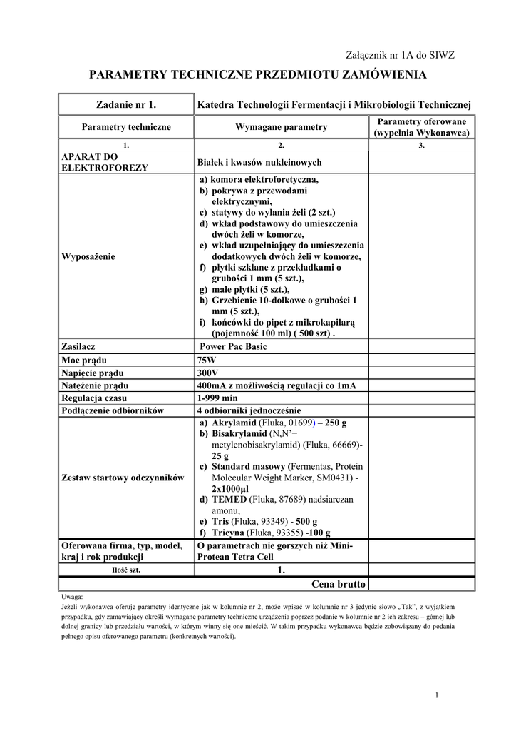 Załącznik nr 1A do SIWZ PARAMETRY TECHNICZNE PRZEDMIOTU ZAMÓWIENIA Zadanie nr 1. Katedra Technologii Fermentacji i Mikrobiologii Technicznej Parametry techniczne Wymagane parametry Parametry oferowane (wypełnia Wykonawca) 1. 2. 3. APARAT DO ELEKTROFOREZY WyposaŜenie Zasilacz Moc prądu Napięcie prądu NatęŜenie prądu Regulacja czasu Podłączenie odbiorników Zestaw startowy odczynników Oferowana firma, typ, model, kraj i rok produkcji Ilość szt. Białek i kwasów nukleinowych a) komora elektroforetyczna, b) pokrywa z przewodami elektrycznymi, c) statywy do wylania Ŝeli (2 szt.) d) wkład podstawowy do umieszczenia dwóch Ŝeli w komorze, e) wkład uzupełniający do umieszczenia dodatkowych dwóch Ŝeli w komorze, f) płytki szklane z przekładkami o grubości 1 mm (5 szt.), g) małe płytki (5 szt.), h) Grzebienie 10-dołkowe o grubości 1 mm (5 szt.), i) końcówki do pipet z mikrokapilarą (pojemność 100 ml) ( 500 szt) . Power Pac Basic 75W 300V 400mA z moŜliwością regulacji co 1mA 1-999 min 4 odbiorniki jednocześnie a) Akrylamid (Fluka, 01699) – 250 g b) Bisakrylamid (N,N’− metylenobisakrylamid) (Fluka, 66669)25 g c) Standard masowy (Fermentas, Protein Molecular Weight Marker, SM0431) 2x1000µl d) TEMED (Fluka, 87689) nadsiarczan amonu, e) Tris (Fluka, 93349) - 500 g f) Tricyna (Fluka, 93355) -100 g O parametrach nie gorszych niŜ MiniProtean Tetra Cell 1. Cena brutto Uwaga: JeŜeli wykonawca oferuje parametry identyczne jak w kolumnie nr 2, moŜe wpisać w kolumnie nr 3 jedynie słowo „Tak”, z wyjątkiem przypadku, gdy zamawiający określi wymagane parametry techniczne urządzenia poprzez podanie w kolumnie nr 2 ich zakresu – górnej lub dolnej granicy lub przedziału wartości, w którym winny się one mieścić. W takim przypadku wykonawca będzie zobowiązany do podania pełnego opisu oferowanego parametru (konkretnych wartości). 1 Zadanie nr 2. Katedra 0chrony Środowiska Rolniczego Parametry techniczne Wymagane parametry Parametry oferowane (wypełnia Wykonawca) 1. 2. 3. MIKROSKOP STEREOSKOPOWY Głowica Okulary Zakres powiększeń Oświetlenie halogenowe Stolik a) dwuoczna, b) obrotowa, c) kątowa d) z płynną zmiana powiększenia a) szt. 2. b) szerokopolowe, c) o powiększeniu 10 x, d) w nasadce okularowej e) o regulowanym rozstawie f) z korekcją dioptryjna kaŜdy Od 7 do 45 x a) górne i dolne, b) pozwalające na obserwacje w świetle przechodzącym i odbitym, c) z płynna regulacją natęŜenia światła Wymienne płytki: szklana matowa i plastikowa czarno-biała Oferowana firma, typ, model, kraj i rok produkcji Ilość szt. 5. Wartość netto (za 5 szt.) Wartość brutto( za 5 szt.) Uwaga: JeŜeli wykonawca oferuje parametry identyczne jak w kolumnie nr 2, moŜe wpisać w kolumnie nr 3 jedynie słowo „Tak”, z wyjątkiem przypadku, gdy zamawiający określi wymagane parametry techniczne urządzenia poprzez podanie w kolumnie nr 2 ich zakresu – górnej lub dolnej granicy lub przedziału wartości, w którym winny się one mieścić. W takim przypadku wykonawca będzie zobowiązany do podania pełnego opisu oferowanego parametru (konkretnych wartości). 2 Zadanie nr 3. Katedra Chemii Parametry techniczne Wymagane parametry Parametry oferowane (wypełnia Wykonawca 1. 2. 3. a) 3 nastawne programy, b) moŜliwość opóźnionego włączenia i wyłączenia, c) moŜliwość pracy cyklicznej Wykonanie komory wewnętrznej stal nierdzewna Obieg powietrza naturalny Objętość wewnętrzna 55 l a) prowadnic – szt. 4. Prowadnice/ półki/ b) półki szt. 2. Nośność 1 półki 20 kg Liczba drzwi szt. 1 od 5oC powyŜej temperatury otoczenia Temperatura robocza do 250oC Odchyłki temperatury od a) w przestrzeni: ±2oC, temperatury roboczej przy b) w czasie: ± 0,3oC zamkniętej klapie powietrza i drzwiach Czas osiągnięcia temperatury 59 minut 250oC przy zamkniętej klapie i napięciu 230 V Liczba wymian powietrza przy 8 150oC Maksymalny pobór mocy 1,3 kW Interfejs RS232 Sterowanie Sterownie mikroprocesorowe Zakres czasu pracy 99 godzin 59 minut alarm dźwiękowy i wizualny Termostat bezpieczeństwa Klasy 2 Oferowana firma, typ, model, O parametrach nie gorszych niŜ Ecocell kraj i rok produkcji 55 SUSZARKA LABORATORYJNA Ilość szt. 1. Cena brutto Uwaga: JeŜeli wykonawca oferuje parametry identyczne jak w kolumnie nr 2, moŜe wpisać w kolumnie nr 3 jedynie słowo „Tak”, z wyjątkiem przypadku, gdy zamawiający określi wymagane parametry techniczne urządzenia poprzez podanie w kolumnie nr 2 ich zakresu – górnej lub dolnej granicy lub przedziału wartości, w którym winny się one mieścić. W takim przypadku wykonawca będzie zobowiązany do podania pełnego opisu oferowanego parametru (konkretnych wartości). 3 Zadanie nr 4. Katedra Chłodnictwa i Koncentratów SpoŜywczych Parametry techniczne Wymagane parametry Parametry oferowane (wypełnia Wykonawca 1. 2. 3. WYTRZĄSARKA DO PROBÓWEK TYPU WORTEX Praca Głowica Częstość drgań Regulacja obrotów Zakres obrotów Inne Moc Oferowana firma, typ, model, kraj i rok produkcji Ilość szt. W systemie ciągłym i czasowym (pod wpływem nacisku na głowicę) Gumowa W zakresie 0 – 40 Hz Płynna 100 – 2400 rpm WyposaŜona w gumowe nóŜki umoŜliwiające przyssanie urządzenia do powierzchni blatu 45 W O parametrach nie gorszych niŜ TK3S 1. Cena brutto Uwaga: JeŜeli wykonawca oferuje parametry identyczne jak w kolumnie nr 2, moŜe wpisać w kolumnie nr 3 jedynie słowo „Tak”, z wyjątkiem przypadku, gdy zamawiający określi wymagane parametry techniczne urządzenia poprzez podanie w kolumnie nr 2 ich zakresu – górnej lub dolnej granicy lub przedziału wartości, w którym winny się one mieścić. W takim przypadku wykonawca będzie zobowiązany do podania pełnego opisu oferowanego parametru (konkretnych wartości). 4