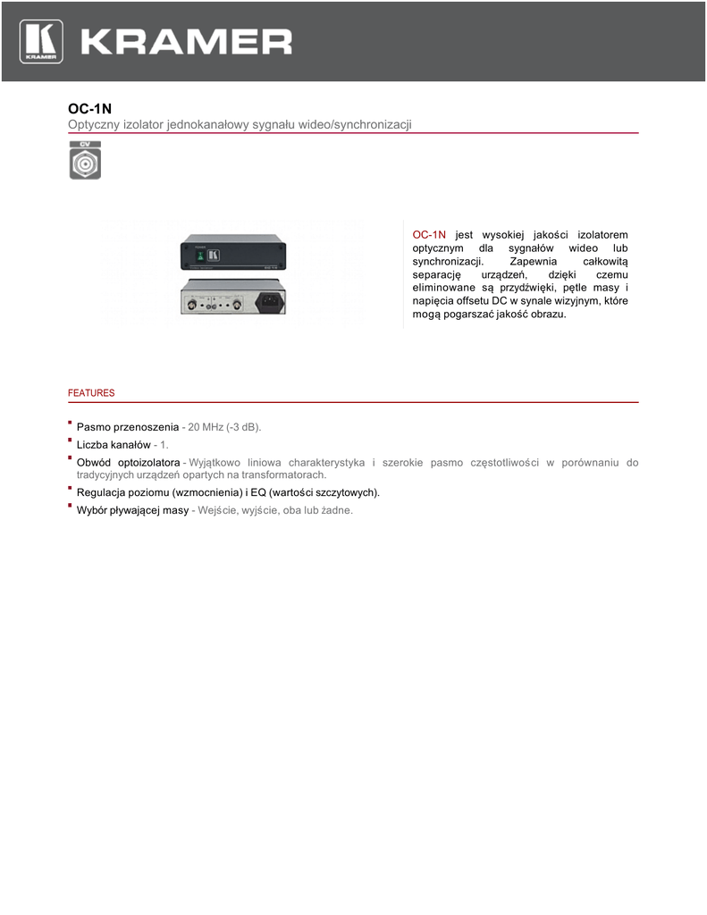OC-1N Optyczny izolator jednokanałowy sygnału wideo/synchronizacji OC-1N jest wysokiej jakości izolatorem optycznym dla sygnałów wideo lub synchronizacji. Zapewnia całkowitą separację urządzeń, dzięki czemu eliminowane są przydźwięki, pętle masy i napięcia offsetu DC w synale wizyjnym, które mogą pogarszać jakość obrazu. FEATURES Pasmo przenoszenia - 20 MHz (-3 dB). Liczba kanałów - 1. Obwód optoizolatora - Wyjątkowo liniowa charakterystyka i szerokie pasmo częstotliwości w porównaniu do tradycyjnych urządzeń opartych na transformatorach. Regulacja poziomu (wzmocnienia) i EQ (wartości szczytowych). Wybór pływającej masy - Wejście, wyjście, oba lub żadne. OC-1N TECHNICAL SPECIFICATIONS WEJŚCIE: 1 Kompozyt wideo, 1 Vpp/75 Ω na złączu BNC. WYJŚCIE: 1 Kompozyt wideo, 1 Vpp/75 Ω na złączu BNC. PASMO PRZENOSZENIA (-3dB): 20 MHz. STOSUNEK SYGNAŁ/SZUM: 69 dB. ŹRÓDŁO ZASILANIA: 230 V AC, 50/60 Hz (115 V AC w USA), 2,3 VA. WYMIARY: 16.5 cm x 12 cm x 4.5 cm (6.5” x 4.7” x 1.8”) szer., głęb., wys. MASA: Ok. 0.72 kg (1.6 lbs.). AKCESORIA: Przewód zasilający. OPCJE: Mocowanie do szaf rack 19" RK-1.