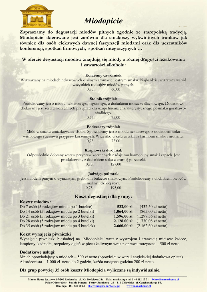 Miodopicie 22.02.2012 Zapraszamy do degustacji miodów pitnych zgodnie ze staropolską tradycją. Miodopicie skierowane jest zarówno dla smakoszy wykwintnych trunków jak również dla osób ciekawych dawnej fascynacji miodami oraz dla uczestników konferencji, spotkań firmowych, spotkań integracyjnych … W ofercie degustacji miodów znajdują się miody o różnej długości leżakowania i zawartości alkoholu: Korzenny czwórniak Wytwarzany na miodach nektarowych o silnym aromacie i ostrym smaku. Najbardziej wytrawny wśród wszystkich rodzajów miodów pitnych. 0,75l 60,00 Stolnik trójniak Produkowany jest z miodu nektarowego, łagodnego, z dodatkiem moszczu śliwkowego. Dodatkowo dodawany jest zestaw korzennych przypraw dla uzupełnienia charakterystycznego posmaku gorzkawosłodkiego. 0,75l 75,00 Podczaszy trójniak Miód w smaku umiarkowanie słodki. Sporządzany jest z miodu nektarowego z dodatkiem soku wiśniowego i zestawu przypraw korzennych. Wszystko w celu uzyskania harmonii smaku i aromatu. 0,75l 75,00 Kurpiowski dwójniak Odpowiednio dobrany zestaw przypraw korzennych nadaje mu harmonijny smak i zapach. Jest produkowany z dodatkiem soku z czarnej porzeczki. 0,75l 127,00 Jadwiga półtorak Jest miodem pitnym o wyrazistym, głębokim bukiecie smakowym. Produkowany z dodatkiem owoców maliny i dzikiej róży. 0,75l 195,00 Koszt degustacji dla grupy: Koszty miodów: Do 7 osób (5 rodzajów miodu po 1 butelce) Do 14 osób (5 rodzajów miodu po 2 butelki) Do 21 osób (5 rodzajów miodu po 3 butelki) Do 28 osób (5 rodzajów miodu po 4 butelki) Do 35 osób (5 rodzajów miodu po 5 butelek) 532,00 zł 1.064,00 zł 1.596,00 zł 2.128,00 zł 2.660,00 zł (432,50 zł netto) (865,00 zł netto) (1.297,56 zł netto) (1.730,08 zł netto) (2.162,60 zł netto) Koszt wynajęcia piwniczki Wynajęcie piwniczki biesiadnej na „Miodopicie” wraz z wystrojem i aranżacją miejsca: świece, lampiony, kadzidła, rozpalony ogień w piecu żeliwnym wraz z oprawą muzyczną – 500 zł netto. Dodatkowe usługi: Mnich opowiadający o miodach – 500 zł netto (opowieści w wersji angielskiej dodatkowa opłata) Akordeonista - 1.000 zł netto do 2 godzin, każda następna godzina 200 zł netto. Dla grup powyżej 35 osób koszty Miodopicia wyliczane są indywidualnie. Manor House Sp. z o.o. 97-500 Radomsko ul. Ks. Kościowa 24a, Dział marketingu tel. 0 44 682 12 21 [email protected] Pałac Odrowążów Stajnia Platera Termy Zamkowe 26 – 510 Chlewiska ul. Czachowskiego 56, Recepcja 48 - 628 70 61 [email protected] www.manorhouse.pl