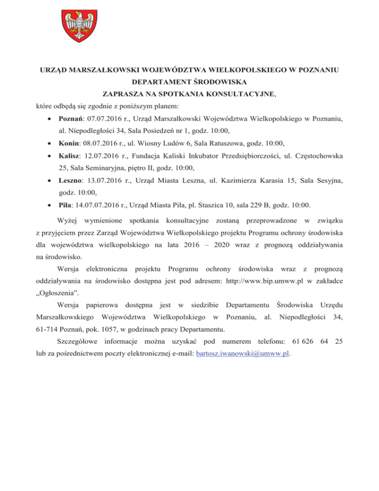 URZ D MARSZAŁKOWSKI WOJEWÓDZTWA WIELKOPOLSKIEGO W POZNANIU DEPARTAMENT RODOWISKA ZAPRASZA NA SPOTKANIA KONSULTACYJNE, które odb d si zgodnie z poni szym planem: • Pozna : 07.07.2016 r., Urz d Marszałkowski Województwa Wielkopolskiego w Poznaniu, al. Niepodległo ci 34, Sala Posiedze nr 1, godz. 10:00, • Konin: 08.07.2016 r., ul. Wiosny Ludów 6, Sala Ratuszowa, godz. 10:00, • Kalisz: 12.07.2016 r., Fundacja Kaliski Inkubator Przedsi biorczo ci, ul. Cz stochowska 25, Sala Seminaryjna, pi tro II, godz. 10:00, • Leszno: 13.07.2016 r., Urz d Miasta Leszna, ul. Kazimierza Karasia 15, Sala Sesyjna, godz. 10:00, • Piła: 14.07.07.2016 r., Urz d Miasta Piła, pl. Staszica 10, sala 229 B, godz. 10:00. Wy ej wymienione spotkania konsultacyjne zostan przeprowadzone w zwi zku z przyj ciem przez Zarz d Województwa Wielkopolskiego projektu Programu ochrony rodowiska dla województwa wielkopolskiego na lata 2016 – 2020 wraz z prognoz oddziaływania na rodowisko. Wersja elektroniczna projektu Programu ochrony rodowiska wraz z prognoz oddziaływania na rodowisko dost pna jest pod adresem: http://www.bip.umww.pl w zakładce „Ogłoszenia”. Wersja papierowa dost pna jest w siedzibie Departamentu Marszałkowskiego Województwa Wielkopolskiego w Poznaniu, rodowiska Urz du al. Niepodległo ci 34, 61-714 Pozna , pok. 1057, w godzinach pracy Departamentu. Szczegółowe informacje mo na uzyska pod numerem telefonu: 61 626 64 25 lub za po rednictwem poczty elektronicznej e-mail: [email protected].