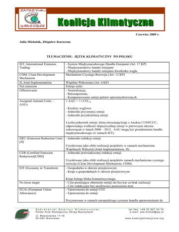 Koalicja Klimatyczna Czerwiec 2009 r. Julia Michalak, Zbigniew Karaczun TŁUMACZENIE: JĘZYK KLIMATYCZNY PO POLSKU IET, International Emission Trading CDM, Clean Development Mechanizm JI, Joint Implementation Net emission Offsetowanie Assigned Amount Units – AAUs - System Międzynarodowego Handlu Emisjami (Art. 17 KP) - Międzynarodowy handel emisjami - Międzynarodowy handel emisjami dwutlenku wegla Mechanizm Czystego Rozwoju (Art. 12 KP) Wspólne Wdrożenia (Art. 6 KP) Emisje netto - Neutralizacja, - Rekompensata, - Kompensowanie emisji państw uprzemysłowionych 1 AAU = 1 t CO2 eq - Kredyty węglowe - Jednostki przyznanej emisji - Jednostki przydzielonej emisji Liczba jednostek emisji, którą otrzymują kraje z Aneksu I UNFCCC, odpowiadaja wielkości dopuszczalnej emisji w pierwszym okresie zobowiązań w latach 2008 – 2012. AAU mogą być przedmiotem handlu międzynarodowego (w ramach IET). ERU (Emission Reduction Unit) - Jednostki redukcji emisji [JI] Uzyskiwane jako efekt realizacji projektów w ramach mechanizmu Wspólnych Wdrożeń (Joint Implementation, JI). CER (Certified Emission - Jednostki poświadczonej redukcji emisji Reduction)[CDM] Uzyskiwane jako efekt realizacji projektów ramach mechanizmu czystego rozwoju (Clean Development Mechanizm, CDM). EIT (Economy in Transition) - Gospodarka w okresie przejściowym - Kraje o gospodarkach w okresie przejściowym No loose target EUAs (European Union Allowances) Kraje byłego bloku komunistycznego. - Cele premiujące obniżenie emisji ale bez kar za brak realizacji - Cele redukcyjne bez możliwości poniesienia strat - Uprawnienia do emisji CO2 - Uprawnienia do emisji Przyznawane w ramach europejskiego systemu handlu uprawnieniami do _______________________________________________________________________________________________________________ Sekretariat Koalicji Klimatycznej: tel./fax: +48 22 827 33 70 Polski Klub Ekologiczny Okręg Mazowiecki e-mail: [email protected] ul. Mazowiecka 11/16 00-052 W arszawa www.koalicjaklimatyczna.org EU ETS (European Union Greenhouse Gas Emission Trading System) Negative and zero-cost (“no regret”) measures MRV emisji (EU ETS). - Europejski / Wspólnotowy / System handlu uprawnieniami do emisji - Europejski / Wspólnotowy / System handlu emisjami Pierwszy na świecie międzynarodowy rynek dla emisji dwutlenku węgla. - Działania, które nie wymagają nakładów finansowych - System pomiaru, monitoringu i weryfikacji Carbon market mechanism - Elastyczne mechanizmy redukcji emisji - Mechanizmy elastyczności - Mechanizmy z Kioto - Rynkowe mechanizmy redukcji emisji Cap and trade - limit i handel - ograniczenie-handel NAP (National Allocation Plans) Marginal abatement cost Hot air Command-and-control system No lose target sectoral crediting mechanism Popularna nazwa mechanizmu handlu emisjami - oznacza przyznanie źródłom emisji pewnej puli uprawnień do emisji i zgoda na ich obrót na rynku Krajowe Plany Alokacji Wszystkie państwa członkowskie EU ETS musiały przygotować w 2004 roku. - Krańcowe koszty redukcji emisji (termin ekonomiczny) - Redukcja emisji uzyskana przez niektóre kraje (przede wszystkim postkomunistyczne) jako efekt transformacji społeczno - gospodarczej, a nie jako efekt wdrożenia programów ochrony klimatu. - Instrumenty nakazowo - kontrolne (mechanizmy prawne, nakazy, standardy) Mechanizm ustanawiający cele redukcyjne w określonych gałęziach przemysłu premiujące obniżenie emisji, bez kar za ich niewypełnienie. Transakcje oparte na limitach emisji – jednostki emisji oferujące ‘prawo do zanieczyszczania’, które wprowadzane są przez ciała regulujące w ramach projektów typu cap-and-trade. (EU ETS) Transakcje oparte na projektach – offsetowe jednostki emisji, których celem jest niwelowanie lub neutralizacja emisji gazów cieplarnianych w jednym miejscu poprzez uniknięcie takiej emisji w innym miejscu. (CDM i JI) _______________________________________________________________________________________________________________ Sekretariat Koalicji Klimatycznej: tel./fax: +48 22 827 33 70 Polski Klub Ekologiczny Okręg Mazowiecki e-mail: [email protected] ul. Mazowiecka 11/16 00-052 W arszawa www.koalicjaklimatyczna.org