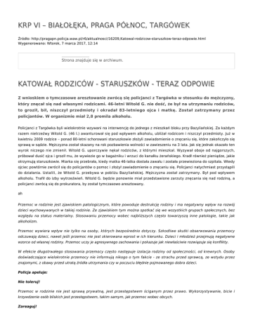KRP VI – BIAŁOŁĘKA, PRAGA PÓŁNOC, TARGÓWEK Źródło: http://pragapn.policja.waw.pl/r6/aktualnosci/16209,Katowal-rodzicow-staruszkow-teraz-odpowie.html Wygenerowano: Wtorek, 7 marca 2017, 12:14 Strona znajduje się w archiwum. KATOWAŁ RODZICÓW - STARUSZKÓW - TERAZ ODPOWIE Z wnioskiem o tymczasowe aresztowanie zwrócą się policjanci z Targówka w stosunku do mężczyzny, który znęcał się nad własnymi rodzicami. 46-letni Witold G. nie dość, że był na utrzymaniu rodziców, to groził, bił, niszczył przedmioty i okradał 83-letniego ojca i matkę. Został zatrzymany przez policjantów. W organizmie miał 2,8 promila alkoholu. Policjanci z Targówka byli wielokrotnie wzywani na interwencję do jednego z mieszkań bloku przy Bazyliańskiej. Za każdym razem nietrzeźwy Witold G. (46 l.) awanturował się pod wpływem alkoholu, ubliżał rodzicom i niszczył przedmioty. Już w kwietniu 2009 rodzice – ponad 80-letni schorowani staruszkowie złożyli zawiadomienie o znęcaniu się, które zakończyło się sprawą w sądzie. Mężczyzna został skazany na rok pozbawienia wolności w zawieszeniu na 3 lata. Jak się jednak okazało ten wyrok niczego nie zmienił. Witold G. uporczywie nękał rodziców, z którymi mieszkał. Wyzywał oboje od najgorszych, próbował dusić ojca i groził mu, że wywiezie go w bagażniku i wrzuci do kanałku żerańskiego. Kradł również pieniądze, jakie otrzymują staruszkowie. Miarka się przebrała, kiedy matka 46-latka dostała zawału i została przewieziona do szpitala. Wtedy ojciec powtórnie zwrócił się do policjantów o pomoc i złożył zawiadomienie o znęcaniu się. Policjanci natychmiast przystąpili do działania. Ustalili, że Witold G. przebywa w pobliżu Bazyliańskiej. Mężczyzna został zatrzymany. Był pod wpływem alkoholu. Trafił do izby wytrzeźwień. Witold G. będzie ponownie miał przedstawione zarzuty znęcania się nad rodziną, a policjanci zwrócą się do prokuratora, by został tymczasowo aresztowany. ah Przemoc w rodzinie jest zjawiskiem patologicznym, które powoduje destrukcję rodziny i ma negatywny wpływ na rozwój dzieci wychowywanych w takiej rodzinie. Ze zjawiskiem tym można spotkać się we wszystkich grupach społecznych, bez względu na status materialny. Stosowaniu przemocy wobec najbliższych często towarzyszą inne patologie, takie jak alkoholizm. Przemoc wywiera wpływ nie tylko na osoby, których bezpośrednio dotyczy. Szkodliwe skutki obserwowania przemocy odczuwają dzieci, nawet jeśli przemoc nie jest skierowana wprost w ich kierunku. Dzieci i młodzież przejmują negatywne wzorce od własnej rodziny. Przemoc uczy je agresywnego zachowania i pokazuje jak niewłaściwie rozwiązuje się konflikty. W efekcie długotrwałego stosowania przemocy często następuje izolacja rodziny od społeczności, od krewnych. Osoby doświadczające wielokrotnie przemocy nie informują nikogo o tym fakcie - ze strachu przed sprawcą, ze wstydu przez znajomymi, z obawy przed utratą źródła utrzymania czy w poczuciu błędnie pojmowanego dobra dzieci. Policja apeluje: Nie toleruj! Przemoc w rodzinie nie jest sprawą prywatną, jest przestępstwem ściganym przez prawo. Wykorzystywanie, bicie i krzywdzenie osób bliskich jest przestępstwem, takim samym, jak przemoc wobec obcych. Zareaguj! Przemoc domowa rzadko jest incydentem jednorazowym. Jeżeli wobec sprawcy nie podejmie się natychmiastowych, stanowczych działań - przemoc się powtórzy. Policja zwykle jest wzywana w ekstremalnych sytuacjach, czasami zbyt późno. Pamiętaj! Masz prawo bronić się przed osobą, która krzywdzi Ciebie i Twoją rodzinę. Ocena: 0/5 (0) Tweetnij