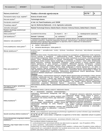 Rok akademicki: Grupa przedmiotów: 2016/2017 Numer katalogowy: Nazwa przedmiotu1): Nauka o drewnie egzotycznym Tłumaczenie nazwy na jęz. angielski3): Science of exotic wood Kierunek studiów4): Technologia drewna 5) Koordynator przedmiotu : ECTS 2) 5 dr hab. inż. Paweł Kozakiewicz, prof. SGGW 6) Prowadzący zajęcia : mgr inż. Bartłomiej Rębkowski, dr inż. Agnieszka Laskowska Jednostka realizująca7): Wydział Technologii Drewna, Katedra Nauki o Drewnie i Ochrony Drewna, Zakład Nauki o Drewnie Wydział, dla którego przedmiot jest realizowany8): - Status przedmiotu9): a) przedmiot kierunkowy 10) b) stopień 2, rok 1 11) Cykl dydaktyczny : Semestr 1 (zimowy) Założenia i cele przedmiotu12): Przedstawienie zagadnień związanych z użytkowaniem zasobów leśnych oraz międzynarodowego handlu produktami drzewnymi. Znajomość właściwości fizycznych, mechanicznych i obróbczych wybranych rodzajów i gatunków drewna egzotycznego pozwalająca na optymalny dobór w zależności od zastosowania i przewidywanych warunków użytkowania. Formy dydaktyczne, liczba godzin13): Jęz. wykładowy : c) niestacjonarne (zaoczne) a) wykład; liczba godzin 21; b) ćwiczenia laboratoryjne; liczba godzin 21; polski Metody dydaktyczne14): przekazywanie i porządkowanie wiedzy, dyskusje, konsultacje, obserwacje, indywidualne prezentacje studentów Pełny opis przedmiotu15): Wykłady Zbiorowiska leśne świata. Charakterystyka bazy surowcowej ze szczególnym uwzględnieniem strefy tropikalnej. Ochrona przyrody a pozyskanie i międzynarodowy handel drewnem (zrównoważone użytkowanie różnorodności biologicznej). Wpływ warunków wzrostu drzew tropikalnych na ich pokrój i strukturę tworzonego drewna. Cechy charakterystyczne w budowie makroskopowej i mikroskopowej drewna egzotycznego. Szczegółowa analiza budowy drewna tropikalnego w porównaniu do drewna z drzew strefy umiarkowanej. Nazwy botaniczne i handlowe. Normalizacja. Pozyskanie i handel drewnem w różnych częściach świata. Drewno egzotyczne na rynku krajowym i europejskim. Właściwości fizyczne, mechaniczne i wybrane właściwości chemiczne wybranych gatunków drewna egzotycznego. Odporność na działanie czynników biotycznych i abiotycznych. Trwałość drewna. Wady występujące w drewnie egzotycznym i ich wpływ na obróbkę, suszenie, klejenie, impregnację i uszlachetnianie. Technologie przerobu drewna egzotycznego w tym roślin jednoliściennych (bambusy i palmy). Główne kierunki zastosowań drewna egzotycznego w Polsce (ze szczególnym uwzględnieniem meblarstwa). Zastosowania specjalistyczne drewna egzotycznego. Drewno egzotyczne obiektach zabytkowych i znaleziskach archeologicznych. Ćwiczenia Szczegóły budowy i rozpoznawanie wybranych rodzajów drewna egzotycznego pochodzącego z Afryki, Ameryki Środkowej i południowej oraz Azji i Oceanii (ok. 40 rodzajów drewna obecnych na rynku europejskim) oraz podstawowe informacje z zakresu jego właściwości, obróbki. Optymalizacja doboru poznanego drewna w zależności od przeznaczenia – warunków przyszłego użytkowania oraz pożądanych właściwości fizycznych i mechanicznych. Referaty przygotowywane przez studentów - inne rodzaje i gatunki drewna egzotycznego (nazewnictwo, pozyskanie, właściwości fizyczne i mechaniczne, wybrane właściwości chemiczne, wykorzystanie, obróbka, klejenie, uszlachetnianie powierzchni, impregnacja, suszenie). Wymagania formalne (przedmioty wprowadzające)16): Brak (nie) 17) Założenia wstępne : Podstawowa wiedza z zakresu anatomii i właściwości drewna Efekty kształcenia18): 01 – Zrozumienie znaczenia zrównoważanego użytkowania różnorodności biologicznej oraz jego zagrożeniach. 02 - Utrwalenie wiadomości z zakresu anatomii roślin drzewiastych oraz budowy drewna, jego właściwości i zastosowań. 03 Nabycie umiejętności rozpoznawania makroskopowego najważniejszych rodzajów drewna egzotycznego obecnego na rynku krajowym i europejskim. 04 - Nabycie umiejętności klasyfikacji i pomiaru wad oraz oceny ich wpływu na właściwości i możliwości wykorzystania drewna. 05 - Umiejętność wskazania najbardziej racjonalnych zastosowań danego rodzaju drewna w oparciu o znajomość jego właściwości fizycznych, mechanicznych i technologicznych lub optymalnego doboru drewna w zależności od stawianych wymagań i przewidywanych warunków użytkowania. 06 – Nabycie umiejętności wyszukiwania, zrozumienia oraz analizy i twórczego wykorzystania potrzebnych informacji a także ich prezentacji w zrozumiałej i przejrzystej formie 05, 06 - ocena umiejętności opracowania przydzielonego zagadnienia (w postaci referatu) i jego samodzielnej Sposób weryfikacji efektów kształcenia : prezentacji oraz aktywności na zajęciach 19) 01, 02, 03, 04, 05 – ocena wiedzy i umiejętności na egzaminie w formie testu i odpowiedzi ustnych na pytania problemowe Forma dokumentacji osiągniętych efektów formularze kolokwialne i egzaminacyjne, prezentacje referatów, karty ocen kształcenia 20): Elementy i wagi mające wpływ na ocenę końcową21): Do weryfikacji efektów kształcenia służą: 1. ocena przygotowania i prezentacji referatu oraz aktywności na zajęciach – max 25 punktów (50%), 2. ocena z egzaminu – maksymalnie 25 punktów (50%) Student który nie zdobył minimalnej wymaganej liczby punktów z referatu (min 10 punktów) mimo zdobycia najwyższych not z pozostałych elementów nie uzyskuje pozytywnej oceny z przedmiotu. Minimalna liczba punktów jaką należy zdobyć na egzaminie wynosi 12. Miejsce realizacji zajęć22): Sala wykładowa, Laboratorium drewna egzotycznego Literatura podstawowa i uzupełniająca23): 1. Jankowska A., Kozakiewicz P., Szczęsna M., 2012: Drewno egzotyczne – przewodnik do ćwiczeń. Wydawnictwo SGGW. Warszawa. 2. Kozakiewicz P., Noskowiak A., Pióro P., 2012: Atlas drewna podłogowego. Wydawnictwo Profii-Press. Warszawa. 3. Wangenführ R., 2007: Holzatlas. 6., bearbeitete und er
