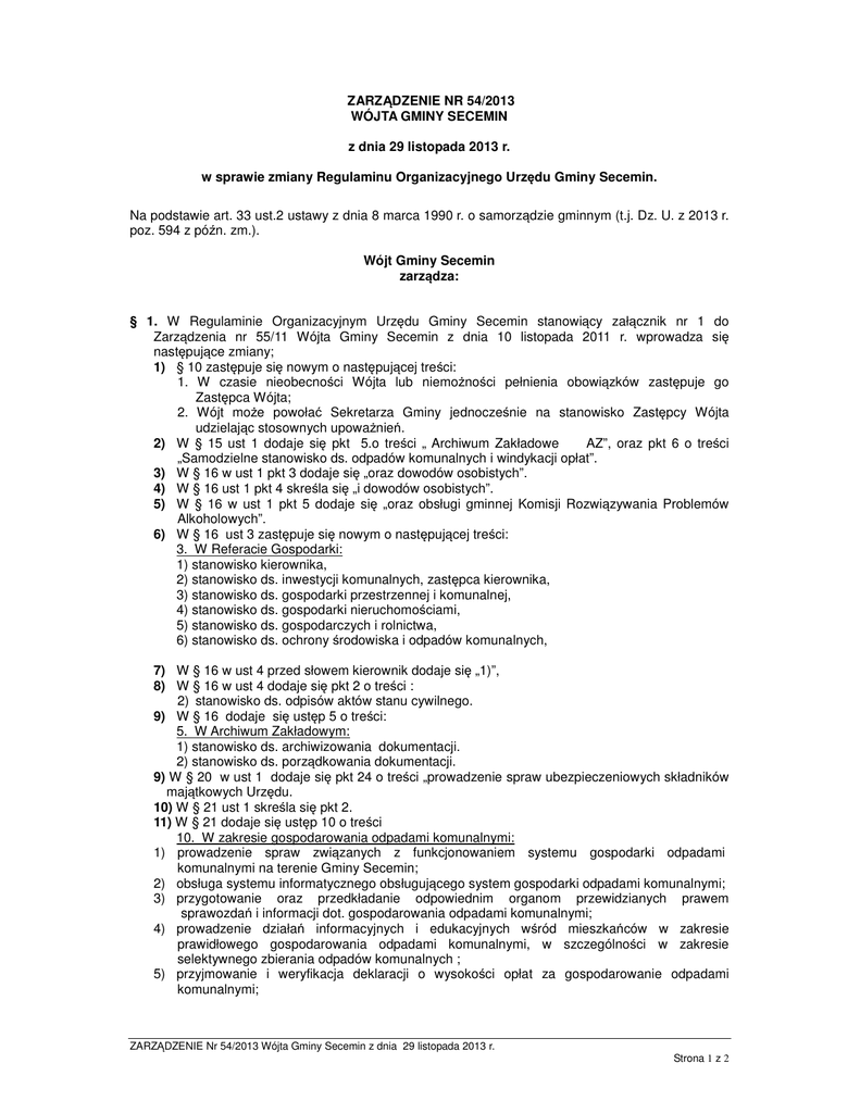 ZARZĄDZENIE NR 54/2013 WÓJTA GMINY SECEMIN z dnia 29