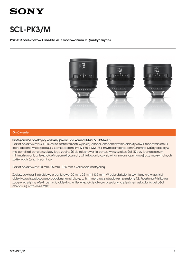 SCL-PK3/M Pakiet 3 obiektywów CineAlta 4K z mocowaniem PL (metrycznych) Omówienie Profesjonalne obiektywy wysokiej jakości do kamer PMW-F55 i PMW-F5 Pakiet obiektywów SCL-PK3/M to zestaw trzech wysokiej jakości, ekonomicznych obiektywów z mocowaniem PL, które idealnie współpracują z kamkorderami PMW-F55, PMW-F5 i innymi kamkorderami CineAlta. Każdy obiektyw ma certyfikat potwierdzający jego zdolność do rejestrowania obrazu w rozdzielczości 4K przy jednoczesnym minimalizowaniu zniekształceń geometrycznych, winietowania czy zjawiska zmiany ogniskowej przy maksymalnych zbliżeniach (ang. breathing). Pakiet obiektywów 20 mm, 25 mm i 135 mm z kalibracją metryczną Zestaw zawiera 3 obiektywy o ogniskowej 20 mm, 25 mm i 135 mm. W celu ułatwienia wymiany we wszystkich obiektywach zastosowano podobną konstrukcję, w tym metalową obudowę i przesłonę T2. Przesłona 9-listkowa zapewnia piękny efekt rozmycia obiektów w tle w kształcie otworu przesłony, a pierścień ustawiania ostrości obraca się w zakresie 240°. SCL-PK3/M 1 Funkcje • Zestaw 3 wysokiej jakości obiektywów z mocowaniem PL i kalibracją metryczną Zestaw SCL-PK3/M zawiera 3 obiektywy o ogniskowej 20 mm, 25 mm i 135 mm. Z kolei zestaw SCL-PK3/F zawiera te same obiektywy, ale z kalibracją w stopach (jednostka brytyjska). • Rozdzielczość 4K w kamerach CineAlta Wszystkie wysokiej jakości obiektywy z mocowaniem PL bezproblemowo współpracują z kamkorderami PMW-F55, PMW-F5 i innymi modelami z rodziny CineAlta. Każdy obiektyw ma certyfikat rejestrowania obrazu z rozdzielczością 4K przy minimalizacji zniekształceń geometrycznych, winietowania i zjawiska zmiany ogniskowej przy maksymalnych zbliżeniach. • Solidna konstrukcja zapewniająca doskonałe rezultaty Wszystkie obiektywy mają podobną konstrukcję, w tym metalową obudowę i przesłonę T2. Przesłona 9listkowa zapewnia piękny efekt rozmycia obiektów w tle w kształcie otworu przesłony, a pierścień ustawiania ostrości obraca się w zakresie 240°. Wszystkie 3 obiektywy charakteryzują się taką samą kompaktową konstrukcją, w tym identycznym rozmieszczeniem pierścieni, co zapewnia łatwą wymianę obiektywu bez konieczności zmiany położenia akcesoriów, takich jak np. moduł utrzymujący ostrość. • Duża elastyczność w wyborze obiektywów do kamkorderów PMW-F55 i PMW-F5 Kamkordery PMW-F55 i PMW-F5 doskonale współpracują z pakietem obiektywów SCL-PK3/M. Ponadto po odłączeniu zawartego w zestawie adaptera mocowania PL do kamkorderów PMW-F55 i PMW-F5 można bezpośrednio dołączać obiektywy z mocowaniem FZ. Używając adapterów mocowania innych firm, można również dołączać obiektywy z mocowaniem SLR i DSLR bez pogorszenia jakości optycznej. Zapewnia to ogromną elastyczność w zakresie wyboru obiektywu. SCL-PK3/M 2 Zgodne produkty Kamera cyfrowa PMW-F55 Kompaktowa kamera CineAlta z przetwornikiem CMOS Super 35 mm 4K rejestrująca materiał HD/2K/4K na karcie pamięci SxS i generująca 16-bitowy sygnał wyjściowy RAW 2K/4K F65 Kamera SRMASTER Super 35 mm 8K z matrycą CMOS F65RS Zestaw produkcji na ż ywo F65 4K i HD Kamery systemowe 4K i HD F65 Live System Zestaw produkcji na ż ywo F65 4K i HD PMW-F5 Kompaktowa kamera CineAlta z przetwornikiem CMOS Super 35 mm 4K rejestrująca materiał HD/2K na karcie pamięci SxS i generująca 16-bitowy sygnał wyjściowy RAW 2K/4K © 2016 Sony Corporation. Wszystkie prawa zastrzeżone. Zabrania się reprodukcji całości lub fragmentów niniejszej publikacji bez pisemnego zezwolenia. Cechy i dane techniczne mogą ulec zmianie. Waga i wymiary są podane w przybliżeniu. Wszystkie znaki towarowe stanowią własność odpowiednich właścicieli. PMW-F55LIVE Kompaktowa kamera CineAlta z przetwornikiem CMOS Super 35 mm 4K rejestrująca materiał HD/2K/4K na karcie pamięci SxS i generująca 16-bitowy sygnał wyjściowy RAW 2K/4K SCL-PK3/M 3