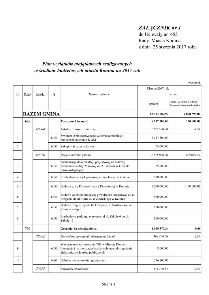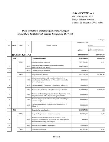 ZAŁĄCZNIK nr 1 do Uchwały nr 455 Rady Miasta Konina z dnia 25 stycznia 2017 roku Plan wydatków majątkowych realizowanych ze środków budżetowych miasta Konina na 2017 rok w złotych Plan na 2017 rok Lp. Dział Rozdz. § Nazwa zadania w tym: ogółem RAZEM GMINA 600 60004 13 904 780,97 2 090 899,00 Transport i łączność 6 297 500,00 150 000,00 Lokalny transport zbiorowy 3 122 500,00 0,00 3 047 500,00 1 6050 Stworzenie zintegrowanego systemu komunikacji publicznej na terenie K OSI 2 6050 Zakup wiat przystankowych 60016 75 000,00 Drogi publiczne gminne 3 175 000,00 3 6050 Aktualizacja dokumentacji projektowej na budowę przedłużenia ulicy Makowej od Al. Astrów w kierunku torów kolejowych 25 000,00 4 6050 Przebudowa ulicy Ogrodowej i ulicy Jasnej w Koninie 500 000,00 5 6050 Budowa ulicy Daliowej i ulicy Piwoniowej w Koninie 1 200 000,00 6 6050 Budowa zatoki parkingowej przy drodze dojazdowej od ul. Przyjaźni do ul. Kard. S. Wyszyńskiego w Koninie 500 000,00 7 6050 Budowa dróg w rejonie bloków przy ul. Gosławickiej w Koninie - etap I 650 000,00 8 6050 Przebudowa parkingu w rejonie od ul. Zakole 6 do ul. Zakole 12 300 000,00 700 Gospodarka mieszkaniowa Gospodarka gruntami i nieruchomościami 70005 150 000,00 0,00 564 800,00 0,00 6050 Wzmacnianie zastosowania TIK w Mieście Konin Integracja i harmonizacja baz danych oraz udostępnianie elektronicznych usług publicznych 10 6060 Nabycie nieruchomości gruntowych 556 800,00 Pozostała działalność 444 570,34 Strona 1 150 000,00 1 009 370,34 9 70095 środki w ramach ustawy Prawo ochrony środowiska 8 000,00 0,00 11 6010 710 71035 12 6060 750 75023 Wniesienie wkładu pieniężnego do Miejskiego Towarzystwa Budownictwa Społecznego Sp. z o.o. w Koninie na budowę budynku mieszkalnego wielorodzinnego wraz z lokalami handlowo-usługowymi, infrastrukturą techniczną i parkingiem przy ul. Wodnej 37 w Koninie 444 570,34 Działalność usługowa 89 600,00 0,00 Cmentarze 89 600,00 0,00 Zakup środków trwałych od PGKiM Sp. z o.o. 89 600,00 Administracja publiczna 313 000,00 0,00 Urzędy gmin (miast i miast na prawach powiatu) 133 000,00 0,00 100 000,00 13 6050 Rozbudowa miejskiej sieci szerokopasmowej KoMAN 14 6060 Doposażenie techniczne urzędu 33 000,00 Pozostała działalność 180 000,00 6058 Rewitalizacja konińskiej Starówki - opracowanie lokalnego programu rewitalizacji na lata 2016-2023 wraz z modelowym pilotażem 153 000,00 6059 Rewitalizacja konińskiej Starówki - opracowanie lokalnego programu rewitalizacji na lata 2016-2023 wraz z modelowym pilotażem 27 000,00 75095 15 754 75412 Bezpieczeństwo publiczne i ochrona przeciwpożarowa 293 492,00 0,00 Ochotnicze straże pożarne 150 520,00 0,00 16 6050 Zakup i montaż wyciągu spalin w dwóch garażach w OSP Konin-Chorzeń 30 000,00 17 6050 Zakup i montaż bramy garażowej z napędem elektrycznym w OSP Konin-Grójec 8 000,00 18 6060 Zakup motopompy szlamowej dla OSP CukrowniaGosławice 6 500,00 19 6060 Zakup 1 Zestawu PSP R1 z deską ortopedyczną i szynami Kramera dla OSP Cukrownia-Gosławice 6 500,00 20 6060 Zakup łodzi ratunkowej dla OSP Konin CukrowniaGosławice (KBO) 99 520,00 Obrona cywilna 27 300,00 75414 21 6050 Zakup i montaż selektywnego powiadamiania dla OSP Konin-Gosławice 22 6050 Zakup i montaż 1 elektronicznej syreny alarmowej tubowej wraz z osprzętem 19 800,00 Zarządzanie kryzysowe 45 672,00 75421 0,00 Strona 2 0,00 7 500,00 0,00 23 6050 75495 24 6050 758 75818 6800 801 80101 Adaptacja budynku na magazyn przeciwpowodziowy i strażnicę OSP w Koninie - Chorzeń 45 672,00 Pozostała działalność 70 000,00 Rozbudowa monitoringu miejskiego 70 000,00 Różne rozliczenia 43 296,63 0,00 Rezerwy ogólne i celowe 43 296,63 0,00 Rezerwa celowa na inwestycje i zakupy inwestycyjne 43 296,63 Oświata i wychowanie 2 339 990,00 624 000,00 Szkoły podstawowe 2 339 990,00 624 000,00 1 900 000,00 624 000,00 25 6050 Budowa sali gimnastycznej przy Szkole Podstawowej nr 1 w Koninie 26 6050 Osiedlowe całoroczne lodowisko (SP nr 3) (KBO) 300 000,00 27 6050 Adaptacja pomieszczeń na pracownię komputerową (SP nr 1) 45 000,00 28 6050 Założenie szlabanu przy Szkole Podstawowej nr 9 15 990,00 29 6050 Wymiana oświetlenia w budynku Szkoły Podstawowej nr 9 70 000,00 30 6060 Zakup serwera z oprogramowaniem (SP nr 1) 853 85395 9 000,00 Pozostałe zadania w zakresie polityki społecznej 827 435,00 0,00 Pozostała działalność 827 435,00 0,00 6057 Wspiera.MY. Cel: Zwiększenie szans na świadome rodzicielstwo rodzin biologicznych mających problemy opiekuńczo-wychowawcze i zwiększenie potencjału opiekuńczo-wychowawczego rodzin zastępczych 16 941,84 6059 Wspiera.MY. Cel: Zwiększenie szans na świadome rodzicielstwo rodzin biologicznych mających problemy opiekuńczo-wychowawcze i zwiększenie potencjału opiekuńczo-wychowawczego rodzin zastępczych 1 993,16 6237 Bądź przedsiębiorcą w Koninie - dotacja czeka. Cel: Rozwój przedsiębiorczości oraz poprawa sytuacji osób bezrobotnych na rynku pracy w M. Koninie 687 225,00 6239 Bądź przedsiębiorcą w Koninie - dotacja czeka. Cel: Rozwój przedsiębiorczości oraz poprawa sytuacji osób bezrobotnych na rynku pracy w M. Koninie 121 275,00 31 32 855 85505 Rodzina 21 474,00 0,00 Tworzenie i funkcjonowanie żłobków 21 474,00 0,00 Strona 3 33 6050 Przebudowa części parteru budynku Żłobka Miejskiego przy ul. Sosnowej 6 w celu utworzenia oddziału żłobkowego 34 6060 Zakup zmywarki gastronomicznej dla potrzeb Żłobka Miejskiego Gospodarka komunalna i ochrona środowiska 900 90002 16 974,00 4 500,00 2 269 623,00 1 316 899,00 Gospodarka odpadami 42 000,00 42 000,00 35 6220 Usuwanie wyrobów zawierających azbest z nieruchomości położonych na terenie miasta Konina 12 000,00 12 000,00 36 6230 Usuwanie wyrobów zawierających azbest z nieruchomości położonych na terenie miasta Konina 30 000,00 30 000,00 1 084 899,00 724 899,00 500 000,00 90004 Utrzymanie zieleni w miastach i gminach 37 6050 Zagospodarowanie parku w