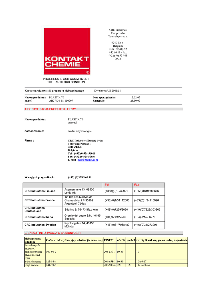 CRC Industries Europe bvba Touwslagerstraat 1 9240 Zele Belgium Tel (+32) (0) 52 / 45 60 11 - Fax (+32) (0) 52 / 45 00 34 PROGRESS IS OUR COMMITMENT THE EARTH OUR CONCERN Dyrektywa UE 2001/58 Karta charakterystyki preparatu niebezpiecznego Nazwa produktu : nr.ref. PLASTIK 70 AB27430-18-150207 Data sporządzenia: Zastępuje: 15.02.07 25.10.02 1.IDENTYFIKACJA PRODUKTU I FIRMY Nazwa produktu : PLASTIK 70 Aerozol Zastosowanie: środki antykorozyjne Firma : CRC Industries Europe bvba Touwslagerstraat 1 9240 ZELE Belgium Tel.: (+32)(0)52/456011 Fax: (+32)(0)52/450034 E-mail : [email protected] W nagłych przypadkach : (+32) (0)52/45 60 11 Tel Fax CRC Industries Finland Asemanrinne 13, 08500 Lohja AS (+358)(0)19/32921 (+358)(0)19/383676 CRC Industries France 12, Bld des Martyrs de Chateaubriant F-95102 Argenteuil Cédex (+33)(0)1/34112000 (+33)(0)1/34110996 CRC Industries Deutschland Südring 9, 76473 Iffezheim (+49)(0)7229/3030 (+49)(0)7229/303266 CRC Industries Iberia Gremio del cuero S/N, 40195 Segovia (+34)921/427546 (+34)921/436270 CRC Industries Sweden Kryptongatan 14, 43153 Mölndal (+46)(0)31/7068480 (+46)(0)31/273991 2. SKŁAD I INFORMACJA O SKŁADNIKACH niebezpieczny składnik 1-methoxy-2propanol; monopropylene glycol methyl ether n-butyl acetate ethyl acetate CAS - nr identyfikacyjny substancji chemicznej EINECS w/w % symbol zwroty R wskazujące na rodzaj zagrożenia 107-98-2 203-539-1 10-30 123-86-4 141-78-6 204-658-1 10-30 205-500-4 <20 10 F,Xi 10-66-67 11-36-66-67 niebezpieczny CAS - nr identyfikacyjny substancji chemicznej EINECS w/w % symbol zwroty R wskazujące na rodzaj zagrożenia składnik Hydrocarbons,C34-rich, petroleum 68512-91-4 270-990-9 10-30 F+ 12 distillate Petroleumgas (*Objaśnienie zwrotów wskazujących na zagrożenie: zob. rozdział 16) 3. IDENTYFIKACJA ZAGROŻEŃ Zdrowie i Bezpieczeństwo : Środowisko Naturalne : Inne zagrożenia : Produkt skrajnie łatwopalny (propelent: propan/butan) Wielokrotny kontakt ze skórą może powodować jej wysuszenie lub pękanie Pary mogą wywoływać senność i zawroty głowy Nie sklasyfikowany zgodnie z dyrektywą Unii Europejskiej 99/45/WE Pojemnik pod ciśnieniem: chronić przed bezpośrednim działaniem promieni słonecznych i nie wystawiać na temperatury przekraczające 50°C. Nie dziurawić, nie palić, nawet pustych opakowań. Nie rozpylać bezpośrednio na płomień ani na rozżarzony materiał. 4. PIERWSZA POMOC Zalecenia ogólne : Po wystąpieniu jakichkolwiek objawów należy skonsultować się z lekarzem. Kontakt z oczami : Jeżeli substancja dostanie się do oczu, natychmiast przemywać je dużą ilością wody przez co najmniej 25 minut Skonsultować się z lekarzem Kontakt ze skórą : Myć wodą z mydłem. Skonsultować się z lekarzem, jeżeli podrażnienie się utrzymuje Wdychanie : Zapewnić poszkodowanemu świeże powietrze i spokój; chronić go przed utratą ciepła. Jeżeli wystąpią objawy chorobowe, skonsultować się z lekarzem Połknięcie mało prawdopodobne W przypadku połknięcia nie prowokować wymiotów tylko skonsultować się z lekarzem. Połknięcie : 5. POSTĘPOWANIE W PRZYPADKU POŻARU Temperatura zapłonu (bez propelenta): < 0 °C (Closed Cup) Stężenia graniczne dla substancji o charakterze wybuchowym: górna granica: niedostępny dolna granica: niedostępny Środki gaszące : Strumień rozpylonej wody lub mgiełka wodna, piana odporna na alkohol, suchy środek chemiczny lub ditlenek węgla Postępowanie w przypadku pożaru: Opakowania/nie wystawione na działanie ognia należy chłodzić przez skrapianie wodą Niezwykłe ryzyko narażenia : Aerozole mogę wybuchać po nagrzaniu powyżej 50°C. 6. POSTĘPOWANIE W PRZYPADKU NIEZAMIERZONEGO UWOLNIENIA DO ŚRODOWISKA Indywidulne środki ostrożności: Wyłączyć wszytkie źródła zapłonu Zapewnić odpowiednią wentylację Środki ostrożności w zakresie ochrony środowiska: Nie dopuścić do wprowadzenia do kanalizacji publicznej i cieków wodnych. Metody czyszczania : Zaabsorbować wyciek przy pomocy odpowiedniego materiału obojętnego 7.POSTĘPOWANIE Z PREPARATEM I JEGO MAGAZYNOWANIE Postępowanie z preparatem: Stosować jedynie w dobrze wentylowanych pomieszczeniach Trzymać zdala od ciepła i źródeł zapłonu Nie wolno rozpylać aerozoli na otwarty ogień ani na żarzący się materiał. Pojemników z aerozolami nie wolno przekłuwać ani podpalać nawet po ich zużyciu. Nie wdychać aerozoli ani par. Nie dopuszczać do kontaktu ze skórą i oczami. Magazynowanie: Pojemnik pod ciśnieniem: chronić przed światłem słonecznym i nie wystawiać na temperaturę powyżej 50°C.E208 Przechowywać w chłodnym, suchym i dobrze wentylowanym miejscu Trzymać poza zasięgiem dzieci. 8. KONTROLA NARAŻENIA I ŚRODKI OCHRONY INDYWIDUALNEJ Procedury kontrolne: Zapewnić odpowiednią wentylację Trzymać zdala od ciepła i źródeł zapłonu Zachować środki zabezpieczające przed wyładowaniami elektrostatycznymi Ochrona indywidualna: Stosować jedynie w dobrze wentylowanych pomieszczeniach Zaleca się przestrzegać środków ostrożności przy pracy z tym produktem dla uniknięcia kontaktu ze skórą i oczami. Przy braku właściwej wentylacji stosować odpowiednie urządzenia do oddychania (Filtr typu AX) Nosić odpowiednie rękawice ochronne (alkohol poliwinylowy) Nakładać okulary ochronne. Limity narażenia : niebezpieczny składnik najwyższe stężenie dopuszczalne wg przepisów UE 1-methoxy-2-propanol; monopropylene glycol methyl ether CAS - nr identyfikacyjny substancji chemicznej metoda 107-98-2 TWA STEL 9.WŁAŚCIWOŚCI FIZYKOCHEMICZNE (dot. aerozoli bez propelenta) Wygląd : postać fizyczna : ciecz zawieszona w propelencie propan/butan ciecz zawieszona w propelencie propan/butan kolor: zapach: bezbarwny rozpuszczalnik Punkt wrzenia/zakres : niedostępny Gęstość względna : 0.919 g/cm3 (@ 20°C) pH : nie ma zastosowania Ciśnienie pary : niedostępny Względna gęstość pary : niedostępny Rozpuszczalność w wodzie : Ni