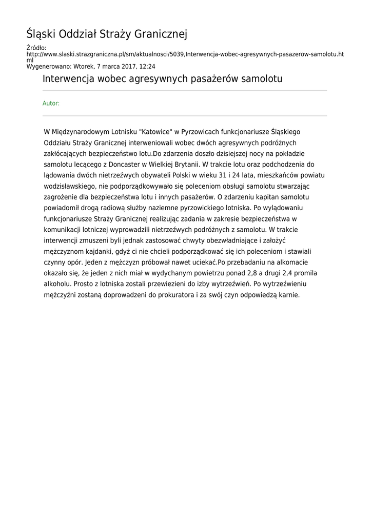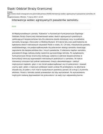 Śląski Oddział Straży Granicznej Źródło: http://www.slaski.strazgraniczna.pl/sm/aktualnosci/5039,Interwencja-wobec-agresywnych-pasazerow-samolotu.ht ml Wygenerowano: Wtorek, 7 marca 2017, 12:24 Interwencja wobec agresywnych pasażerów samolotu Autor: W Międzynarodowym Lotnisku "Katowice" w Pyrzowicach funkcjonariusze Śląskiego Oddziału Straży Granicznej interweniowali wobec dwóch agresywnych podróżnych zakłócających bezpieczeństwo lotu.Do zdarzenia doszło dzisiejszej nocy na pokładzie samolotu lecącego z Doncaster w Wielkiej Brytanii. W trakcie lotu oraz podchodzenia do lądowania dwóch nietrzeźwych obywateli Polski w wieku 31 i 24 lata, mieszkańców powiatu wodzisławskiego, nie podporządkowywało się poleceniom obsługi samolotu stwarzając zagrożenie dla bezpieczeństwa lotu i innych pasażerów. O zdarzeniu kapitan samolotu powiadomił drogą radiową służby naziemne pyrzowickiego lotniska. Po wylądowaniu funkcjonariusze Straży Granicznej realizując zadania w zakresie bezpieczeństwa w komunikacji lotniczej wyprowadzili nietrzeźwych podróżnych z samolotu. W trakcie interwencji zmuszeni byli jednak zastosować chwyty obezwładniające i założyć mężczyznom kajdanki, gdyż ci nie chcieli podporządkować się ich poleceniom i stawiali czynny opór. Jeden z mężczyzn próbował nawet uciekać.Po przebadaniu na alkomacie okazało się, że jeden z nich miał w wydychanym powietrzu ponad 2,8 a drugi 2,4 promila alkoholu. Prosto z lotniska zostali przewiezieni do izby wytrzeźwień. Po wytrzeźwieniu mężczyźni zostaną doprowadzeni do prokuratora i za swój czyn odpowiedzą karnie.