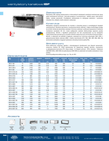 wentylatory kanałowe IBF Zastosowanie Wentylatory IBF znajdują zastosowanie w różnorodnych instalacjach wentylacji mechanicznej, łączą zalety wentylatorów osiowych - kierunek przepływu i promieniowych - stabilny spręż, niski poziom hałasu, wysoka sprawność. Przykładowe zastosowania to wentylacja nawiewna i wywiewna mieszkań, biur, sklepów, barów, kawiarni, restauracji. Konstrukcja Wentylatory kanałowe przeznaczone do montażu w dowolnej pozycji w prostokątnych kanałach wentylacyjnych. Obudowa zgrzewana z ocynkowanej blachy stalowej, z klapą umożliwiająca dostęp do wirnika i silnika bez demontażu instalacji. Od strony wlotowej i wylotowej wyposażona w kołnierze montażowe szerokości 20 mm. Łatwe podłączenie zasilania elektrycznego zapewnia puszka przyłączeniowa. Wirniki z łopatkami pochylonymi do tyłu przystosowane są do transportu maksymalnej ilości powietrza przy wysokim ciśnieniu statycznym przy minimalnym poziomie hałasu. Wirniki, w zależności od wielkości urządzenia, wykonane są z tworzywa sztucznego (180 i 220), z galwanizowanej blachy stalowej (280), z blachy aluminiowej (315, 355, 400, 450, 500, 560). Na zamówienie wentylatory mogą być wykonane w dowolnym kolorze palety RAL. 40oC Silnik elektryczny Silnik elektryczny wykonany zgodnie z obowiązującymi dyrektywami oraz klasami sprawności, oznaczony znakiem CE. Silnik dostosowany do napięciowej regulacji obrotów, wyposażony w zabezpieczenie termiczne (TP). Klasa izolacji – B. Stopień ochrony - IP44. Zasilanie - trójfazowe 230/400V 50Hz, 400V 50Hz lub jednofazowe 230V 50Hz (w zależności od modelu wentylatora i mocy silnika). Schemat podłączenia elektrycznego: rys. 13a, str. 851. Dane techniczne moc silnika [W] prędkość obrotowa [obr./min] napięcie [V] [A] wydajność max. 3 [m /h] IBF/2-190 75 2400 230 0,35 600 300 64 60 7,9 41010010 IBF/2-220 85 2790 230 0,43 900 400 71 65 12,6 41010020 IBF/2-280 E 280 2750 230 1,23 2400 560 80 80 17 41010035 IBF/4-280 90 1400 230 0,4 1000 150 61 55 16,3 41010040 Typ natężenie ciśnienie poziom ciśnienia max. akustycznego [Pa] [dB(A)] temp. pracy max. 0 [ C] masa nr artykułu [kg] IBF/4-315S ZA 140 1240 230 0,62 1400 230 66 60 23 41010050-01 IBF/4-355S ZA 270 1390 230 1,3 2250 270 68 60 35 41010060-01 IBF/6-315S 37 965 230 0,18 1050 120 51 60 23 41010070 IBF/6-355S 70 875 230 0,33 1700 140 55 60 35 41010080 IBF/4-315T 100 1400 400 0,48 1400 230 66 60 23 41010090 IBF/4-355T ZA 200 1400 400 1,1 2250 270 68 60 35 41010100-01 IBF/4-400S 370 1415 230 1,64 4050 380 78 70 37 41010110 IBF/4-400T 460 1345 400 0,85 4050 380 78 70 37 41010120 41010130-01 IBF/6-400S ZA 160 880 230 1,6 2750 170 67 70 37 IBF/6-400T 160 890 400 0,36 2750 170 67 70 37 41010140 IBF/4-450S SN 740 1280 230 3,2 5500 440 83 70 85 41010150-01 41010160-01 IBF/4-450T SN 690 1230 400 1,3 5500 440 83 50 85 IBF/6-450T 250 880 400 0,6 3800 210 74 50 85 41010180 IBF/4-500S 1300 1320 230 4,7 7800 600 83 55 122 41010190 41010200-01 IBF/4-500T SN 1200 1320 400 2,2 7800 600 83 70 117 IBF/6-500T 390 850 400 0,81 5150 250 73 60 110 41010220 IBF/4-560T SN 1800 1230 400 3,41 10200 690 88 50 155 41010250-01 IBF/6-560S SN 670 810 230 3 7500 300 78 55 155 41010260-01 IBF/6-560T SN 690 850 400 1,5 7500 300 78 70 150 41010270-01 Akcesoria regulator REB str. 852 regulator RMB, RMT str. 852 nagrzewnice kanałowe RH str. 144 tłumiki kanałowe RCS str. 148 filtry DFR str. 151 złącza przecidrganiowe IAE str. 152 54 Venture Industries Sp. z o.o. ul. Mokra 27, 05-092 Łomianki - Kiełpin tel. +48 22 751 95 50, 751 20 31 fax +48 22 751 22 59, 751 12 02 e-mail: [email protected] wentylatory kanałowe IBF Wymiary [mm] Typ A 402 C E G 190 H O A B D F B 298 C 148 D 320 E 170 F 340 G 190 OH 9 220 502 398 198 420 220 440 240 9 280 532 498 248 520 270 540 290 9 315 565 500 298 522 320 540 338 9 355 725 600 348 622 370 640 388 9 400 725 600 348 622 370 640 388 9 450 725 700 400 722 422 740 440 9 500 880 800 500 822 522 840 540 9 560 1000 1000 500 1022 522 1040 540 9 Charakterystyki pracy IBF/2-190 [Pa] IBF/2-220 Ciśnienie statyczne Ciśnienie statyczne [Pa] [m3/h] Wydajność IBF/2-280 E [m3/h] IBF/4-280 Ciśnienie statyczne [Pa] Ciśnienie statyczne [Pa] Wydajność 1200 Wydajność 1600 [m3/h] www.venture.pl Wydajność [m3/h] 55 wentylatory kanałowe IBF Charakterystyki pracy IBF/4-315 [Pa] IBF/6-315 Ciśnienie statyczne Ciśnienie statyczne [Pa] Wydajność Wydajność IBF/4-355 [Pa] [m3/h] IBF/6-355 Ciśnienie statyczne Ciśnienie statyczne [Pa] [m3/h] Wydajność [Pa] [m3/h] IBF/6-400 Ciśnienie statyczne IBF/4-400 Ciśnienie statyczne [Pa] Wydajność [m3/h] Wydajność [m3/h] Wydajność [m3/h] 56 Venture Industries Sp. z o.o. ul. Mokra 27, 05-092 Łomianki - Kiełpin tel. +48 22 751 95 50, 751 20 31 fax +48 22 751 22 59, 751 12 02 e-mail: [email protected] wentylatory kanałowe IBF Charakterystyki pracy IBF/4-450 [Pa] IBF/6-450 Ciśnienie statyczne Ciśnienie statyczne [Pa] Wydajność IBF/4-500 [Pa] [m3/h] IBF/6-500 Ciśnienie statyczne Ciśnienie statyczne [Pa] Wydajność [m3/h] Wydajność Wydajność IBF/4-560 [Pa] [m3/h] IBF/6-560 Ciśnienie statyczne Ciśnienie statyczne [Pa] [m3/h] Wydajność www.venture.pl [m3/h] Wydajność [m3/h] 57