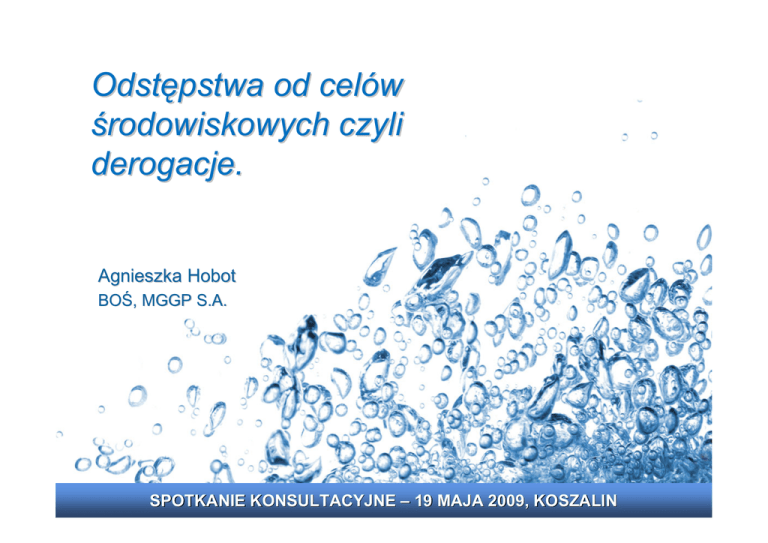 Odstępstwa od celów środowiskowych czyli derogacje. Agnieszka Hobot BOŚ, MGGP S.A. SPOTKANIE KONSULTACYJNE – 19 MAJA 2009, KOSZALIN Derogacje wg Ramowej Dyrektywy Wodnej Cele środowiskowe, wymienione w art. 4 powinny zostać osiągnięte do 2015 roku. Derogacje – odstępstwa środowiskowych w odniesieniu do celów ¾ derogacje czasowe – dobry stan wód może zostać osiągnięty do roku 2021 lub najpóźniej do 2027 (art. 4.4) ¾ ustalenie celów mniej rygorystycznych (art. 4.5) ¾czasowe pogorszenie stanu wód (okoliczności o charakterze naturalnym, działanie siły wyższej, np. powodzie i susze, nagłe zdarzenia) (art. 4.6) ¾ nieosiągnięcie celów ze względu na realizację nowych inwestycji (przekształcenie charakterystyk fizycznych JCW lub innych działań zgodnych z zasadami zrównoważonego rozwoju) (art. 4.7) Derogacje wg Ramowej Dyrektywy Wodnej DEROGACJE CZASOWE - przedłużenie terminu realizacji zadań RDW do 2021 lub 2027, można wyznaczyć ze względu na: - brak możliwości technicznych wdrożenia działań, - dysproporcjonalne koszty wdrożenia działań, - warunki naturalne niepozwalające na poprawę stanu części wód w sytuacji gdy spełnione są warunki: - nie zachodzi pogarszanie stanu wód, - przesunięcie terminu i jego przyczyny są opisane, - wskazane są działania mające doprowadzić określone części wód do dobrego stanu w proponowanym (przesuniętym) terminie. Derogacje wg Ramowej Dyrektywy Wodnej USTALENIE CELÓW MNIEJ RYGORYSTYCZNYCH - dla tych części wód, które zostały zmienione w wyniku działalności człowieka w taki sposób, że doprowadzenie ich do stanu (potencjału) dobrego jest niemożliwe ze względu na: - brak możliwości technicznych wdrożenia działań, - dysproporcjonalne koszty wdrożenia działań w sytuacji gdy: - zapewnione jest osiągnięcie stanu możliwie najbliższego wymaganiom stanu dobrego przy wskazanych oddziaływaniach - nie zachodzi dalsze pogarszanie stanu części wód Schemat możliwości zastosowania derogacji Czy można osiągnąć dobry stan do 2015? tak Cel: dobry stan w 2015 nie Czy można do 2015 wdrożyć działania niezbędne do osiągnięcia dobrego stanu, chociaż poprawa stanu, zależna od naturalnych procesów, nastąpi później? tak Cel: dobry stan tak szybko po 2015 jak umożliwiają naturalne procesy nie Czy można osiągnąć dobry stan do 2021 lub wdrożyć niezbędne działania, chociaż poprawa stanu zależna od naturalnych procesów, nastąpi później? tak Cel: dobry stan w 2021 lub tak szybko po 2021 jak umożliwiają naturalne procesy nie Czy można osiągnąć dobry stan do 2027 lub wdrożyć niezbędne działania, chociaż poprawa stanu zależna od naturalnych procesów, nastąpi później? tak Cel: dobry stan w 2027 lub tak szybko po 2027 jak umożliwiają naturalne procesy nie Ustanowienie mniej rygorystycznych celów osiągnięcie mniej rygorystycznych celów do 2015 Liczba derogacji dla obszarów dorzeczy JCWP Liczba JCWP zagrożonych nieosiągnięciem celów środowiskowyc h JCWP Liczba JCWP % JCWP 1089 23,6 wskazane do derogacji 380* 8,3* *wg wstępnego wyznaczenia Derogacje dla RZGW Szczecin Wskazanie derogacji powinny poprzedzać dokładne analizy na poziomie regionalnym. Dziękuję za uwagę