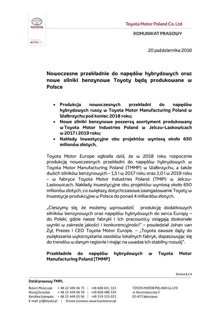 20 października 2016 Nowoczesne przekładnie do napędów hybrydowych oraz nowe silniki benzynowe Toyoty będą produkowane w Polsce Produkcja nowoczesnych przekładni do napędów hybrydowych ruszy w Toyota Motor Manufacturing Poland w Wałbrzychu pod koniec 2018 roku; Nowe silniki benzynowe poszerzą asortyment produkowany w Toyota Motor Industries Poland w Jelczu-Laskowicach w 2017 i 2019 roku; Nakłady inwestycyjne obu projektów wyniosą około 650 milionów złotych. Toyota Motor Europe ogłosiła dziś, że w 2018 roku rozpocznie produkcję nowoczesnych przekładni do napędów hybrydowych w Toyota Motor Manufacturing Poland (TMMP) w Wałbrzychu, a także dwóch silników benzynowych – 1,5 l w 2017 roku oraz 2,0 l w 2019 roku – w fabryce Toyota Motor Industries Poland (TMIP) w JelczuLaskowicach. Nakłady inwestycyjne obu projektów wyniosą około 650 milionów złotych, co zwiększy dotychczasowe zaangażowanie Toyoty w inwestycje produkcyjne w Polsce do ponad 4 miliardów złotych. „Cieszymy się, że możemy wprowadzić produkcję dodatkowych silników benzynowych oraz napędów hybrydowych do serca Europy – do Polski, gdzie nasze fabryki i ich pracownicy osiągają doskonałe wyniki w zakresie jakości i konkurencyjności” – powiedział Johan van Zyl, Prezes i CEO Toyota Motor Europe. – „Toyota zawsze dąży do zwiększania wykorzystania zasobów lokalnych fabryk, dopasowując się do trendów w danym regionie i mając na uwadze ich stabilny rozwój”. Przekładnie do napędów hybrydowych Manufacturing Poland [TMMP] w Toyota Motor Strona 1 z 4 Przekładnia hybrydowa jest kluczowym elementem technologii hybrydowej Toyoty, która koordynuje współdziałanie napędu elektrycznego i silnika spalinowego. Przekładnia z Wałbrzycha będzie współpracowała z silnikiem o pojemności 1,8 l w zespole napędowym montowanym we wszystkich sprzedawanych w Europie hybrydowych modelach Toyota Auris i Toyota Auris Touring Sports. Znajdzie też zastosowanie w Toyocie C-HR, nowym crossoverze, którego produkcja ruszy z końcem bieżącego roku. Obecnie układy hybrydowe dla modelu Auris powstają w zakładzie Toyota Motor Corporation w Japonii, skąd są importowane do Europy. Dodatkowo, w fabryce w Wałbrzychu od 2018 roku realizowane będą funkcje badawcze, które poprzez testowanie materiałów będą wspomagać proces lokalizacji części do produkcji przekładni hybrydowych. Hybryda jest kluczowym wyróżnikiem Toyoty w Europie. W kolejnych latach spodziewamy się wzrostu sprzedaży samochodów wyposażonych w napęd hybrydowy z obecnych 31% całkowitej sprzedaży do 50% w roku 2020. „Toyota jest zaangażowana w inwestycje produkcyjne w Polsce od 1999 roku, zatrudniając obecnie 2000 stałych pracowników. Chcemy dalej wzmacniać naszą obecność w Polsce” – powiedział Eiji Takeichi, Prezes Toyota Motor Manufacturing Poland. – „Poszerzenie produkowanego asortymentu o hybrydy zapewni większą stabilność naszej działalności z korzyścią dla naszych pracowników i lokalnej społeczności”. Nowe silniki benzynowe w Toyota Motor Industries Poland [TMIP] Fabryka Toyoty w Jelczu-Laskowicach, która produkuje obecnie silniki Diesla o pojemnościach 1,4 l, 2,0 l i 2,2 l, doda do swojej oferty dwa silniki benzynowe. Montaż pierwszego z nich o pojemności 1,5 l rozpocznie się w lutym 2017 roku. Będzie on montowany w Toyocie Yaris. Natomiast od roku 2019 wystartuje produkcja zupełnie nowego 2-litrowego silnika benzynowego, który uzupełni asortyment silników Toyoty przeznaczonych do samochodów produkowanych w Europie w nadchodzących latach. „TMIP produkuje obecnie tylko silniki wysokoprężne. Jednak rynek europejski ewoluuje w kierunku zwiększonego udziału pojazdów Strona 2 z 4 benzynowych, hybrydowych oraz elektrycznych” – stwierdził Kazunari Masuoka, Prezes Toyota Motor Industries Poland. – „Dlatego też istotne było dla nas zróżnicowanie produkcji i rozwój umiejętności wytwarzania silników benzynowych, co pomoże zapewnić naszej fabryce stabilniejszą przyszłość”. Połączenie fabryk produkcyjnych Toyoty w Polsce W nawiązaniu do decyzji o nowych projektach inwestycyjnych w polskich fabrykach koncernu oraz do faktu, że oba zakłady – poprzez wytwarzanie silników benzynowych – będą realizowały podobny profil produkcji, Toyota poinformowała również o planowanym połączeniu obu przedsiębiorstw w jedną organizację. We wspólnym liście do pracowników prezesi obu firm, Eiji Takeichi i Kazunori Masuoka, podkreślili: „Patrząc na zmiany, które zachodzą na rynku motoryzacyjnym, musimy dostosować do nich nasze produkty oraz organizację. Poprzez połączenie naszych fabryk w jedną firmę zwiększymy skalę naszej działalności i będziemy w stanie pozyskać projekty, które pozwolą nam odpowiedzieć na wyzwania przyszłości i zapewnią stabilny rozwój nowo utworzonemu przedsiębiorstwu”. Połączenie będzie sfinalizowane z końcem obecnego roku finansowego, tj. 31 marca 2017 roku, a nowa firma przyjmie nazwę Toyota Motor Manufacturing Poland. Toyota Motor Manufacturing Poland – Wałbrzych - utworzona w 1999 roku - start produkcji w 2002 roku - produkcja silników benzynowych 1,0 l do modeli Aygo i Yaris oraz manualnych skrzyń biegów do silników 1,0 l –1,8 l do modeli Auris, Avensis i Corolla - możliwości produkcyjne 720 tys. skrzyń biegów i 371 tys. silników - poziom produkcji w 2015 r. – 410 tys. skrzyń biegów i 220 tys. silników - zatrudnienie 1500 pracowników stałych Toyota Motor Industries Poland – Jelcz-Laskowice - utworzona w 2002 roku - start produkcji w 2005 roku - produkcja silników Diesla 1,4 l D-4D do Toyoty Yaris, Auris, Corolla oraz 2,0 l i 2,2 l D-4D do Toyoty Auris, Avensis, Verso Strona 3 z 4 - możliwości produkcyjne 180 tys. silników - poziom produkcji w 2015 r. – 75,5 tys. silników - zatrudnienie 500 pracowników stałych Strona 4 z 4