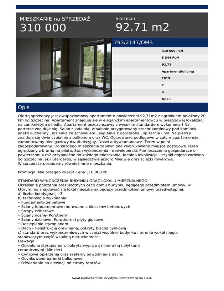 MIESZKANIE na SPRZEDAŻ 310 000 Szczecin 92.71 m2 793/2147/OMS 310 000 PLN 3 344 PLN 92.71 ApartmentBuilding 2015 2 4 Open Opis Ofertą sprzedaży jest dwupoziomowy apartament o powierzchni 92,71m2 z ogródkiem położony 20 km od Szczecina. Apartament znajduje się w eleganckim apartamentowcu w prestiżowej lokalizacji na zamkniętym osiedlu. Apartament bezczynszowy z wysokim standardem wykonania ! Na parterze znajduje się: Salon z jadalnią, w salonie przygotowany szacht kominowy pod kominek, aneks kuchenny , łazienka ze schowkiem , sypialnia z garderobą , spiżarnia i hol. Na piętrze znajdują się dwie sypialnie z balkonem oraz WC. Ogrzewanie podłogowe w całym apartamencie, zamontowany piec gazowy dwufunkcyjny. Drzwi antywłamaniowe. Teren w pełni zagospodarowany. Do każdego mieszkania zapewnione wybrukowane miejsce postojowe.Teren ogrodzony z bramą na pilota. Stan wykończenia - deweloperski. Pomieszczenia gospodarcze o powierzchni 4 m2 przynależne do każdego mieszkania. Idealna lokalizacja - szybki dojazd zarówno do Szczecina jak i Stargardu, w sąsiedztwie jezioro Miedwie oraz ścieżki rowerowe. W sprzedaży posiadamy również inne mieszkania. Promocja! Nie przegap okazji! Cena 310.000 zł! STANDARD WYKOŃCZENIA BUDYNKU ORAZ LOKALU MIESZKALNEGO: Określenie położenia oraz istotnych cech domu budynku będącego przedmiotem umowy, w którym ma znajdować się lokal mieszkalny będący przedmiotem umowy przedwstępnej: a) liczba kondygnacji: 3 b) technologia wykonania: • Fundamenty żelbetowe • Ściany fundamentowe murowane z bloczków betonowych • Stropy żelbetowe • Ściany nośne- Porotherm • Ściany działowe- Porotherm i płyty gipsowe • Docieplenie styropianem • Dach – konstrukcja drewniana, pokryty blacha cynkową c) standard prac wykończeniowych w części wspólnej budynku i terenie wokół niego, stanowiącym część wspólną nieruchomości: Elewacja : • Ocieplona styropianem, pokryta wyprawą mineralną i płytkami ceramicznymi (klinkier) • Cynkowe opierzenia oraz systemy odwodnienia dachu • Ocynkowane barierki balkonowe • Oświetlenie na elewacji od strony tarasów Świat Nieruchomości Krystyna Skworcow sp-ka z o.o. • Stolarka drzwiowa i okienna w kolorze antracyt Klatka schodowa: • Ściany malowane farbami emulsyjnymi • Posadzki – płytki gress Zagospodarowanie terenu: • Chodnik i dojścia do budynku – z kostki brukowej • Teren niezabudowany- zieleń niska • 4 ogródki przynależne do mieszkań na parterze • Tarasy z kostki brukowej, przedzielone ściankami murowanymi na wysokość 1,15 wykonane z cegły klinkierowej • Ogródki przedzielone panelami drewnianymi d) liczba lokali w budynku: 8 lokali mieszkalnych e) liczba miejsc garażowych i postojowych : Brak miejsc garażowych, projekt przewiduje 8 miejsc postojowych – ogólnodostępnych f) dostępne media w budynku: • Instalacja c.o. i c.w. ogrzewanie gazowe (w tym piec dwufunkcyjny kondensacyjny) • Ogrzewanie podłogowe • Sieć wody z sieci ogólnodostępnej • Instalacja kanalizacyjna • Instalacja elektryczna wewnętrzna • Instalacja telefoniczna wewnętrzna • Instalacja domofonowa • Instalacja telewizji kablowej g) dostęp do drogi publicznej: Budynek położony bezpośrednio przy drodze gminnej Standard prac wykończeniowych w lokalu mieszkalnym: Instalacja elektryczna: • Wewnętrzna instalacja elektryczna oświetlenia i gniazd wtykowych (wyposażona w gniazda, wyłączniki i kostki do przyłączenia oparw), bez opraw bez lamp • Oświetlenie oraz gniazdo wtykowe na tarasie • Instalacja wewnętrzna telefoniczna, bez osprzętu • Instalacja TV (kable koncentryczne), bez osprzętu • Instalacja domofonowa – kompletna (domofon przy drzwiach wejściowych do budynku) • Nabywca podpisuje indywidualna umowę o sprzedaż energii elektrycznej z dostawcą Instalacja sanitarna: • Przyłącze kanalizacji sanitarnej • Przyłącze wody • Wewnętrzna instalacja wody (bez urządzeń i armatury sanitarnej) • Wewnętrzna instalacja kanalizacji PCW (bez urządzeń i armatury sanitarnej) • Wewnętrzna instalacja c.o. – ogrzewanie podłogowe we wszystkich pomieszczeniach • Zawór wody na tarasie Roboty budowlane: • Ściany nośne murowane Porotherm • Ścianki działowe – płyty re gipsowe, murowane z Porotherm, • Okna jednoramowe 3 szybowe PCV, wewnątrz białe na zewnątrz antracyt Uwaga: Lokal mieszkalny wyposażony jest w skrzynki nadokienne, umożliwiające montaż rolet okiennych. Cena rolety i jej montażu – za oddzielną opłatą, jako roboty dodatkowe. • Drzwi zewnętrzne do lokalu mieszkalnego w kolorze orzech (antywłamaniowe lub EI30) • Otwory drzwiowe wewnętrzne w lokalu bez ościeżnic i skrzydeł drzwiowych • Parapety wewnętrzne montuje kupujący na własny koszt w ramach aranżacji wnętrz • Ściany – tynki wewnętrzne w standardzie minimalnym • Posadzka betonowa bez podłóg i okładzin • Poddasze ocieplone wełną mineralną gr. 20 cm, pokryte płytami gipsowymi Świat Nieruchomości Krystyna Skworcow sp-ka z o.o. Powyższa oferta ma charakter informacyjny i nie stanowi oferty handlowej w rozumieniu art. 66 §1 kodeksu cywilnego oraz innych właściwych przepisów prawnych. Treść ma charakter informacyjny i zalecamy jej osobistą weryfikację. Kontaktując się z biurem Klient wyraża zgodę na przetwarzanie danych osobowych zgodnie z przepisami ustawy z dnia 29 sierpnia 1997 roku o ochronie danych osobowych / Dz.U.Nr. 133 poz. 883/. Klientowi przysługuje prawo do wglądu do swoich danych osobowych i ich aktualizacji. Kierując się zasadami Kodeksu etyki zawodowej oraz Standardami zawodowymi pośredników w obrocie nieruchomościami, zapewniamy pośrednictwo w obrocie nieruchomościami - kupno, sprzedaż oraz wynajem - we współpracy z profesjonalnymi, licencjonowanymi i wyselekcjonowanymi biurami nieruchomości działającymi w Systemie Wymiany Ofert, fachową i kompleksową obsług