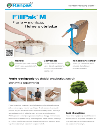 The Paper Packaging Experts™ Proste w montażu, i łatwe w obsłudze Prostota Elastyczność Kompaktowy rozmiar Nie wymaga podłączenia Papier może być stoso- Wymaga niewielkiej ilości elektrycznego ani szkoleń, wany do zabezpieczenia miejsca do instalacji i łatwy montaż różnorodnej zawartości przechowywania opakowań Proste rozwiązanie do słabiej eksploatowanych stanowisk pakowania Prosta konstrukcja konwertera umożliwia skuteczne kształtowanie papieru jednowarstwowego w materiał wypełniający do zabezpieczenia produktów podczas wysyłki. Brak konieczności zapewnienia elektryczności, eliminacja wymagającego dużych nakładów pracy ręcznego zgniatania papieru. Bądź ekologiczny Pakiety papieru harmonijkowego zapewniają łatwą obsługę, minimalny czas Nasza firma współpracuje z certyfikowanymi ładowania oraz mniejsze koszty przechowywania. Papier posiada perforację dostawcami FSC. Papier nie ma wpływu na co 18,6 cm, umożliwiając regulację długości papieru przez operatora w celu zmiany klimatyczne, podlega recyklingowi i wypełnienia dowolnych przestrzeni w opakowaniach. jest zasobem odnawialnym. Specyfikacje systemu Konwerter Papier • Wymiary: 54x40x67-103 cm • Masa podstawy: 50 gr/m², 70 gr/m² • Masa: 4 kg • Długość pakietu: 500 m, 360 m • Metoda cięcia: odrywanie ręczne, • Szerokość papieru: 38 cm • Średnia masa pakietu: 9.5 kg, 9.6 kg perforacja co 18.6 cm • Średni uzysk: 1.5 m³ Nasza wartość dodana Technika pakowania Zintegrowane zastosowania Szkolenia z zakresu pakowania Ranpak analizuje i przygotowuje raport Zespół inżynierów Ranpak może Szkolenia prowadzone przez naszych dotyczący obecnego rozwiązania do zaprojektować konstrukcje, ramy oraz ekspertów ds. pakowania pomogą pakowania. Próba spadowa dokładnie inne innowacyjne rozwiązania w celu pakowaczom ograniczyć zużycie określa ilość wstrząsów przekazywanych integracji konwertera do pakowania w materiałów opakowaniowych o 20% bez na produkt poprzez opakowanie. Ranpak dowolnym miejscu wokół, ponad lub pod pogorszenia jakości opakowania. sugeruje następnie alternatywne stanowiskiem pakowania. rozwiązania poprawy zabezpieczenia produktu lub oszczędności kosztów. Odnosimy sukcesy w poniższych branżach Logistyka Oświetlenie Handel elektroniczny Zabawki i artykuły sportowe Branża wydawnicza Branża dekoracyjna Kosmetyki Handel detaliczny Farmaceutyka Żywność dla smakoszy Dystrybutor Ranpak Wypróbuj bezpłatnie już dziś!* *Zapytaj dystrybutora o szczegóły promocji. 190008_PO_revA Ranpak T +31882551111 E [email protected] www.ranpakeurope.com