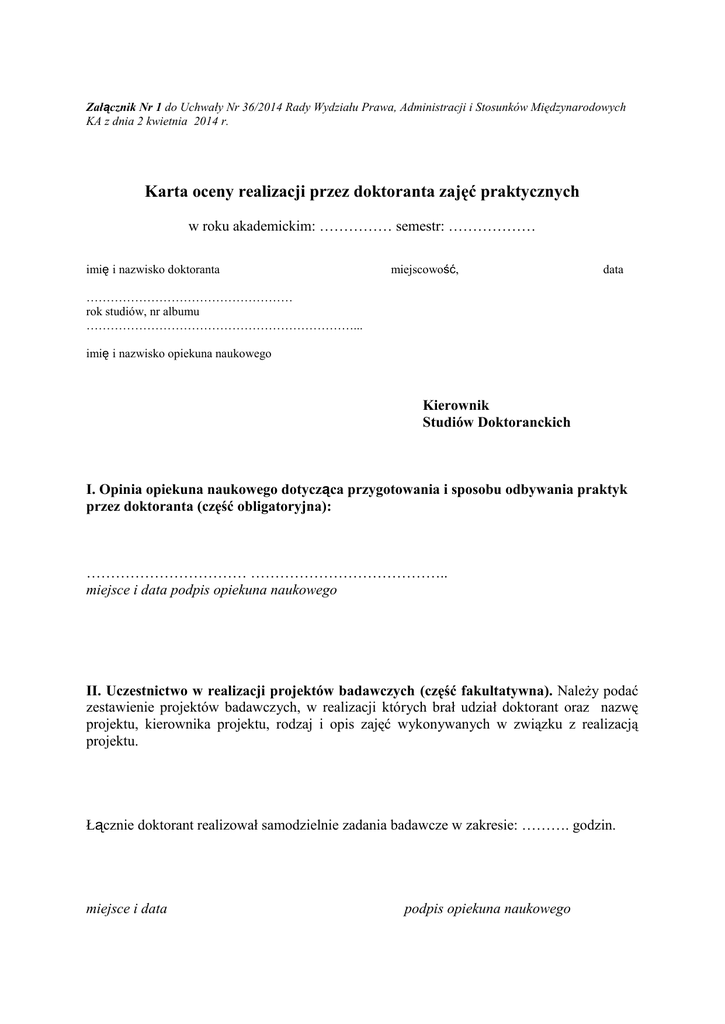Załącznik Nr 1 do Uchwały Nr 36/2014 Rady Wydziału Prawa, Administracji i Stosunków Międzynarodowych KA z dnia 2 kwietnia 2014 r. Karta oceny realizacji przez doktoranta zajęć praktycznych w roku akademickim: …………… semestr: ……………… imię i nazwisko doktoranta miejscowość, data …………………………………………… rok studiów, nr albumu …………………………………………………………... imię i nazwisko opiekuna naukowego Kierownik Studiów Doktoranckich I. Opinia opiekuna naukowego dotycząca przygotowania i sposobu odbywania praktyk przez doktoranta (część obligatoryjna): …………………………… ………………………………….. miejsce i data podpis opiekuna naukowego II. Uczestnictwo w realizacji projektów badawczych (część fakultatywna). Należy podać zestawienie projektów badawczych, w realizacji których brał udział doktorant oraz nazwę projektu, kierownika projektu, rodzaj i opis zajęć wykonywanych w związku z realizacją projektu. Łącznie doktorant realizował samodzielnie zadania badawcze w zakresie: ………. godzin. miejsce i data podpis opiekuna naukowego Załącznik Nr 2 do Uchwały Nr 36/2014 Rady Wydziału Prawa, Administracji i Stosunków Międzynarodowych KA z dnia 2 kwietnia 2014 r. Sprawozdanie z pracy naukowej doktoranta w roku akademickim..... …………………………………………… imię i nazwisko doktoranta …………………………………… miejscowość, data …………………………………………… rok studiów, nr albumu …………………………………………………………... imię i nazwisko opiekuna naukowego Kierownik Studiów Doktoranckich W roku akademickim.............. osiągnąłem następujące wyniki w nauce: 1) Postęp prac nad rozprawą doktorską (należy podać: temat rozprawy, wstępny konspekt lub plan rozprawy doktorskiej, charakterystykę zaawansowania prac nad rozprawą): 2) Pozostałe osiągnięcia w działalności naukowej (dorobek naukowy): A. Publikacje: (należy podać: - rodzaj publikacji np. artykuł, glosa, opracowanie monograficzne), - tytuł i miejsce opublikowania, - objętość publikacji, - punktację publikacji (jeśli przysługuje); Do sprawozdania należy załączyć kopię pierwszej strony publikacji B. Udział w konferencjach naukowych: (należy podać: - rodzaj, tytuł, miejsce i termin konferencji, rodzaj uczestnictwa; - tytuł referatu albo wskazanie uczestnictwa bez referatu) C. Udział w stowarzyszeniach i organizacjach naukowych: (należy podać nazwę stowarzyszenia/organizacji; - charakter udziału w jej pracach; - zrealizowane zadania badawcze) D. Inne formy aktywności naukowej: (np. realizacja projektów badawczych, krajowe i zagraniczne staże naukowe) 3) Opinia opiekuna naukowego o pracy naukowej doktoranta: ................................................................................................................................ miejsce i data podpis opiekuna naukowego