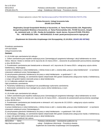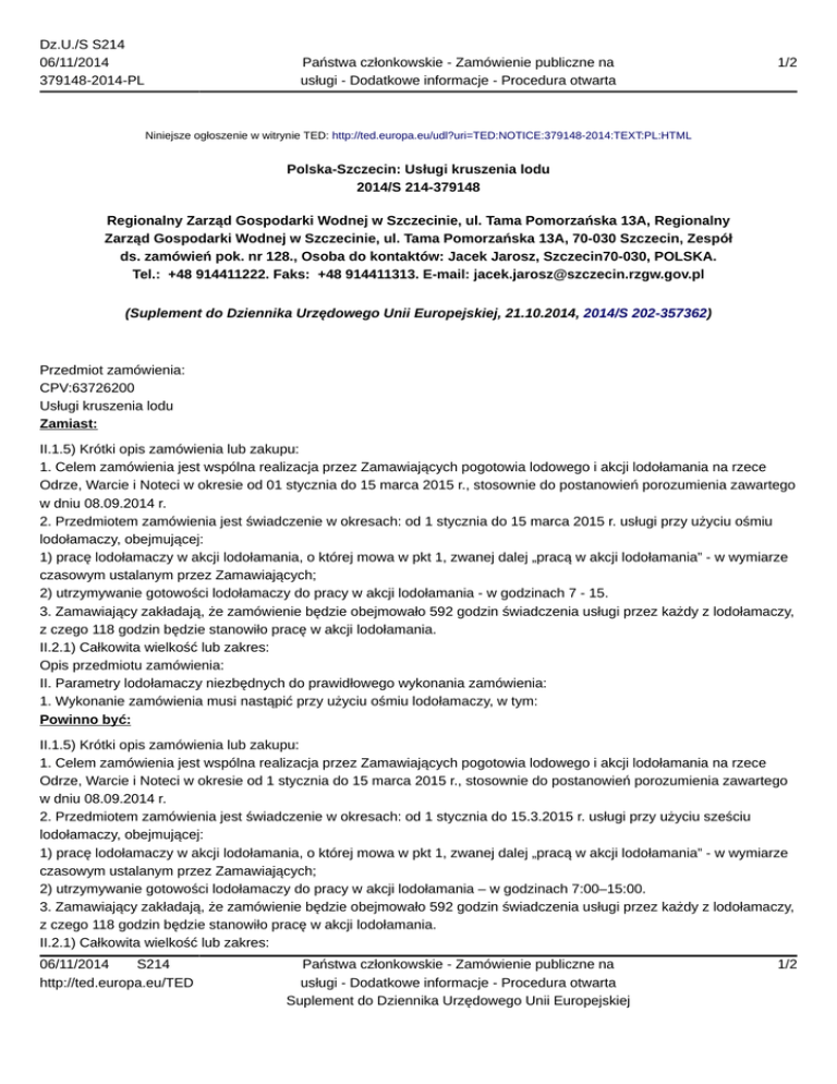 Dz.U./S S214 06/11/2014 379148-2014-PL Państwa członkowskie - Zamówienie publiczne na usługi - Dodatkowe informacje - Procedura otwarta 1/2 Niniejsze ogłoszenie w witrynie TED: http://ted.europa.eu/udl?uri=TED:NOTICE:379148-2014:TEXT:PL:HTML Polska-Szczecin: Usługi kruszenia lodu 2014/S 214-379148 Regionalny Zarząd Gospodarki Wodnej w Szczecinie, ul. Tama Pomorzańska 13A, Regionalny Zarząd Gospodarki Wodnej w Szczecinie, ul. Tama Pomorzańska 13A, 70-030 Szczecin, Zespół ds. zamówień pok. nr 128., Osoba do kontaktów: Jacek Jarosz, Szczecin70-030, POLSKA. Tel.: +48 914411222. Faks: +48 914411313. E-mail: [email protected] (Suplement do Dziennika Urzędowego Unii Europejskiej, 21.10.2014, 2014/S 202-357362) Przedmiot zamówienia: CPV:63726200 Usługi kruszenia lodu Zamiast: II.1.5) Krótki opis zamówienia lub zakupu: 1. Celem zamówienia jest wspólna realizacja przez Zamawiających pogotowia lodowego i akcji lodołamania na rzece Odrze, Warcie i Noteci w okresie od 01 stycznia do 15 marca 2015 r., stosownie do postanowień porozumienia zawartego w dniu 08.09.2014 r. 2. Przedmiotem zamówienia jest świadczenie w okresach: od 1 stycznia do 15 marca 2015 r. usługi przy użyciu ośmiu lodołamaczy, obejmującej: 1) pracę lodołamaczy w akcji lodołamania, o której mowa w pkt 1, zwanej dalej „pracą w akcji lodołamania” - w wymiarze czasowym ustalanym przez Zamawiających; 2) utrzymywanie gotowości lodołamaczy do pracy w akcji lodołamania - w godzinach 7 - 15. 3. Zamawiający zakładają, że zamówienie będzie obejmowało 592 godzin świadczenia usługi przez każdy z lodołamaczy, z czego 118 godzin będzie stanowiło pracę w akcji lodołamania. II.2.1) Całkowita wielkość lub zakres: Opis przedmiotu zamówienia: II. Parametry lodołamaczy niezbędnych do prawidłowego wykonania zamówienia: 1. Wykonanie zamówienia musi nastąpić przy użyciu ośmiu lodołamaczy, w tym: Powinno być: II.1.5) Krótki opis zamówienia lub zakupu: 1. Celem zamówienia jest wspólna realizacja przez Zamawiających pogotowia lodowego i akcji lodołamania na rzece Odrze, Warcie i Noteci w okresie od 1 stycznia do 15 marca 2015 r., stosownie do postanowień porozumienia zawartego w dniu 08.09.2014 r. 2. Przedmiotem zamówienia jest świadczenie w okresach: od 1 stycznia do 15.3.2015 r. usługi przy użyciu sześciu lodołamaczy, obejmującej: 1) pracę lodołamaczy w akcji lodołamania, o której mowa w pkt 1, zwanej dalej „pracą w akcji lodołamania” - w wymiarze czasowym ustalanym przez Zamawiających; 2) utrzymywanie gotowości lodołamaczy do pracy w akcji lodołamania – w godzinach 7:00–15:00. 3. Zamawiający zakładają, że zamówienie będzie obejmowało 592 godzin świadczenia usługi przez każdy z lodołamaczy, z czego 118 godzin będzie stanowiło pracę w akcji lodołamania. II.2.1) Całkowita wielkość lub zakres: 06/11/2014 S214 http://ted.europa.eu/TED Państwa członkowskie - Zamówienie publiczne na usługi - Dodatkowe informacje - Procedura otwarta Suplement do Dziennika Urzędowego Unii Europejskiej 1/2 Dz.U./S S214 06/11/2014 379148-2014-PL Państwa członkowskie - Zamówienie publiczne na usługi - Dodatkowe informacje - Procedura otwarta 2/2 Opis przedmiotu zamówienia: II. Parametry lodołamaczy niezbędnych do prawidłowego wykonania zamówienia: 1. Wykonanie zamówienia musi nastąpić przy użyciu sześciu lodołamaczy, w tym: 06/11/2014 S214 http://ted.europa.eu/TED Państwa członkowskie - Zamówienie publiczne na usługi - Dodatkowe informacje - Procedura otwarta Suplement do Dziennika Urzędowego Unii Europejskiej 2/2