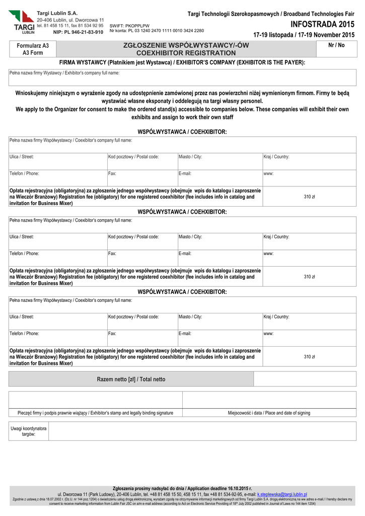 Targi Technologii Szerokopasmowych / Broadband Technologies Fair INFOSTRADA 2015 SWIFT: PKOPPLPW Nr konta: PL 03 1240 2470 1111 0010 3424 2280 17-19 listopada / 17-19 November 2015 Nr / No ZGŁOSZENIE WSPÓŁWYSTAWCY/-ÓW COEXHIBITOR REGISTRATION Formularz A3 A3 Form FIRMA WYSTAWCY (Płatnikiem jest Wystawca) / EXHIBITOR’S COMPANY (EXHIBITOR IS THE PAYER): Pełna nazwa firmy Wystawcy / Exhibitor’s company full name: Wnioskujemy niniejszym o wyrażenie zgody na udostępnienie zamówionej przez nas powierzchni niżej wymienionym firmom. Firmy te będą wystawiać własne eksponaty i oddelegują na targi własny personel. We apply to the Organizer for consent to make the ordered stand(s) accessible to companies below. These companies will exhibit their own exhibits and assign to work their own staff WSPÓŁWYSTAWCA / COEHXIBITOR: Pełna nazwa firmy Współwystawcy / Coexibitor’s company full name: Ulica / Street: Kod pocztowy / Postal code: Miasto / City: Kraj / Country: Telefon / Phone: Fax: E-mail: www: Opłata rejestracyjna (obligatoryjna) za zgłoszenie jednego współwystawcy (obejmuje wpis do katalogu i zaproszenie na Wieczór Branżowy) Registration fee (obligatory) for one registered coexhibitor (fee includes info in catalog and invitation for Business Mixer) 310 zł WSPÓŁWYSTAWCA / COEHXIBITOR: Pełna nazwa firmy Współwystawcy / Coexibitor’s company full name: Ulica / Street: Kod pocztowy / Postal code: Miasto / City: Kraj / Country: Telefon / Phone: Fax: E-mail: www: Opłata rejestracyjna (obligatoryjna) za zgłoszenie jednego współwystawcy (obejmuje wpis do katalogu i zaproszenie na Wieczór Branżowy) Registration fee (obligatory) for one registered coexhibitor (fee includes info in catalog and invitation for Business Mixer) 310 zł WSPÓŁWYSTAWCA / COEHXIBITOR: Pełna nazwa firmy Współwystawcy / Coexibitor’s company full name: Ulica / Street: Kod pocztowy / Postal code: Miasto / City: Kraj / Country: Telefon / Phone: Fax: E-mail: www: Opłata rejestracyjna (obligatoryjna) za zgłoszenie jednego współwystawcy (obejmuje wpis do katalogu i zaproszenie na Wieczór Branżowy) Registration fee (obligatory) for one registered coexhibitor (fee includes info in catalog and invitation for Business Mixer) 310 zł Razem netto [zł] / Total netto Pieczęć firmy i podpis prawnie wiążący / Exhibitor’s stamp and legally binding signature Miejscowość i data / Place and date of signing Uwagi koordynatora targów: Zgłoszenia prosimy nadsyłać do dnia / Application deadline 16.10.2015 r. ul. Dworcowa 11 (Park Ludowy), 20-406 Lublin, tel. +48 81 458 15 50, 458 15 11, fax +48 81 534-92-95, e-mail: [email protected] Zgodnie z ustawą z dnia 18.07.2002 r. (Dz.U. nr 144 poz.1204) o świadczeniu usług drogą elektroniczną, wyrażam zgodę na otrzymywanie informacji marketingowych od firmy Targi Lublin S.A. drogą elektroniczną na ww adres e-mail./ I hereby declare my consent to receive marketing information from Lublin Fair JSC on a/m e-mail address (according to Act on Electronic Service Providing of 18 th July 2002 published in Journal of Laws no 144 item 1204)