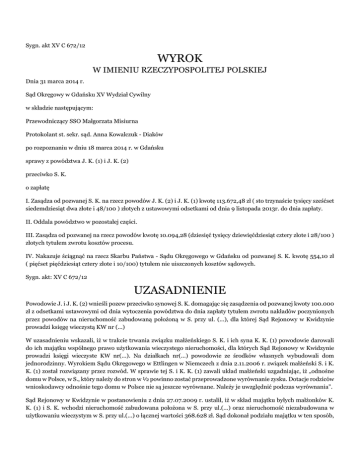 Sygn. akt XV C 672/12 WYROK W IMIENIU RZECZYPOSPOLITEJ POLSKIEJ Dnia 31 marca 2014 r. Sąd Okręgowy w Gdańsku XV Wydział Cywilny w składzie następującym: Przewodniczący SSO Małgorzata Misiurna Protokolant st. sekr. sąd. Anna Kowalczuk - Diaków po rozpoznaniu w dniu 18 marca 2014 r. w Gdańsku sprawy z powództwa J. K. (1) i J. K. (2) przeciwko S. K. o zapłatę I. Zasądza od pozwanej S. K. na rzecz powodów J. K. (2) i J. K. (1) kwotę 113.672,48 zł ( sto trzynaście tysięcy sześćset siedemdziesiąt dwa złote i 48/100 ) złotych z ustawowymi odsetkami od dnia 9 listopada 2013r. do dnia zapłaty. II. Oddala powództwo w pozostałej części. III. Zasądza od pozwanej na rzecz powodów kwotę 10.094,28 (dziesięć tysięcy dziewięćdziesiąt cztery złote i 28/100 ) złotych tytułem zwrotu kosztów procesu. IV. Nakazuje ściągnąć na rzecz Skarbu Państwa - Sądu Okręgowego w Gdańsku od pozwanej S. K. kwotę 554,10 zł ( pięćset pięćdziesiąt cztery złote i 10/100) tytułem nie uiszczonych kosztów sądowych. Sygn. akt: XV C 672/12 UZASADNIENIE Powodowie J. i J. K. (2) wnieśli pozew przeciwko synowej S. K. domagając się zasądzenia od pozwanej kwoty 100.000 zł z odsetkami ustawowymi od dnia wytoczenia powództwa do dnia zapłaty tytułem zwrotu nakładów poczynionych przez powodów na nieruchomość zabudowaną położoną w S. przy ul. (...), dla której Sąd Rejonowy w Kwidzynie prowadzi księgę wieczystą KW nr (...) W uzasadnieniu wskazali, iż w trakcie trwania związku małżeńskiego S. K. i ich syna K. K. (1) powodowie darowali do ich majątku wspólnego prawo użytkowania wieczystego nieruchomości, dla których Sąd Rejonowy w Kwidzynie prowadzi księgi wieczyste KW nr(...). Na działkach nr(...) powodowie ze środków własnych wybudowali dom jednorodzinny. Wyrokiem Sądu Okręgowego w Ettlingen w Niemczech z dnia 2.11.2006 r. związek małżeński S. i K. K. (1) został rozwiązany przez rozwód. W sprawie tej S. i K. K. (1) zawali układ małżeński uzgadniając, iż „odnośne domu w Polsce, w S., który należy do stron w ½ powinno zostać przeprowadzone wyrównanie zysku. Dotacje rodziców wnioskodawcy odnośnie tego domu w Polsce nie są jeszcze wyrównane. Należy je uwzględnić podczas wyrównania”. Sąd Rejonowy w Kwidzynie w postanowieniu z dnia 27.07.2009 r. ustalił, iż w skład majątku byłych małżonków K. K. (1) i S. K. wchodzi nieruchomość zabudowana położona w S. przy ul.(...) oraz nieruchomość niezabudowana w użytkowaniu wieczystym w S. przy ul.(...) o łącznej wartości 368.628 zł. Sąd dokonał podziału majątku w ten sposób, iż w/w nieruchomości przyznał K. K. (1) z obowiązkiem spłaty pozwanej. Całość nakładów na budowę domu została poczyniona ze środków powodów. Pozwana i K. K. (1) przekazali na budowę domu 2.350 marek. Nakłady stanowiły majątek wspólny S. i K. K. (1). Nakłady na budowę domu wynoszą 200.000 zł. Odpowiedzialni za zwrot nakładów są solidarnie K. i S. K., zasadne jest zatem żądanie ½ wartości nakładów od pozwanej. Pozwana uzyskała korzyść majątkowa bez podstawy prawnej przy jednoczesnym zubożeniu strony powodowej. Pozwana w odpowiedzi na pozew (k.270) wniosła o oddalenie powództwa oraz o zasądzenie od powodów zwrotu kosztów postępowania. W uzasadnieniu wskazała, iż powodowie nie finansowali budowy domu na działkach nr(...) położonych w S. przy ul.(...). Powodowie jako renciści nie posiadali środków na budowę domu. Pozwana i jej były mąż mieli natomiast środki na prowadzenie budowy. Sama powódka przesłuchiwana w charakterze świadka w sprawie o podział majątku przyznała, iż otrzymała od pozwanej i jej byłego męża 20.000 marek niemieckich, za które zakupiono materiały budowlane. Skoro środki finansowe na budowę domu zostały darowane pozwanej i jej byłemu mężowi powodowie nie mogą żądać zwrotu uczynionej darowizny. Pozwana nie jest właścicielką przedmiotowego domu, a żądanie zwrotu nakładów powinno zostać skierowane do właściciela domu. Wbrew twierdzeniu powodów w zawartym w toku sprawy rozwodowej porozumieniu nie ma stwierdzenia o konieczności rozliczenia się z powodami z nakładów poczynionych na dom w Polsce. W porozumieniu jest mowa o korzyściach wynikających z faktu nieodpłatnego zamieszkiwania powodów w domu pozwanej i K. K. (1). Pozwana podniosła także zarzut przedawnienia. W piśmie procesowym z dnia 3 grudnia 2012 r. (k.323-328) powodowie rozszerzyli powództwo do kwoty 135.000 zł. Sąd ustalił następujący stan faktyczny: W dniu 12.08.1997 r. J. i J. K. (2) darowali S. i K. K. (1) pozostającym w ustroju wspólności ustawowej prawo użytkowania wieczystego nieruchomości stanowiącej działkę nr(...) o powierzchni 852 m( ul.(...)(KW nr (...) Sądu Rejonowego w Malborku). 2) położoną w S. przy W dniu 18.03.1998 r. K. i S. K. nabyli prawo użytkowania wieczystego nieruchomości obejmujących działki nr (...)objętych księgą wieczystą KW nr(...)Sądu Rejonowego w Malborku . dowód umowa darowizny z dnia 12.08.1997 r. k.306-307, umowa przeniesienia użytkowania wieczystego k.310-312, zeznania K. K. (1) k.282-286, W latach 1997-1998 r. J. i J. K. (2) budowali dom w S. przy ul. (...) dla siebie ze swoich środków finansowych. Dom był budowany przez murarza ze S., powoda i członków jego rodziny. dowód: faktury, rachunki, dowody wpłaty, umowy, zestawienia k.57- 232, 242-245, zeznania K. K. (1) k.282-286, zeznania G. M. – nagranie rozprawy w dniu 19.11.2013 r. czas 00:04:36- 00:24:13 W 1996 lub 1997 r. S. i K. K. (1) na budowę domu w S. przekazali powodom kwotę 20.000 marek niemieckich. dowód: pismo wnioskodawcy z dnia 2.01.2009 r. k.238 akt I Ns 722/07 Sądu Rejonowego w Kwidzynie W dniu 12.08.1998 r. decyzja o pozwoleniu na budowę z dnia 4.11.1993 r. wydana J. i J. K. (2) została przeniesiona na rzecz S. i K. K. (1). dowód: decyzja z dnia 12.08. (...). k.372 W dniu 9.