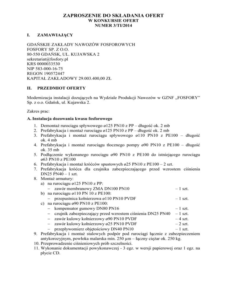 ZAPROSZENIE DO SKŁADANIA OFERT W KONKURSIE OFERT NUMER 3/TI/2014 I. ZAMAWIAJĄCY GDAŃSKIE ZAKŁADY NAWOZÓW FOSFOROWYCH FOSFORY SP. Z O.O. 80-550 GDAŃSK, UL. KUJAWSKA 2 [email protected] KRS 0000033530 NIP 583-000-16-75 REGON 190572447 KAPITAŁ ZAKŁADOWY 29.003.400,00 ZŁ II. PRZEDMIOT OFERTY Modernizacja instalacji dozujących na Wydziale Produkcji Nawozów w GZNF „FOSFORY” Sp. z o.o. Gdańsk, ul. Kujawska 2. Zakres prac: A. Instalacja dozowania kwasu fosforowego 1. DemontaŜ rurociągu spływowego ø125 PN10 z PP – długość ok. 2 mb 2. Prefabrykacja i montaŜ rurociągu ø125 PN10 z PP – długość ok. 2 mb 3. Prefabrykacja i montaŜ rurociągu spływowego ø110 PN10 z PE100 – długość ok. 4 mb 4. Prefabrykacja i montaŜ rurociągu tłocznego pompy ø90 PN10 z PE100 – długość ok. 35 mb 5. Podłączenie wykonanego rurociągu ø90 PN10 z PE100 do istniejącego rurociągu ø63 PN10 z PE100 6. Prefabrykacja i montaŜ króćców spustowych ø25 PN10 z PE100 – 2 szt. 7. Prefabrykacja króćca dla czujnika zabezpieczającego przed wzrostem ciśnienia DN25 PN40 – 1 szt. 8. MontaŜ armatury: a) na rurociągu ø125 PN10 z PP: − zawór membranowy ZMA DN100 PN10 – 1 szt. b) na rurociągu ø110 PN 10 z PE100: − przepustnica kołnierzowa ø110 PN10 PVDF – 1 szt. c) na rurociągu ø90 PN10 z PE100: − kompensator gumowy DN80 PN16 – 1 szt. − czujnik zabezpieczający przed wzrostem ciśnienia DN25 PN40 – 1 szt. − zawór kulowy kołnierzowy ø90 PN10 PVDF – 4 szt. − zawór kulowy kołnierzowy ø25 PN10 PVDF – 2 szt. − przepływomierz objętościowy DN40 PN10 – 1 szt. 9. Prefabrykacja i montaŜ stalowych podpór pod rurociągi łącznie z zabezpieczeniem antykorozyjnym, powłoka malarska min. 250 µm – łączny cięŜar ok. 250 kg. 10. Przeprowadzenie ciśnieniowych prób szczelności. 11. Wykonanie dokumentacji powykonawczej - 3 egz. w wersji papierowej oraz 1 egz. na płycie CD. B. Instalacja dozowania ścieków technologicznych do reaktora na ciągu „X” 1. Prefabrykacja i montaŜ rurociągu ø63 PN10 z PP – długość ok. 60 mb 2. MontaŜ armatury: a) na rurociągu ø63 PN10 z PP: − zawór membranowy ZMA DN50 PN10 – 1 szt. − przepływomierz objętościowy DN40 PN10 – 1 szt. − zawór automatyczny DN50 PN10 – 1 szt. b) na istniejącym rurociągu ø125 PN10 z PP: − zawór membranowy ZMA DN125 PN10 – 1 szt. 3. Prefabrykacja i montaŜ stalowych podpór pod rurociągi łącznie z zabezpieczeniem antykorozyjnym, powłoka malarska min. 250 µm – łączny cięŜar ok. 250 kg 4. Przeprowadzenie ciśnieniowych prób szczelności. 5. Wykonanie dokumentacji powykonawczej - 3 egz. w wersji papierowej oraz 1 egz. na płycie CD. C. Instalacja dozowania ścieków technologicznych do reaktora na ciągu "Y" 1. Prefabrykacja i montaŜ rurociągu ø63 PN10 z PP – długość ok. 15 mb 2. MontaŜ armatury: a) na rurociągu ø63 PN10 z PP: − zawór membranowy ZMA DN50 PN10 – 1 szt. − przepływomierz objętościowy DN40 PN10 – 1 szt. − zawór automatyczny DN50 PN10 – 1 szt. b) na istniejącym rurociągu ø125 PN10 z PP: − zawór membranowy ZMA DN125 PN10 – 1 szt. 3. Prefabrykacja i montaŜ stalowych podpór pod rurociągi łącznie z zabezpieczeniem antykorozyjnym, powłoka malarska min. 250 µm – łączny cięŜar ok. 150 kg 4. Przeprowadzenie ciśnieniowych prób szczelności. 5. Wykonanie dokumentacji powykonawczej - 3 egz. w wersji papierowej oraz 1 egz. na płycie CD. D. Instalacja dozowania siarczanu amonu 1. 2. 3. 4. DemontaŜ rurociągu spływowego ø225 PN10 z PE – długość ok. 3 mb DemontaŜ rurociągu tłocznego ø125 PN10 z PE – długość ok. 3 mb Prefabrykacja i montaŜ rurociągu ø225 PN10 z PP – długość ok. 2 mb Prefabrykacja i montaŜ rurociągu spływowego pompy ø125 PN10 z PP – długość ok. 10 mb 5. Prefabrykacja i montaŜ rurociągów tłocznych z pomp ø125 PN10 z PP – łączna długość ok. 20 mb 6. Prefabrykacja i montaŜ rurociągu tłocznego od zbiornika ekspedycyjnego do istniejącego rurociągu ø125 PN10 z PP – długość ok. 3 mb 7. Modernizacja rurociągu ø180 PN10 z PP – długość ok. 2 mb 8. Modernizacja istniejącego rurociągu ø90 PN10 z PP w sposób umoŜliwiający zamontowanie przepływomierza DN50 PN10 - długość ok. 2 mb 9. Modernizacja istniejącego rurociągu ø 90 PN10 z PE100 w sposób umoŜliwiający zamontowanie przepływomierza DN50 PN10 - długość ok. 2 mb 10. Prefabrykacja i montaŜ króćców spustowych ø63 PN10 z PP – 2 szt. 11. Prefabrykacja i montaŜ króćców do wody i spręŜonego powietrza ø50 PN10 z PP – 2 szt. 12. Prefabrykacja i montaŜ króćca ø90 PN10 z PP – 1 szt. 13. MontaŜ armatury: a) na rurociągu spływowym ø225 PN10 z PP: − zasuwa międzykołnierzowa DN 200 PN10 – 1 szt. − zawór membranowy ZMA DN80 PN10 z zaślepką – 1 szt. − zawór kulowy k.o. DN40 PN10 z zaślepką – 1 szt. − zawór membranowy ZMA DN40 PN10 z zaślepką – 1 szt. b) na rurociągu spływowym ø125 PN 10 z PP: − zawór membranowy ZMA DN100 PN10 – 3 szt. − zawór automatyczny DN 100 PN 10 – 1 szt. c) na rurociągach tłocznych ø125 PN10 z PP: − zawór membranowy ZMA DN100 PN10 – 5 szt. − kompensator gumowy DN100 PN16 – 2 szt. − czujnik zabezpieczający przed wzrostem ciśnienia DN50 PN40 – 2 szt. − zawór kulowy kołnierzowy DN50 PN10 PVDF – 2 szt. d) na istniejącym rurociągu ø 90 PN10 PP: − wymiana przepływomierza objętościowego z DN80 PN10 na DN50 PN10 – 1 szt. e) na istniejącym rurociągu ø90 PN10 PE100: − wymiana przepływomierza objętościowego z DN80 PN10 na DN50 PN10 – 1 szt. 14. Prefabrykacja i montaŜ stalowych podpór pod rurociągi łącznie z zabezpieczeniem antykorozyjnym, powłoka malarska min. 250 µm - ok. 300 kg 15. Przeprowadzenie ciśnieniowych prób szczelności. 16. Wykonanie dokumentacji powykonawczej - 3 egz. w wersji papierowej oraz 1 egz. na płycie CD. Uwagi: 1. Cenę of