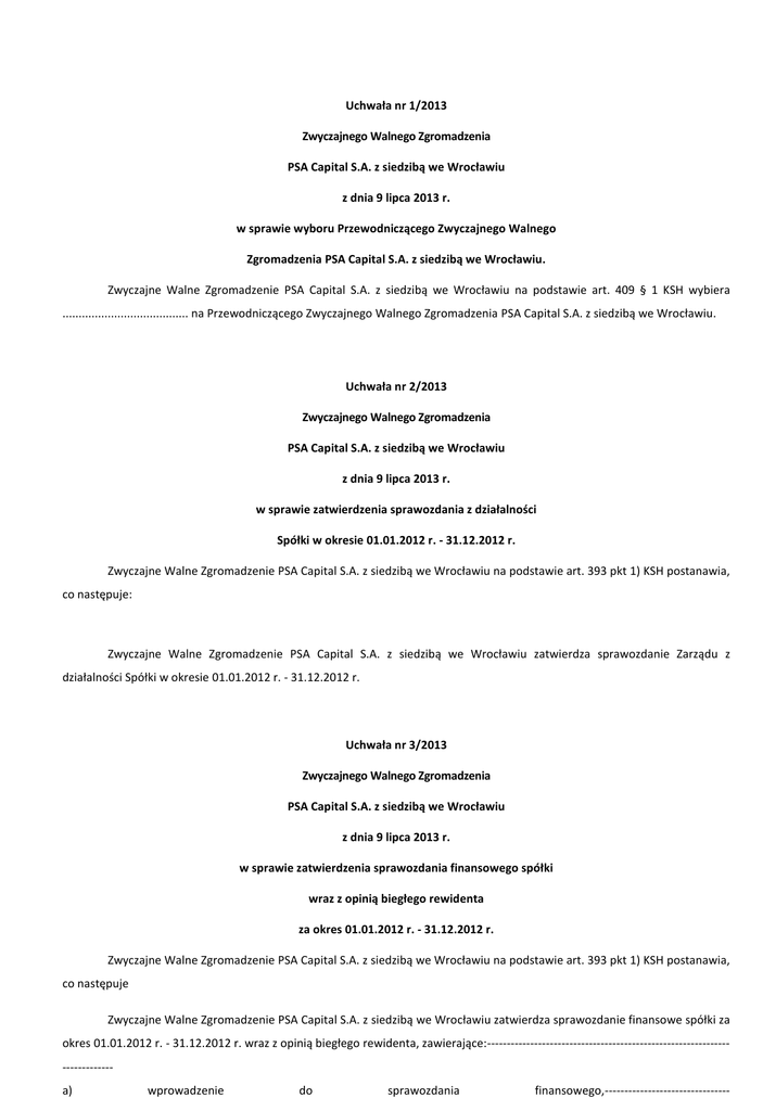 Uchwała nr 1/2013 Zwyczajnego Walnego Zgromadzenia PSA Capital S.A. z siedzibą we Wrocławiu z dnia 9 lipca 2013 r. w sprawie wyboru Przewodniczącego Zwyczajnego Walnego Zgromadzenia PSA Capital S.A. z siedzibą we Wrocławiu. Zwyczajne Walne Zgromadzenie PSA Capital S.A. z siedzibą we Wrocławiu na podstawie art. 409 § 1 KSH wybiera ....................................... na Przewodniczącego Zwyczajnego Walnego Zgromadzenia PSA Capital S.A. z siedzibą we Wrocławiu. Uchwała nr 2/2013 Zwyczajnego Walnego Zgromadzenia PSA Capital S.A. z siedzibą we Wrocławiu z dnia 9 lipca 2013 r. w sprawie zatwierdzenia sprawozdania z działalności Spółki w okresie 01.01.2012 r. - 31.12.2012 r. Zwyczajne Walne Zgromadzenie PSA Capital S.A. z siedzibą we Wrocławiu na podstawie art. 393 pkt 1) KSH postanawia, co następuje: Zwyczajne Walne Zgromadzenie PSA Capital S.A. z siedzibą we Wrocławiu zatwierdza sprawozdanie Zarządu z działalności Spółki w okresie 01.01.2012 r. - 31.12.2012 r. Uchwała nr 3/2013 Zwyczajnego Walnego Zgromadzenia PSA Capital S.A. z siedzibą we Wrocławiu z dnia 9 lipca 2013 r. w sprawie zatwierdzenia sprawozdania finansowego spółki wraz z opinią biegłego rewidenta za okres 01.01.2012 r. - 31.12.2012 r. Zwyczajne Walne Zgromadzenie PSA Capital S.A. z siedzibą we Wrocławiu na podstawie art. 393 pkt 1) KSH postanawia, co następuje Zwyczajne Walne Zgromadzenie PSA Capital S.A. z siedzibą we Wrocławiu zatwierdza sprawozdanie finansowe spółki za okres 01.01.2012 r. - 31.12.2012 r. wraz z opinią biegłego rewidenta, zawierające:-------------------------------------------------------------------------a) wprowadzenie do sprawozdania finansowego,-------------------------------- b) bilans sporządzony na dzień 31.12.2012 r., który po stronie aktywów i pasywów wykazuje sumę 6.141.107,03 zł (sześć milionów sto czterdzieści jeden tysięcy sto siedem złotych i trzy grosze),---------c) rachunek zysków i strat za okres od 01.01.2012 do 31.12.2012 r., wykazujący stratę netto w wysokości 511.162,84 zł (pięciuset jedenastu tysięcy stu sześćdziesięciu dwóch złotych I osiemdziesięciu d) czterech zestawienia 31.12.2012 zmian w r., kapitale wykazujące własnym groszy),---------za zwiększenie okres od kapitału 01.01.2012 własnego r. o do kwotę 5.288.837,16 zł (pięciu milionów dwustu osiemdziesięciu ośmiu tysięcy ośmiuset trzydziestu siedmiu złotych i szesnastu groszy),------------------------------------------------------e) rachunek 31.12.2012 przepływów r., pieniężnych wykazujący za zmniejszenie okres od stanu 01.01.2012 r. do środków pieniężnych w okresie od 01.01.2012 do 31.12.2012 o kwotę 2498.99 zł (dwóc tysięcy czterystu dziewięćdziesięciu ośmiu złotych i dziewięćdziesięciu dziewięciu groszy),---------------------------------------------------------------------------- f) dodatkowe informacje i objaśnienia.-------------------------------------------- Uchwała nr 4/2013 Zwyczajnego Walnego Zgromadzenia PSA Capital S.A. z siedzibą we Wrocławiu z dnia 9 lipca 2013 r. w sprawie zatwierdzenia pisemnego sprawozdania Rady Nadzorczej Zwyczajne Walne Zgromadzenie PSA Capital S.A. z siedzibą we Wrocławiu na podstawie art. 382 § 3 pkt 2 KSH postanawia, co następuje:-------Zwyczajne Walne Zgromadzenie PSA Capital S.A. z siedzibą we Wrocławiu zatwierdza sprawozdanie Rady Nadzorczej za okres 01.01.2012 r. - 31.12.2012 r. z wyników oceny sprawozdania finansowego i sprawozdania Zarządu oraz oceny wniosków Zarządu dotyczących pokrycia straty z okresu 01.01.2012 r. - 31.12.2012 r.------------------------------------------- Uchwała nr 5/2013 Zwyczajnego Walnego Zgromadzenia PSA Capital S.A. z siedzibą we Wrocławiu z dnia 9 lipca 2013 r. w sprawie pokrycia straty za okres 01.01.2012 r. - 31.12.2012 r. Zwyczajne Walne Zgromadzenie PSA Capital S.A. z siedzibą we Wrocławiu na podstawie art. 395 § 2 pkt 2 KSH postanawia stratę netto w kwocie 511.162,84 zł (pięciuset jedenastu tysięcy stu sześćdziesięciu dwóch złotych i osiemdziesięciu czterech groszy) pokryć w następujący sposób: ------- Uchwała nr 6/2013 Zwyczajnego Walnego Zgromadzenia PSA Capital S.A. z siedzibą we Wrocławiu z dnia 9 lipca 2013 r. w sprawie udzielenia absolutorium Prezesowi Zarządu - Panu Piotrowi Surmackiemu Zwyczajne Walne Zgromadzenie PSA Capital S.A. z siedzibą we Wrocławiu na podstawie art. 393 pkt 1 KSH postanawia, co następuje:-----------Zwyczajne Walne Zgromadzenie PSA Capital S.A. z siedzibą we Wrocławiu postanawia udzielić absolutorium z wykonania obowiązków za okres od 01.01.2012 r. - 27.09.2012 r. Prezesowi Zarządu - Panu Piotrowi Surmackiemu. Uchwała nr 7/2013 Zwyczajnego Walnego Zgromadzenia PSA Capital S.A. z siedzibą we Wrocławiu z dnia 9 lipca 2013 r. w sprawie udzielenia absolutorium Prezesowi Zarządu – Panu Krzysztofowi Kozak. Zwyczajne Walne Zgromadzenie PSA Capital S.A. z siedzibą we Wrocławiu na podstawie art. 393 pkt 1 KSH postanawia, co następuje:-------Zwyczajne Walne Zgromadzenie PSA Capital S.A. z siedzibą we Wrocławiu postanawia udzielić absolutorium z wykonania obowiązków za okres od 27.09.2012 r. - 31.12.2012 Prezesowi Zarządu – Panu Krzysztofowi Kozak. Uchwała nr 8/2013 Zwyczajnego Walnego Zgromadzenia PSA Capital S.A. z siedzibą we Wrocławiu z dnia 9 lipca 2013 r. w sprawie udzielenia absolutorium Członkowi Rady Nadzorczej – Panu Arturowi Surmackiemu Zwyczajne Walne Zgromadzenie PSA Capital S.A. z siedzibą we Wrocławiu na podstawie art. 393 pkt 1 KSH postanawia, co następuje:-----------Zwyczajne Walne Zgromadzenie PSA Capital S.A. z siedzibą we Wrocławiu postanawia udzielić absolutorium z wykonania obowiązków za okres 01.01.2012 r. - 17.09.2012 r. członkowi Rady Nadzorczej – Panu Arturowi Surmackiemu. Uchwała nr 9/2013 Zwyczajnego Walnego Zgromadzenia PSA Capital S.A. z siedzibą we Wrocławiu z dnia 9 lipca 2013 r. w sprawie udzielenia absolutorium Cz
