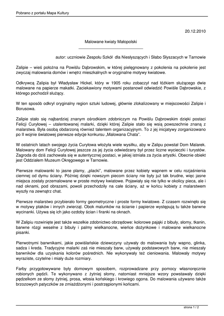 Pobrano z portalu Mapa Kultury 20.12.2010 Malowane kwiaty Małopolski ____________________________ autor: uczniowie Zespołu Szkół dla Niesłyszących i Słabo Słyszacych w Tarnowie Zalipie – wieś położna na Powiślu Dąbrowskim, w której pielęgnowany z pokolenia na pokolenie jest zwyczaj malowania domów i wnętrz mieszkalnych w oryginalne motywy kwiatowe. Odkrywcą Zalipia był Władysław Hickel, który w 1905 roku zobaczył nad łóżkiem służącego dwie malowane na papierze makatki. Zaciekawiony motywami postanowił odwiedzić Powiśle Dąbrowskie, z którego pochodził służący. W ten sposób odkrył oryginalny region sztuki ludowej, głównie zlokalizowany w miejscowości Zalipie i Borusowa. Zalipie stało się najbardziej znanym ośrodkiem zdobniczym na Powiślu Dąbrowskim dzięki postaci Felicji Curyłowej – utalentowanej malarki, dzięki której Zalipie stało się wsią powszechnie znaną z malarstwa. Była osobą obdarzoną również talentem organizacyjnym. To z jej inicjatywy zorganizowano po II wojnie światowej pierwsze edycje konkursu „Malowana Chata”. W ostatnich latach swojego życia Curyłowa włożyła wiele wysiłku, aby w Zalipu powstał Dom Malarek. Malowany dom Felicji Curyłowej jeszcze za jej życia odwiedzany był przez liczne wycieczki i turystów. Zagroda do dziś zachowała się w autentycznej postaci, w jakiej istniała za życia artystki. Obecnie obiekt jest Oddziałem Muzeum Okręgowego w Tarnowie. Pierwsze malowanki to jasne plamy, „placki”, malowane przez kobiety wapnem w celu rozjaśnienia ciemnej od dymu ściany. Później dzięki nowszym piecom ściany nie były już tak brudne, więc jasne miejsca zostały przemalowane w proste motywy kwiatowe. Pojawiały się nie tylko w okolicy pieca, ale i nad oknami, pod obrazami, powoli przechodziły na całe ściany, aż w końcu kobiety z malarstwem wyszły na zewnątrz chat. Pierwsze malarstwo przybierało formy geometryczne i proste formy kwiatowe. Z czasem rozwinęło się w motywy ptaków i innych zwierząt. Obok malunków na ścianie i papierze występują tu także barwne wycinanki. Używa się ich jako ozdoby ścian i firanki na oknach. W Zalipiu rozwinięte jest także wszelkie zdobnictwo obrzędowe: kolorowe pająki z bibuły, słomy, tkanin, barwne rózgi weselne z bibuły i palmy wielkanocne, wieńce dożynkowe i malowane wielkanocne pisanki. Pierwotnymi barwnikami, jakie powiślańskie dziewczyny używały do malowania były wapno, glinka, sadza i kreda. Tradycyjne malarki zaś nie mieszały barw, używały podstawowych barw, nie mieszały barwników dla uzyskania kolorów pośrednich. Nie wykonywały też cieniowania. Malowały motywy wyraziste, czytelne i miały duże rozmiary. Farby przygotowywane były domowym sposobem, rozprowadzane przy pomocy własnoręcznie robionych pędzli. Te wykonywano z żytniej słomy, natomiast mniejsze wzory powstawały dzięki pędzelkom ze słomy żytniej, prosa, włosia końskiego i krowiego ogona. Do malowania używano także brzozowych patyczków ze zmiażdżonymi i postrzępionymi końcami. strona 1 / 2 Pobrano z portalu Mapa Kultury strona 2 / 2