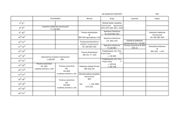 ` rok akademicki 2016/2017 Poniedziałek 30 15 15 00 Wtorek Inżynieria reaktorów chemicznych P s 133 30I1 915-1000 00 45 00 45 45 30 45 30 Procesy destylacyjne W 30I1 32I1 tyg nieparzy s.110 10 -10 Procesy przenoszenia w układach rozproszonych W s.202 30I1 32I1 11 -11 11 -12 12 -13 1330-1415 30 15 15 00 15 00 00 45 14 -15 15 -16 16 -17 17 -17 1800-1845 45 30 45 30 30 15 18 -19 19 -20 20 -21 Procesy destylacyjne 30I1 Ćw + P s110 Laboratorium inżynierii chemicznej II s.129/229 30I1 Procesy suszarnicze Ćw. 30I1 I połowa semestru s.135 Procesy suszarnicze lab. GrA 30I1 II połowa semestru s.131 Procesy suszarnicze lab. GrB 30I1 II połowa semestru s.131 Czwartek Piątek Metody badań związków chemicznych tyg parzyste 34T1-35T1 30I1 32I1 s. 0/19 7 -8 8 -9 Środa 30I1 Podstawy reologii W+Lab 30I1 32I1 227 Metody badania związków chemicznych 30I1 Lab. s. 110, 303a, 517a, 621 Aparatura chemiczna W s 0/19 30I1 32I1 Aparatura chemiczna Ćw 30I1 s110 Aparatura chemiczna P s110 30I1 Projektowanie inst. Proc. Przem.chem W+S s. 135 30I1 Projektowanie inst. Proc. Przem.chem P s. 224 GrA s. 226 GrB Inżynieria reaktorów chemicznych W s.202 30I1 32I2 Inżynieria reaktorów chemicznych Ćw s 110 30I1 Procesy suszarnicze W 30I1 32I1 s3 Statystyka praktyczna W 30I1 32I1 s.134 WIiTCh rok akademicki 2016/2017 Poniedziałek 30 00 8 -9 915-1000 Aparatura chemiczna Ćw 32I1 s134 Metody badań związków chemicznych tyg parzyste 34T1-35T1 30I1 32I1 s. 0/19 00 45 00 45 45 30 Procesy destylacyjne W 30I1 32I1 tyg nieparzy s.110 10 -10 11 -11 11 -12 45 Środa 15 7 -8 15 Wtorek 30 12 -13 1330-1415 30 15 15 00 15 00 00 45 14 -15 Aparatura chemiczna P s110 32I1 Laboratorium inżynierii chemicznej II s.129/229 32I1 Instalacje z OZE P s226 32I1 15 -16 1800-1845 45 30 45 30 30 15 18 -19 19 -20 20 -21 Procesy suszarnicze Ćw. 32I1 I połowa semestru s.135 Czwartek Aparatura chemiczna W s 0/19 30I1 32I1 W Instalacje z OZE I poł sem s3 32I1 Instalacje z OZE S s224 32I1 Metody badania związków chemicznych 32I1 Lab. s. 134, 303a, 517a, 621 Piątek Inżynieria reaktorów chemicznych W s.202 30I1 32I2 Procesy suszarnicze W 30I1 32I1 s3 Procesy destylacyjne 32I1 Ćw + P s110 Podstawy reologii W+Lab 30I1 32I1 227 16 -17 17 -17 Procesy przenoszenia w układach rozproszonych W s.202 30I1 32I1 32I1 Procesy suszarnicze lab. GrA 32I1 II połowa semestru s.131 Procesy suszarnicze lab. GrB 32I1 II połowa semestru s.131 Statystyka praktyczna W 30I1 32I1 s.134 Inżynieria reaktorów chemicznych Ćw+P s.110 32I1