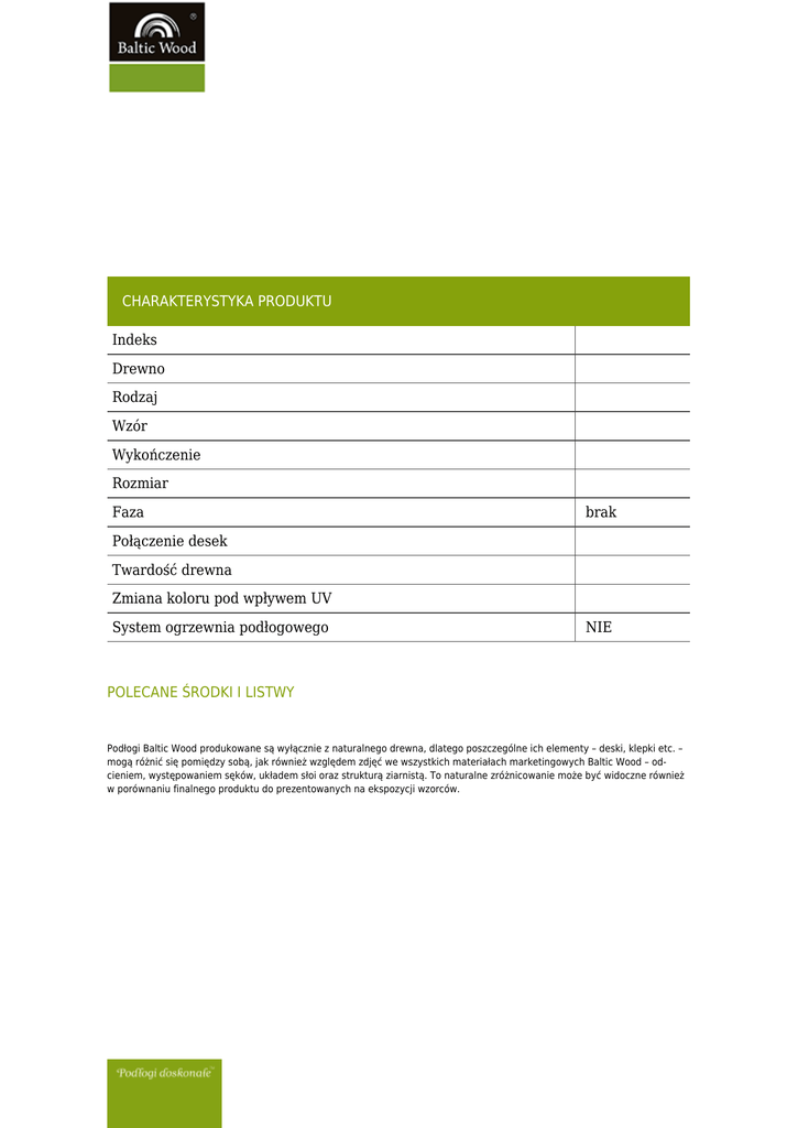 CHARAKTERYSTYKA PRODUKTU Indeks Drewno Rodzaj Wzór Wykończenie Rozmiar Faza brak Połączenie desek Twardość drewna Zmiana koloru pod wpływem UV System ogrzewnia podłogowego NIE POLECANE ŚRODKI I LISTWY Podłogi Baltic Wood produkowane są wyłącznie z naturalnego drewna, dlatego poszczególne ich elementy – deski, klepki etc. – mogą różnić się pomiędzy sobą, jak również względem zdjęć we wszystkich materiałach marketingowych Baltic Wood – odcieniem, występowaniem sęków, układem słoi oraz strukturą ziarnistą. To naturalne zróżnicowanie może być widoczne również w porównaniu finalnego produktu do prezentowanych na ekspozycji wzorców.