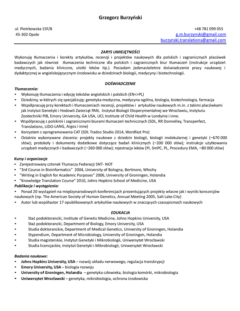 Grzegorz Burzyński ul. Piotrkowska 15F/8 45-302 Opole +48 781 099 055 [email protected] [email protected] ZARYS UMIEJĘTNOŚCI Wykonuję tłumaczenia i korekty artykułów, recenzji i projektów naukowych dla polskich i zagranicznych placówek badawczych jak również tłumaczenia techniczne dla polskich i zagranicznych biur tłumaczeń (instrukcje urządzeń medycznych, badania kliniczne, ulotki leków itp.). Posiadam jedenastoletnie doświadczenie pracy naukowej i dydaktycznej w angielskojęzycznym środowisku w dziedzinach biologii, medycyny i biotechnologii. DOŚWIADCZENIE Tłumaczenia: • Wykonuję tłumaczenia i edycję tekstów angielskich i polskich (EN<>PL) • Dziedziny, w których się specjalizuję: genetyka medyczna, medycyna ogólna, biologia, biotechnologia, farmacja • Współpracuję przy korektach i tłumaczeniach recenzji, projektów i artykułów naukowych m.in. z takimi placówkami jak Instytut Genetyki i Hodowli Zwierząt PAN, Instytut Biologii Eksperymentalnej we Wrocławiu, Instytutu Zootechniki PIB, Emory University, GA USA, UCL Institute of Child Health w Londynie i inne. • Współpracuję z polskimi i zagranicznymi biurami tłumaczeń technicznych (SDL, RR Donnelley, Transperfect, Translations, LIDO-LANG, Argos i inne) • Korzystam z oprogramowania CAT (SDL Trados Studio 2014, Wordfast Pro) • Ostatnio wykonywane zlecenia: projekty naukowe z dziedzin biologii, biologii molekularnej i genetyki (~670 000 słów); protokoły i dokumenty dodatkowe dotyczące badań klinicznych (~200 000 słów); instrukcje użytkowania urządzeń medycznych i badawczych (~260 000 słów); rejestracja leków (PI, SmPC, PL, Procedury EMA, ~80 000 słów) Kursy i organizacje • Zarejestrowany członek Tłumaczy Federacji SNT- NOT • "3rd Course in Bioinformatics" 2004, University of Bologna, Bertinoro, Włochy • "Writing in English for Academic Purposes" 2006, University of Groningen, Holandia • "Knowledge Translation Course" 2010, Johns Hopkins School of Medicine, USA Publikacje i wystąpienia: • Ponad 20 wystąpień na międzynarodowych konferencjach prezentujących projekty własne jak i wyniki konsorcjów naukowych (np. The American Society of Human Genetics, Annual Meeting 2005, Salt Lake City) • Autor lub współautor 17 opublikowanych artykułów naukowych w znaczących czasopismach naukowych • • • • • • EDUKACJA Staż podoktorancki, Institute of Genetic Medicine, Johns Hopkins University, USA Staż podoktorancki, Department of Biology, Emory University, USA Studia doktoranckie, Department of Medical Genetics, University of Groningen, Holandia Stypendium, Department of Microbiology, University of Groningen, Holandia Studia magisterskie, Instytut Genetyki i Mikrobiologii, Uniwersytet Wrocławski Studia licencjackie, Instytut Genetyki i Mikrobiologii, Uniwersytet Wrocławski Badania naukowe: • Johns Hopkins University, USA – rozwój układu nerwowego, regulacja transkrypcji • Emory University, USA – biologia rozwoju • University of Groningen, Holandia – genetyka człowieka, biologia komórki, mikrobiologia • Uniwersytet Wrocławski – genetyka, mikrobiologia, ochrona środowiska