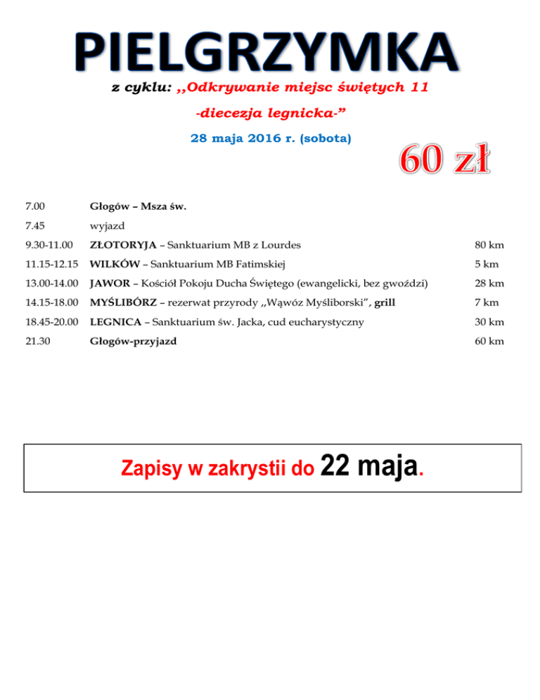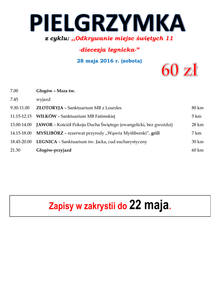 z cyklu: ,,Odkrywanie miejsc świętych 11 -diecezja legnicka-” 28 maja 2016 r. (sobota) 7.00 Głogów – Msza św. 7.45 wyjazd 9.30-11.00 ZŁOTORYJA – Sanktuarium MB z Lourdes 80 km 11.15-12.15 WILKÓW – Sanktuarium MB Fatimskiej 5 km 13.00-14.00 JAWOR – Kościół Pokoju Ducha Świętego (ewangelicki, bez gwoździ) 28 km 14.15-18.00 MYŚLIBÓRZ – rezerwat przyrody ,,Wąwóz Myśliborski”, grill 7 km 18.45-20.00 LEGNICA – Sanktuarium św. Jacka, cud eucharystyczny 30 km 21.30 Głogów-przyjazd 60 km Zapisy w zakrystii do 22 maja.